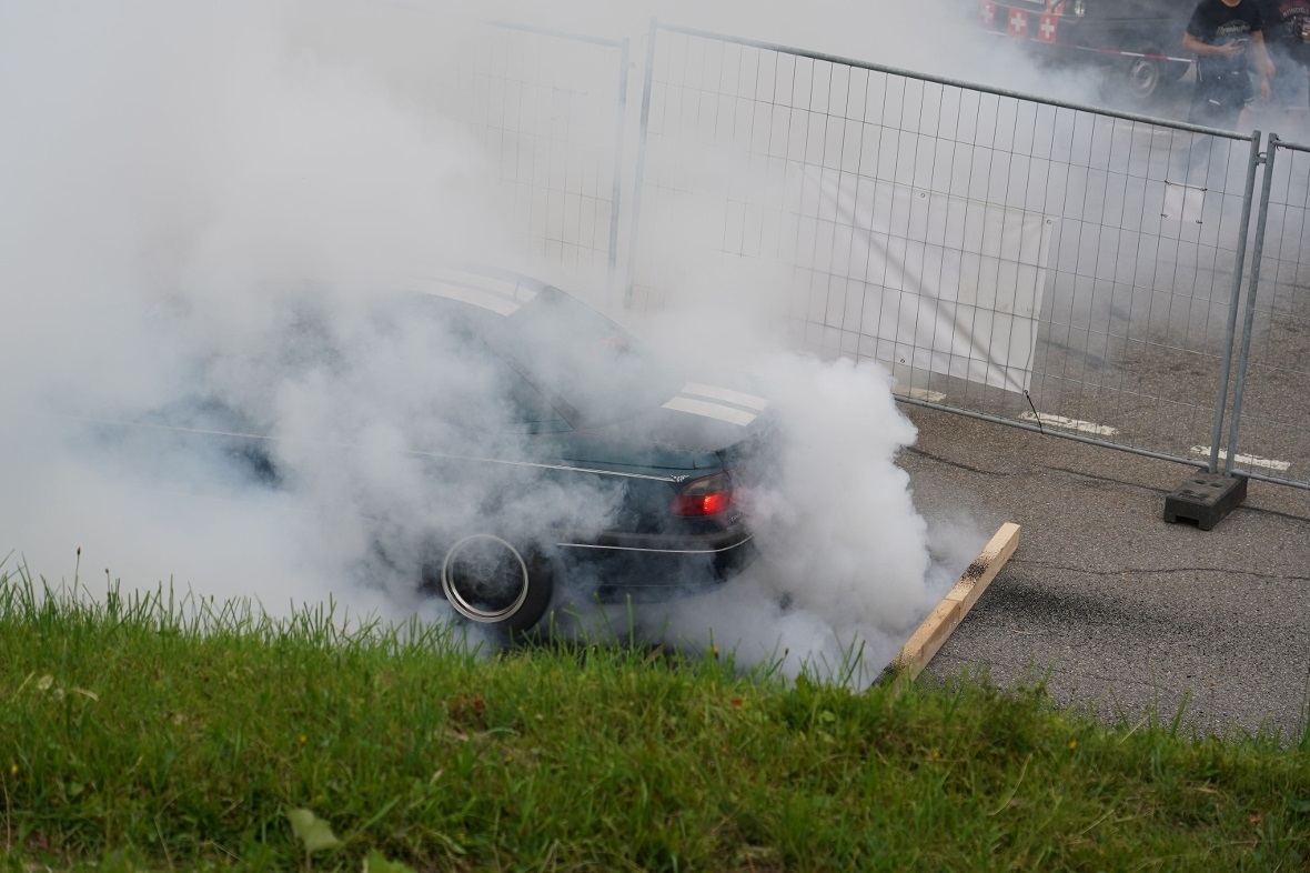 Die Sinnfrage zu stellen, wäre verfehlt: «Lärm & unvernünftiger Schwachsinn» lassen wenig Spielraum für tiefschürfende Gedanken. Und so heizte eine Dreiergruppe von Motorrad-Piloten mit gezogener Vorderradbremse und beherzt gedrehtem Gasgriff eine Runde Hinterreifen auf dem Asphalt weg bis die Felgen Funken sprühten – was freilich im dichten Gummi-Rauch kaum noch zu erkennen war. Ein Schauspiel, das sich in der Folge noch mehrfach und in Variationen wiederholen sollte.