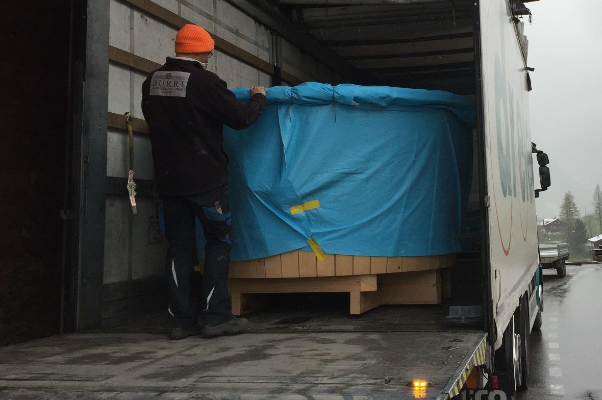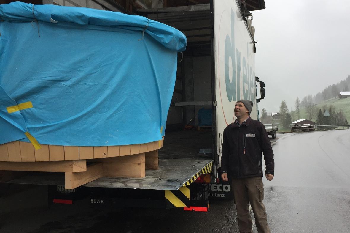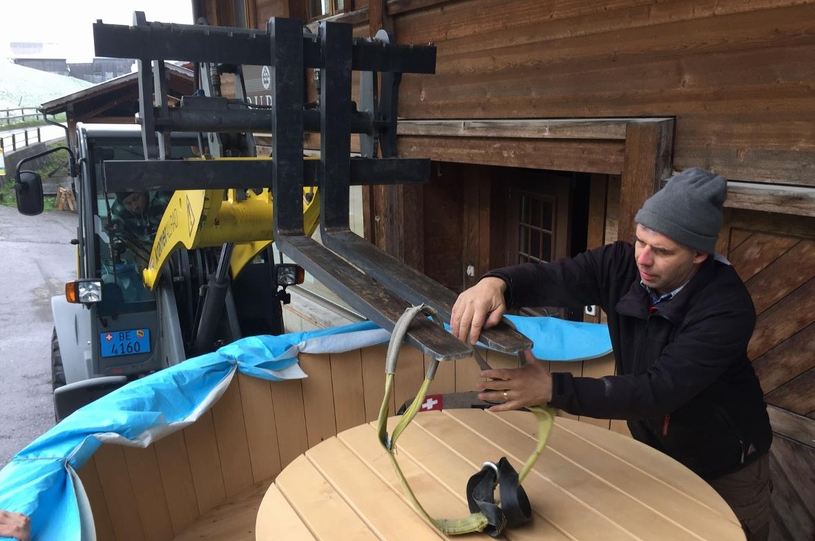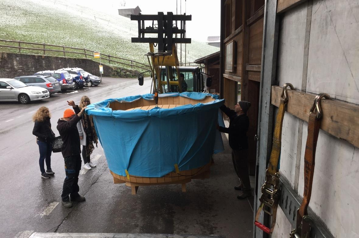 Es war ein frostiger, aber herzlicher Abschied am Donnerstag, 27. April 2017 in Lauenen: Dick eingepackt in schützende Folie trat das Riesen-Caquelon von Gstaad-Saanenland Tourismus seine Reise ins Museum Angewandte Kunst in Frankfurt am Main an. Dort bleibt es bis zum Ende der Ausstellung (6. Mai bis 17. September 2017) «Picknick-Zeit».