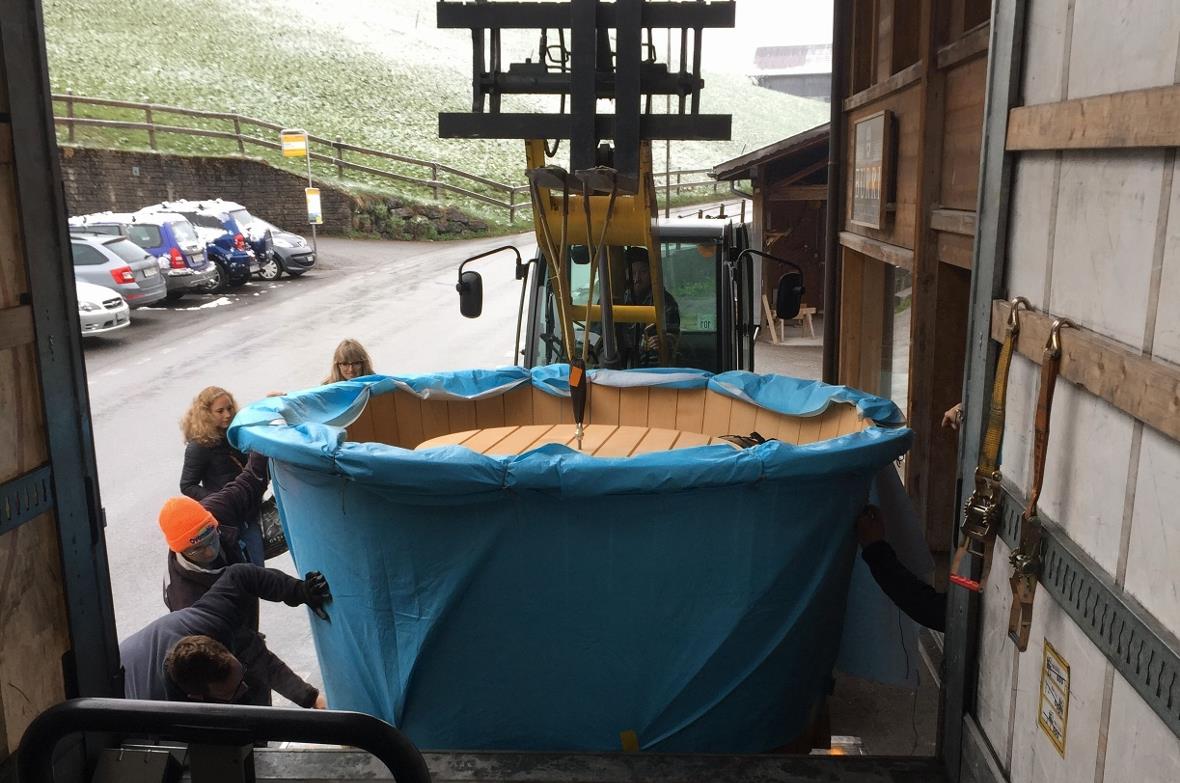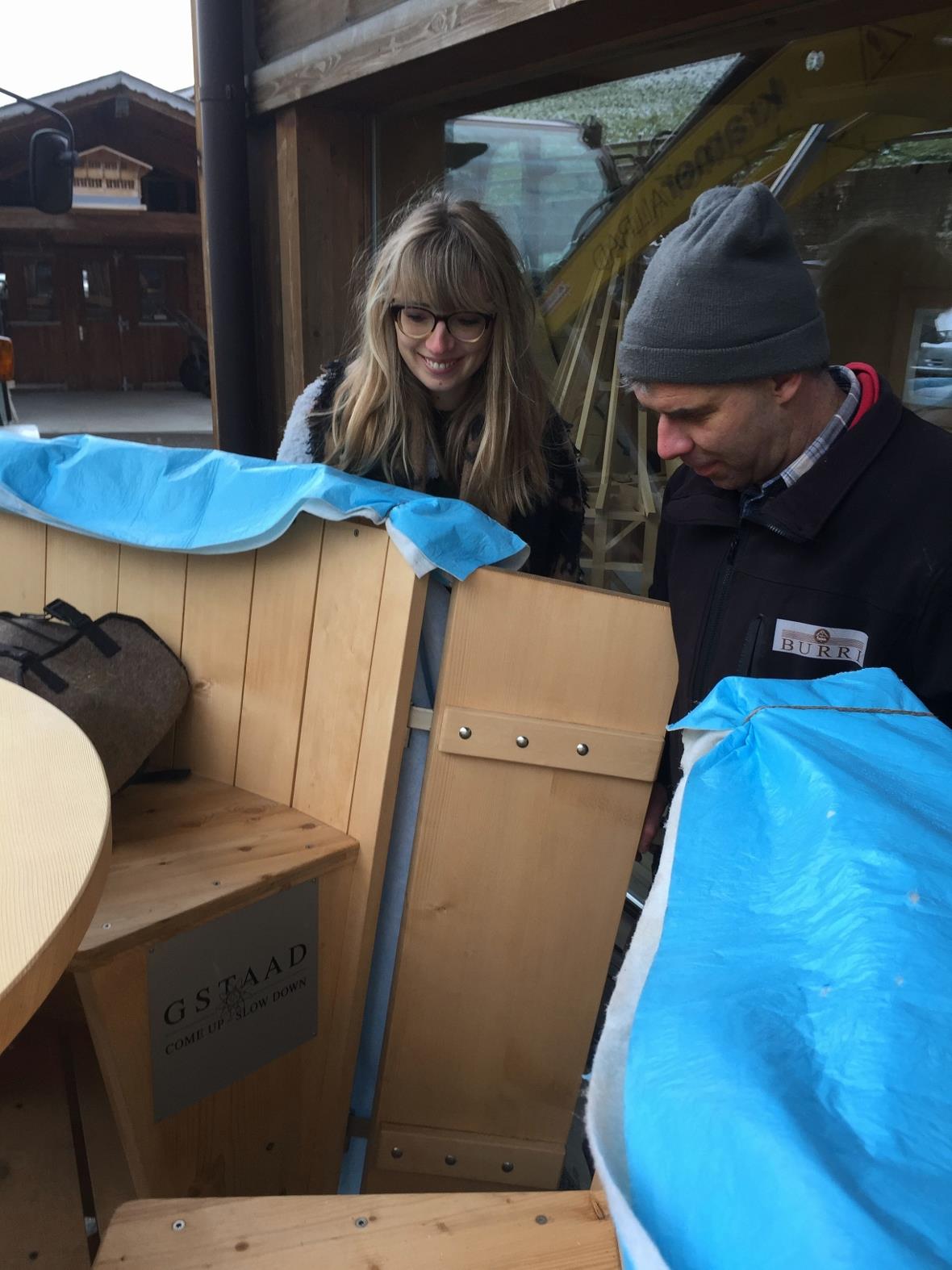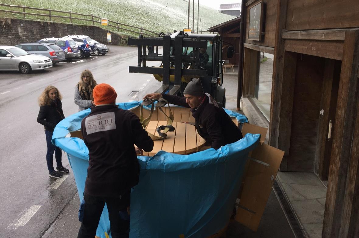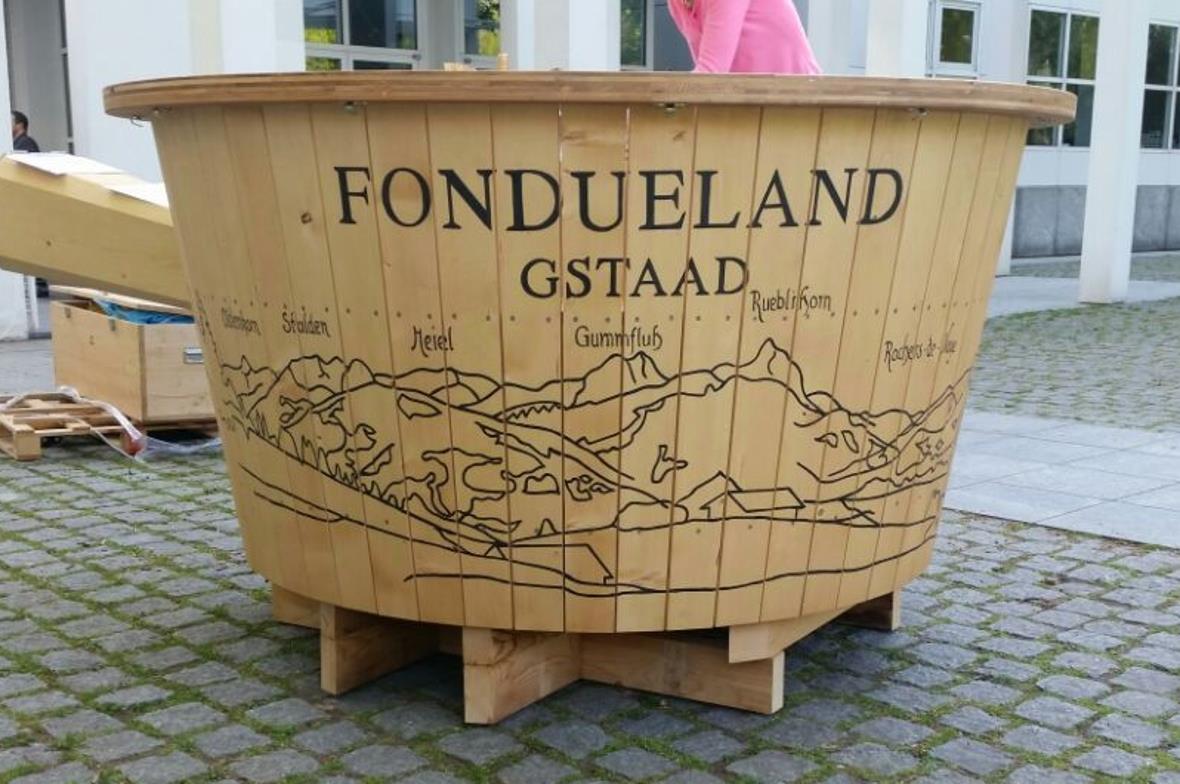 Es war ein frostiger, aber herzlicher Abschied am Donnerstag, 27. April 2017 in Lauenen: Dick eingepackt in schützende Folie trat das Riesen-Caquelon von Gstaad-Saanenland Tourismus seine Reise ins Museum Angewandte Kunst in Frankfurt am Main an. Dort bleibt es bis zum Ende der Ausstellung (6. Mai bis 17. September 2017) «Picknick-Zeit».