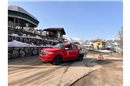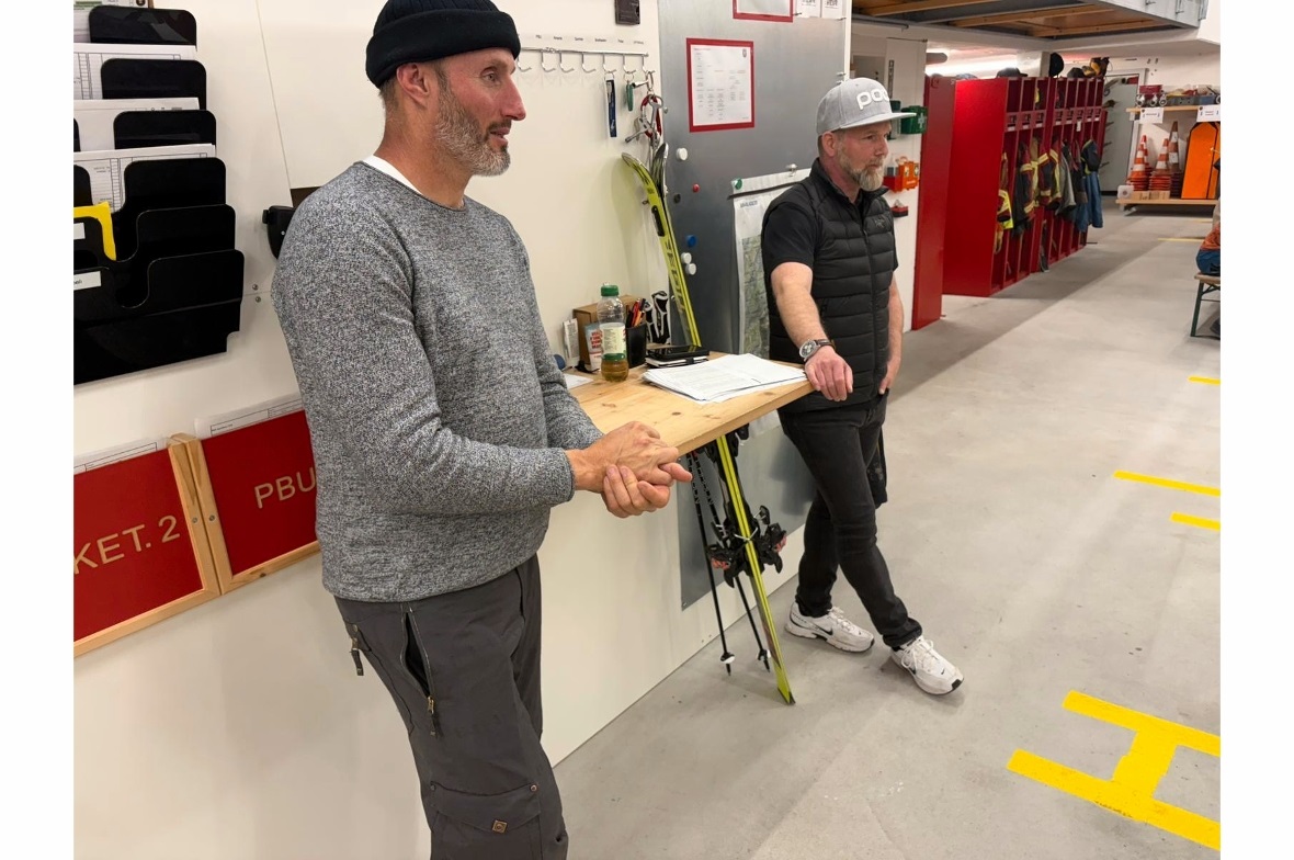 Ausgabe von Franjo von Allmen Shots zur Auflockerung vor dem Rennstart.