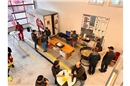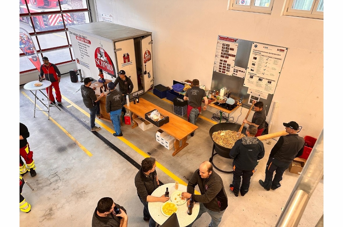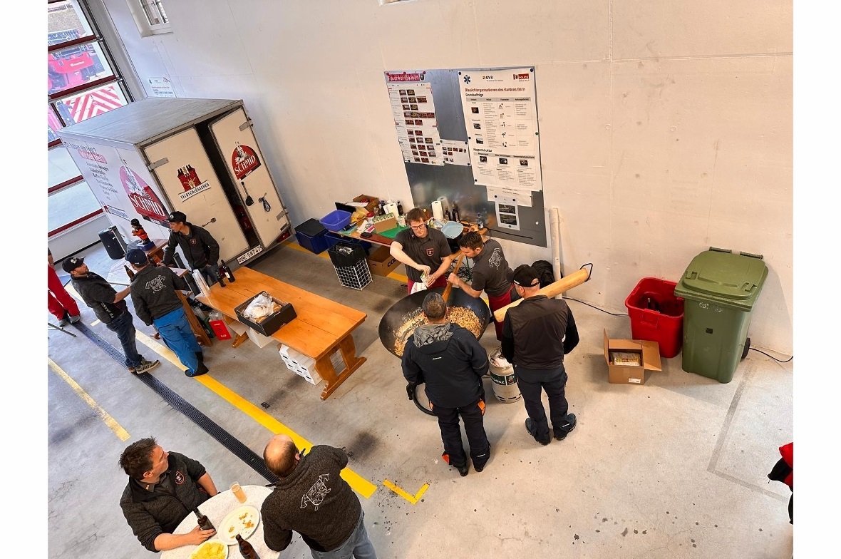 Gute Stimmung beim Nachtessen im Magazin der Feuerwehr Saanen