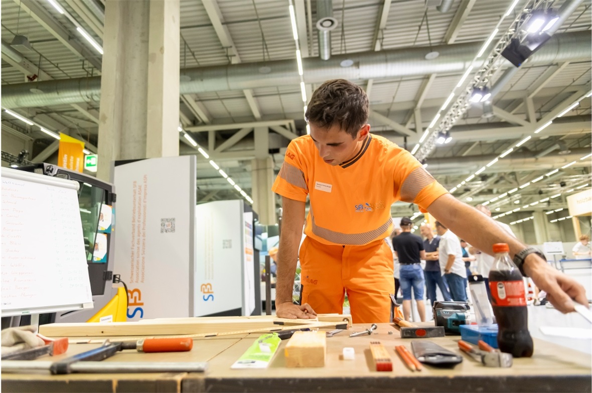 Siegerehrung der Zimmermänner: Bundesrat Guy Parmelin gratuliert Jules Honoré (Silber), Silvan Aeschlimann (Gold) und Luca Wissler (Bronze).