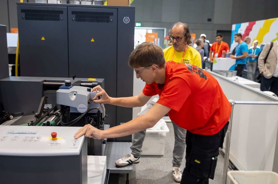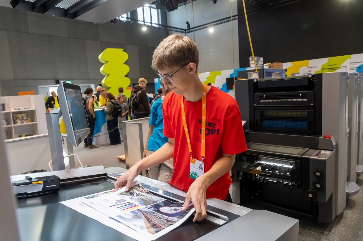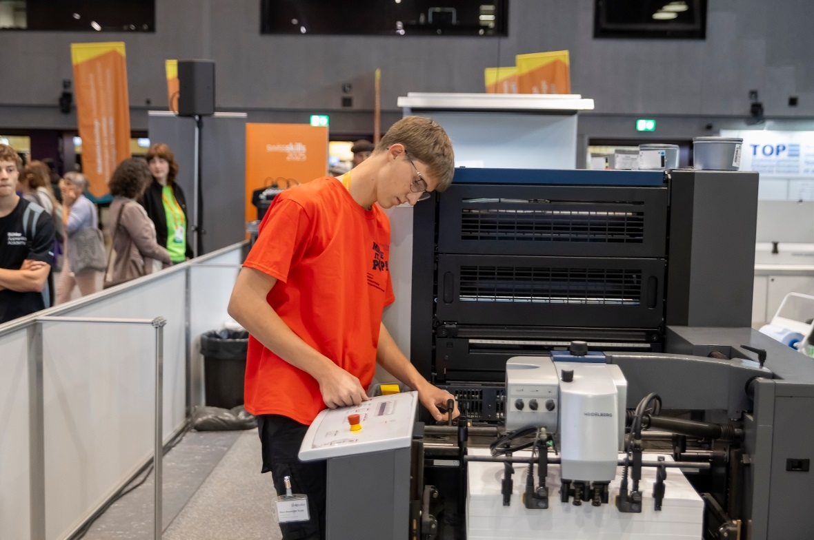 Nico Kopp vor der Offsetdruckmaschine an den SwissSkills in Bern.