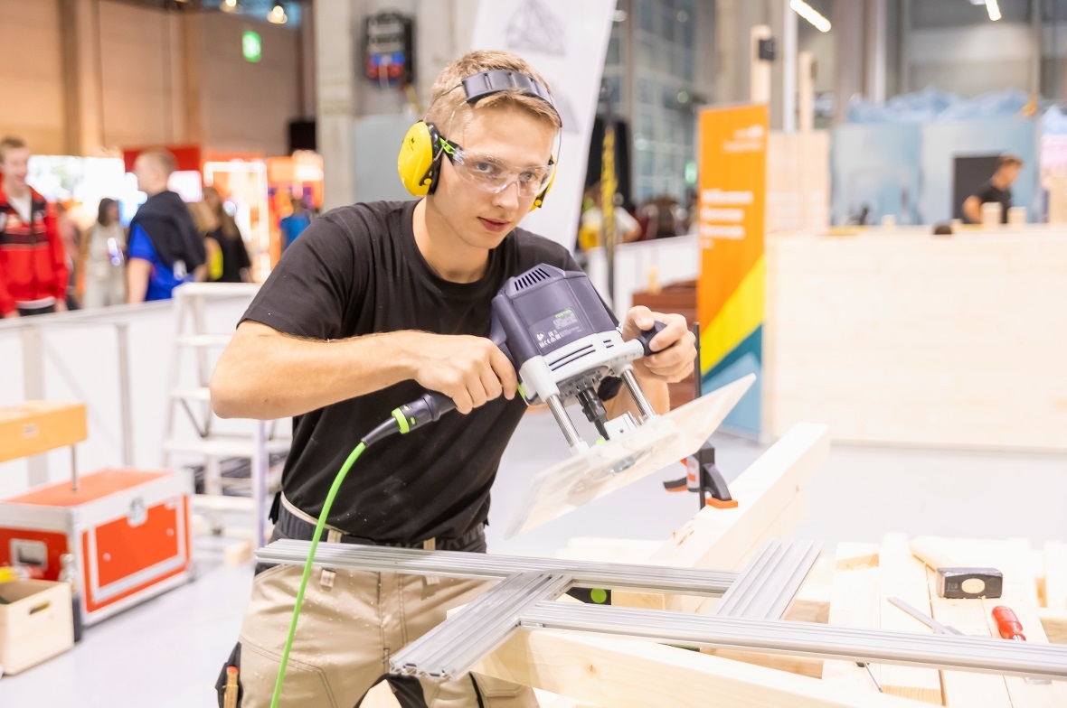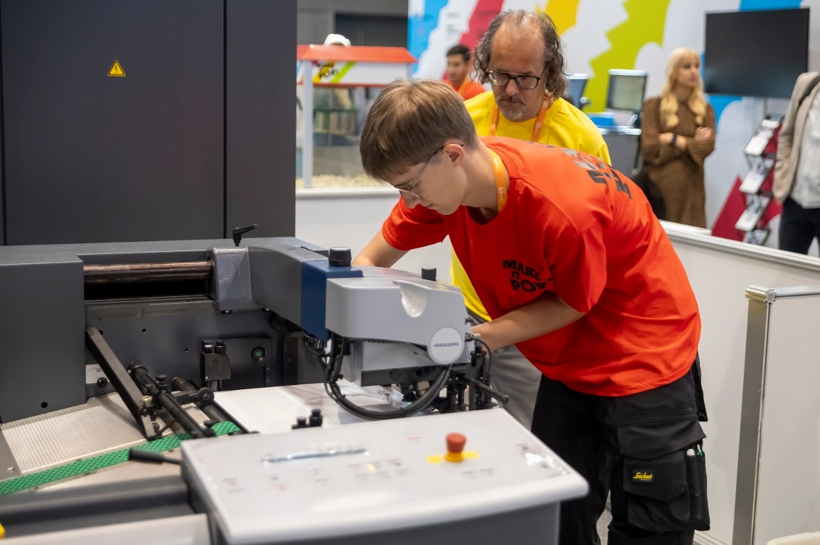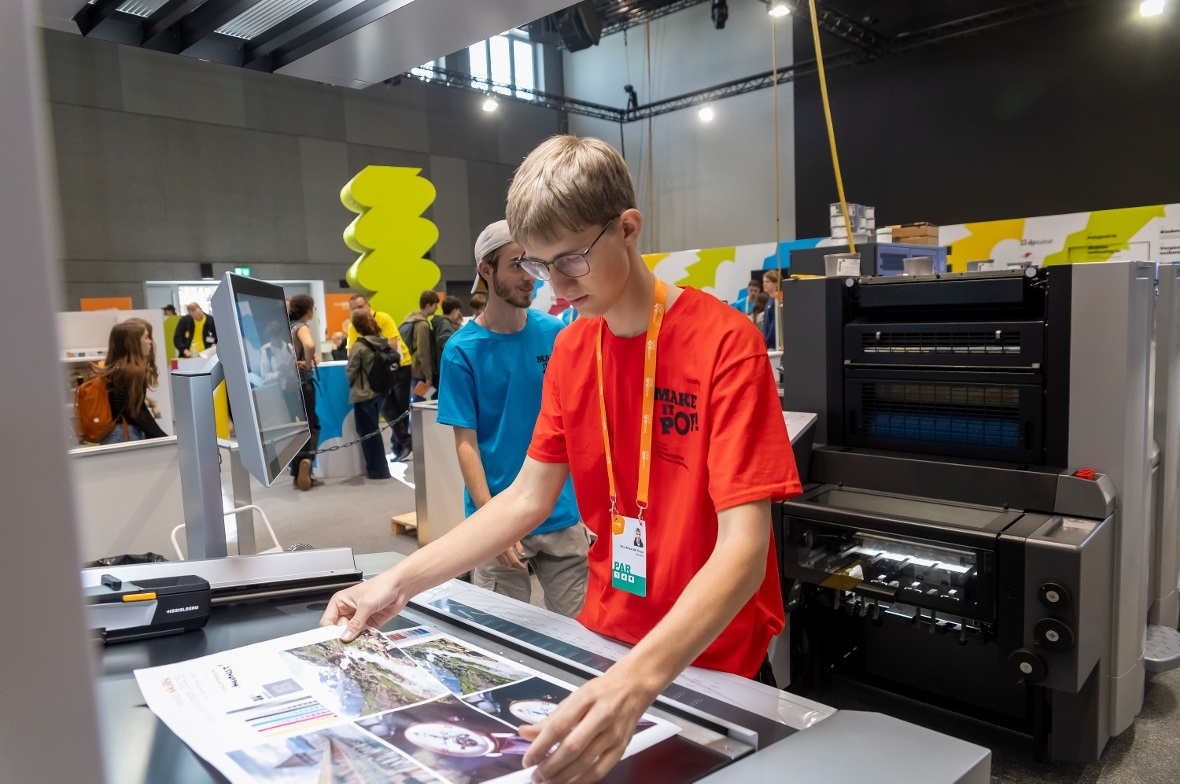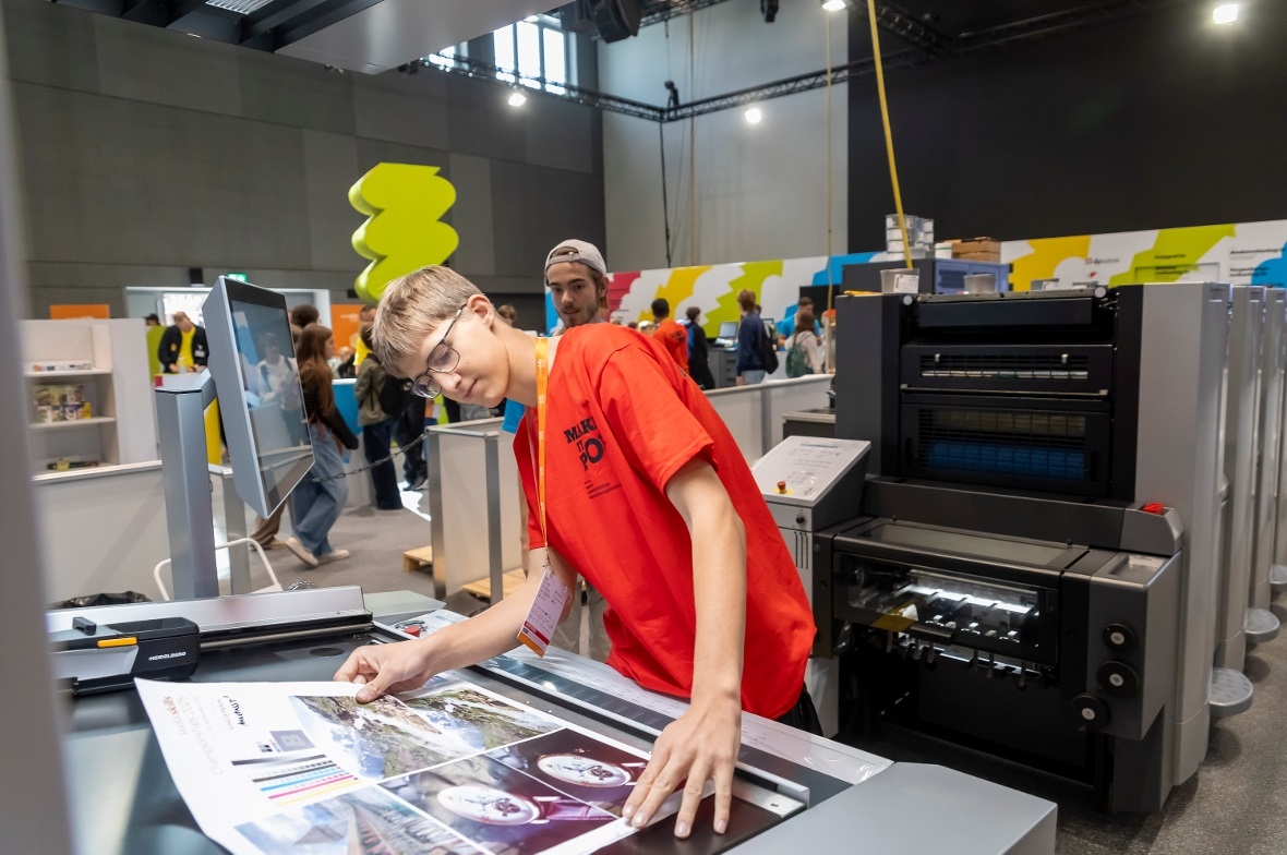 Nico Kopp vor der Offsetdruckmaschine an den SwissSkills in Bern.