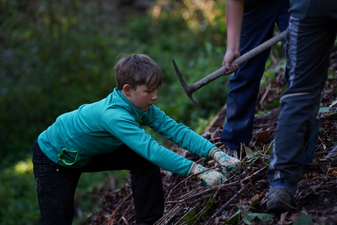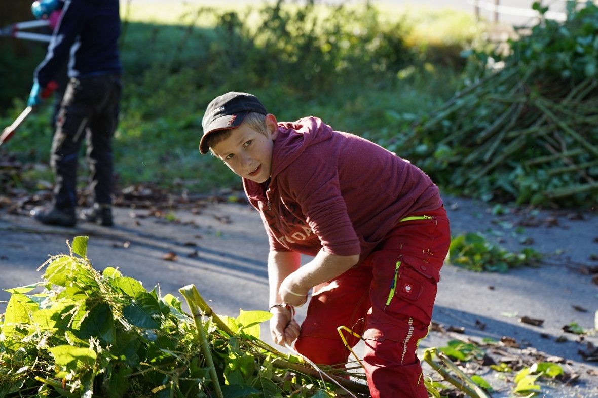 Zusammen mit der Schule Boltigen, den Lehrern Zacharias Borer und Ursula Gerber sowie Unterstützung von Heinz Burri mit Werkzeug, konnte Catrin Linke nun jedoch eine Fläche von diesem ungebetenen Pflanzengast befreien. Ausgerüstet mit Astscheren, Beuteln und Bindfäden zum Bündeln machten sich die Schüler der 5./6. Klasse der Schule Boltigen am Vormittag daran, die wuchernden, mehr als mannshohen Knöterich-Pflanzen zu beseitigen.