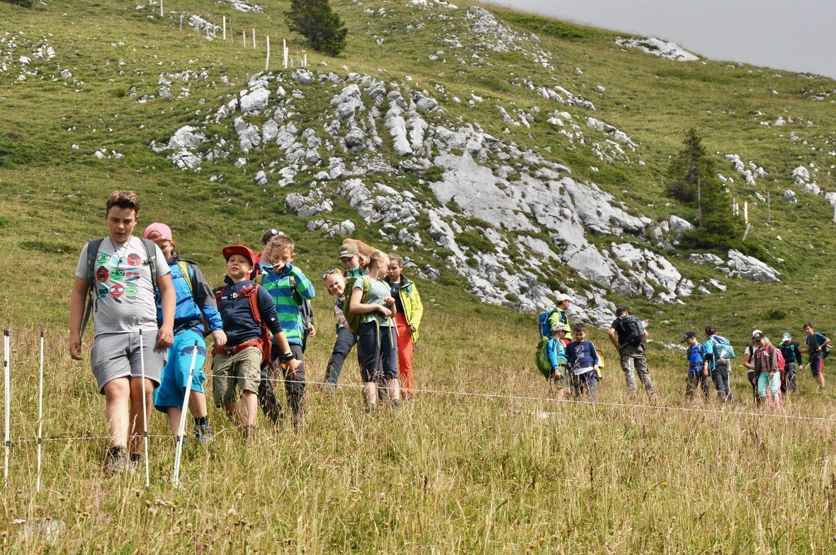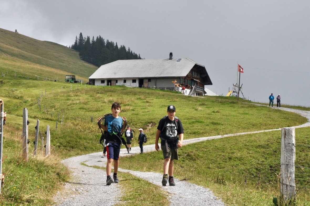 Auf der Alp Grosse Bäder angekommen, konnten einige ihre Trinkflasche nochmals auffüllen oder einen feinen Ziegenkäse für das noch nicht ganz vollständige Mittagessen einkaufen. Während die beiden grössten Gruppen aufs Bäderhorn und wieder zurück zum Jaunpass wanderten, war auch die 1./2. Klasse unterdessen auf dem «Bruch» unterwegs.