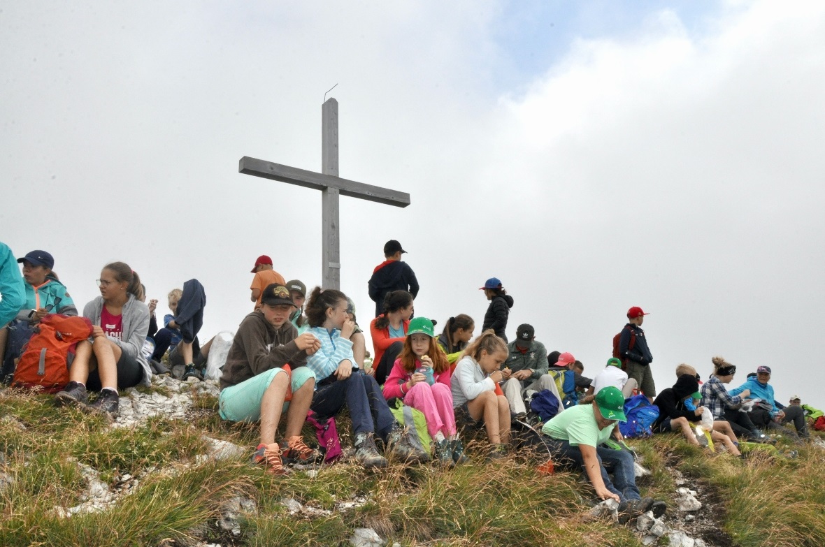 Die mit Abstand grösste Gruppe «Standard» mit gut 40 Kindern und Jugendlichen hatte sich als morgendliches Ziel ebenfalls das Bäderhorn vorgenommen. Einen ersten Halt gab es bei der Abzweigung Bäderhorn-Zeitboden. Diese erste Rast kam vielen gerade gelegen, um sich nochmals mit einem leckeren Znüni zu stärken, bevor es an den steilsten Aufstieg bis zum Grat Richtung Bäderhorn ging.