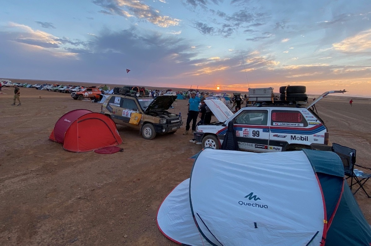 Die Organisatoren boten im Camp jeweils fixe Zelte (Küche, WC und Duschkabinen) an sowie einen LKW mit Werkstatt und marokkanischen Mechanikern, die man zur Mithilfe mieten konnte. «Wir hatten am zweiten Tag einen Stein nicht gesehen – und mussten von der LKW-Werkstatt im Camp das erste und einzige Mal Gebrauch machen, um den Pneu abzunehmen und mit einem Mechaniker auf «akfrikanische Art» wieder zu flicken – und er verhielt! Ansonsten waren wir am Abend froh, wenn wir am Etappenort die Zeit für unser Zelt aufzubauen, etwas zu essen und schnell unters Wasser zu stehen, nutzen konnten, da es bis sechs Uhr taghell – und zehn Minuten später nach Sonnenuntergang auf einen Schlag stockfinster war.»