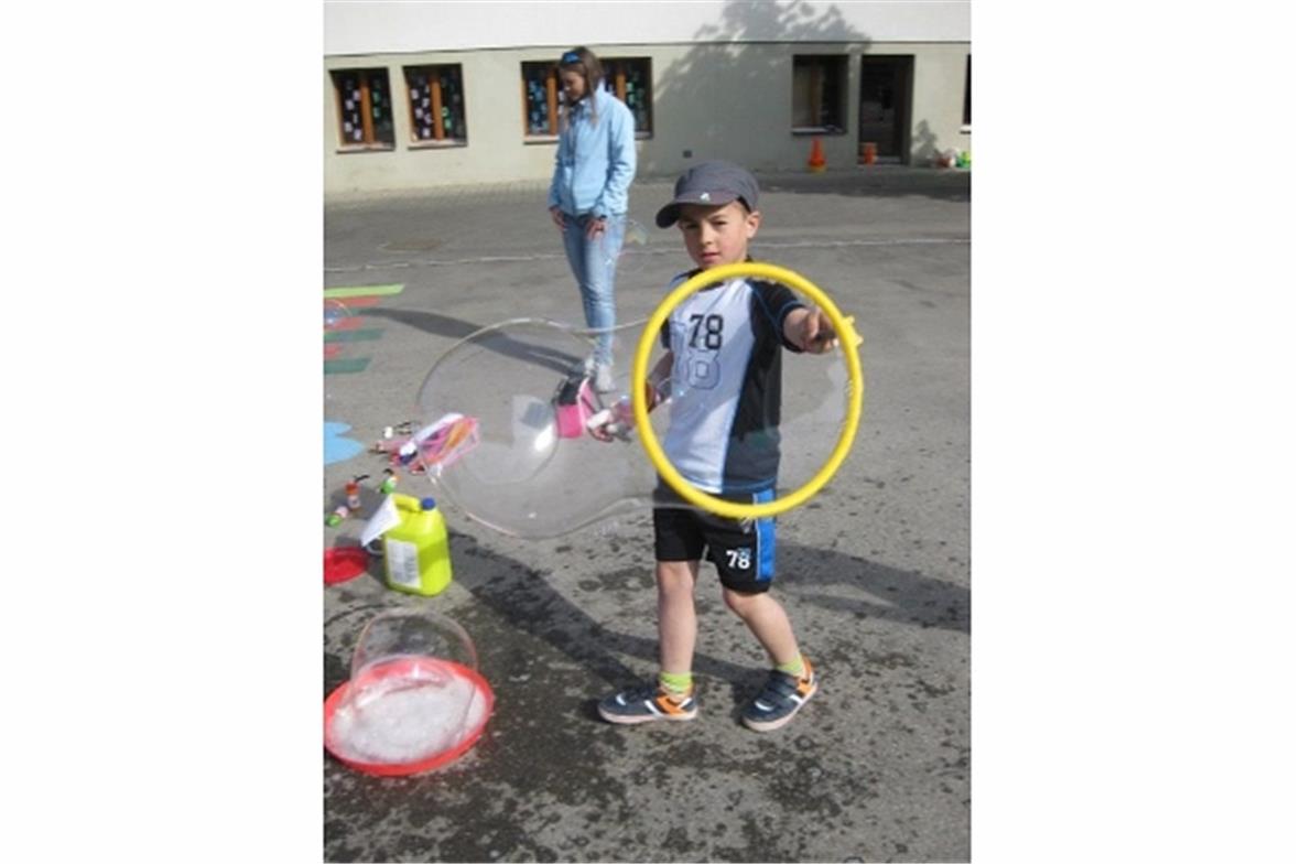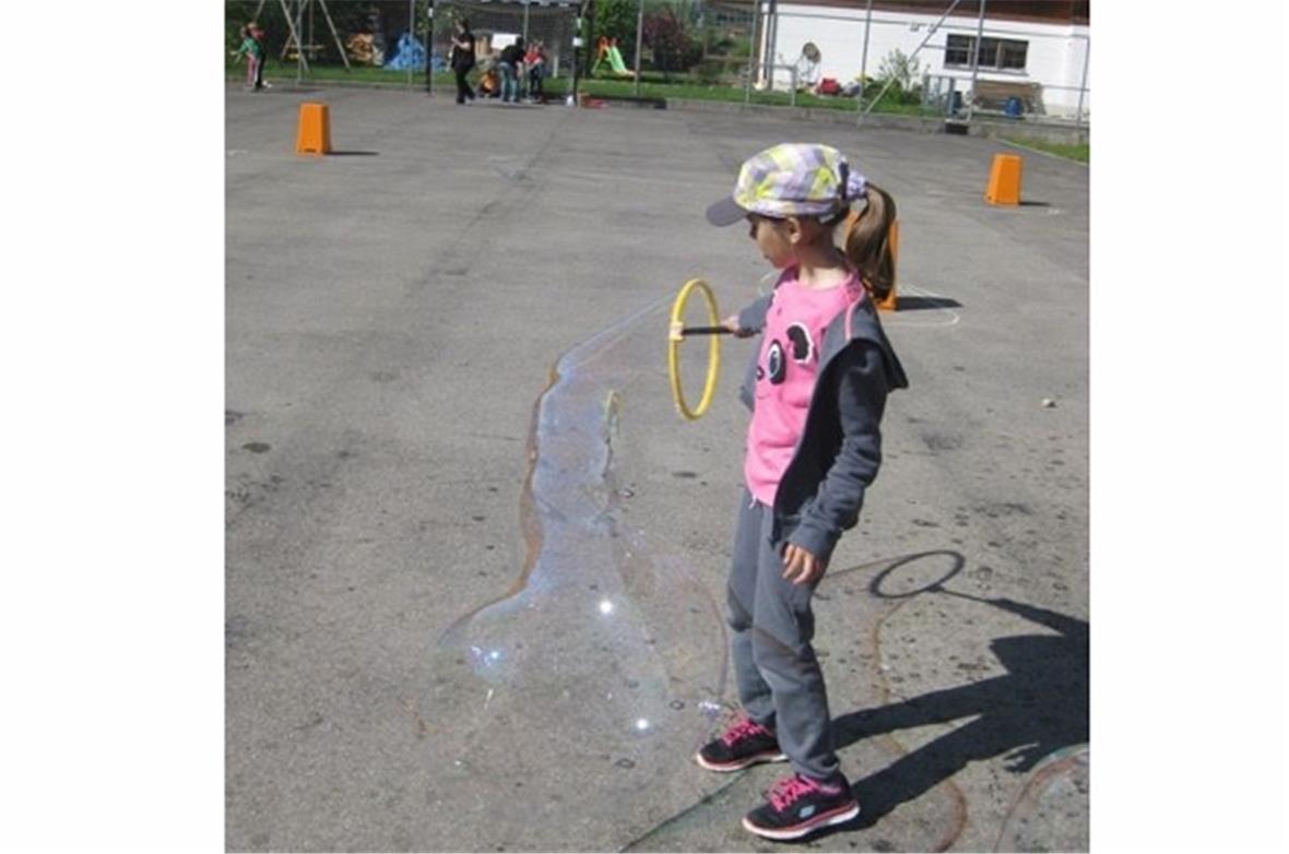 Zum Glück lacht die Sonne am ersten Verschiebetag, am 18. Mai 2016 schon am Morgen früh. Bei verschiedenen Posten können die Kinder Erfahrungen sammeln, sich messen, staunen und lachen. Minigolf, Riesenseifenblasen herstellen, als Cowboys Punkte sammeln, über den gefährlichen Fluss gelangen, Ruhe bewahren beim Jenga oder Mikado, Treffsicherheit üben bei Ballspielen oder Boccia, die Kinder werden gefordert. Plötzlich sind immer mehr Gesichter verziert. Bärtige Männer, Schmetterlinge mit zwei Beinen, edel geschminkte Prinzessinnen… jedes kann beim Schminkposten Wünsche anbringen.