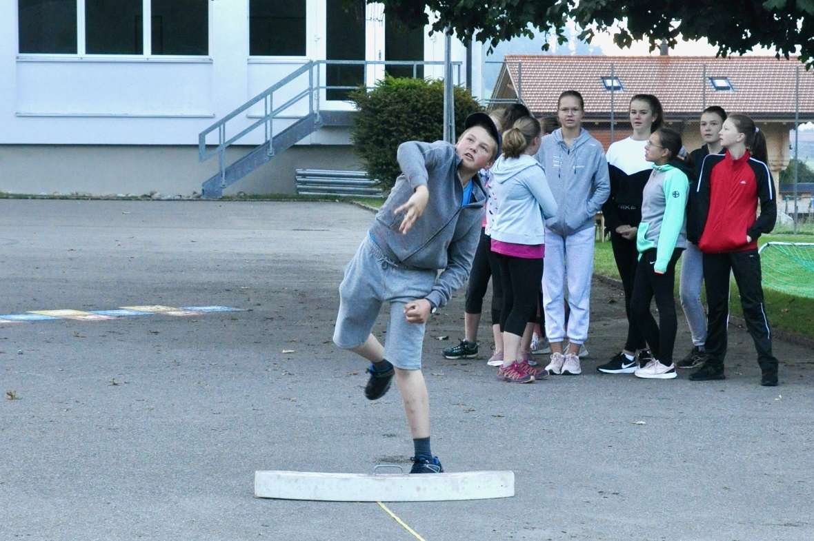 Die freiwilligen Helferinnen und Helfer aus der Oberstufe hatten am Donnerstag vergangener Woche bereits im Vorfeld zuverlässig die Anlagen für die Leichtathletikdisziplinen vorbereitet. Auch die Musikanlage war eingerichtet, so dass das Einlaufen im grossen Kreis auf dem Schulhausplatz pünktlich beginnen konnte.