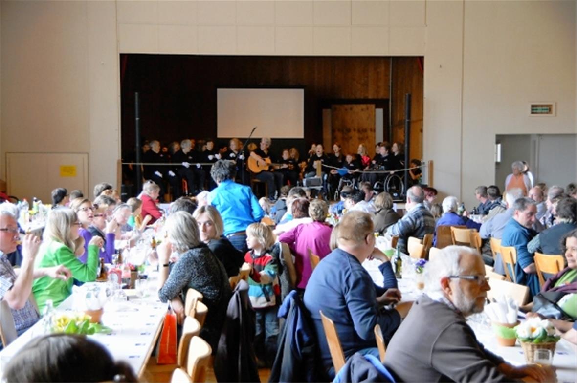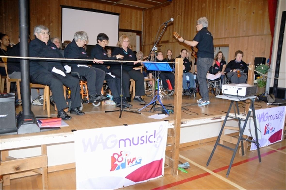 Ein bemerkenswerter Auftritt im Rahmenfestprogramm durch die WAGmusic, in einer fast gefüllten Festwirtschaft. Eine bunte Gruppe von Menschen mit oder ohne Handicap (unten im Bild) präsentierten ein vielfältiges musikalisches Programm von Folk- und Gospelmusik bis Mundartschlager und Popsongs. Die schönen Darbietungen, unter kundiger Leitung von Barbie Larson, erhielten immer wieder einen grossen Applaus. Barbara Hirschi, WAG Bereichsleitung Verwaltung, präsentierte in lockerer Weise eine Bildschau der Konzert-Tour Kalifornien aus dem Jahre 2010.