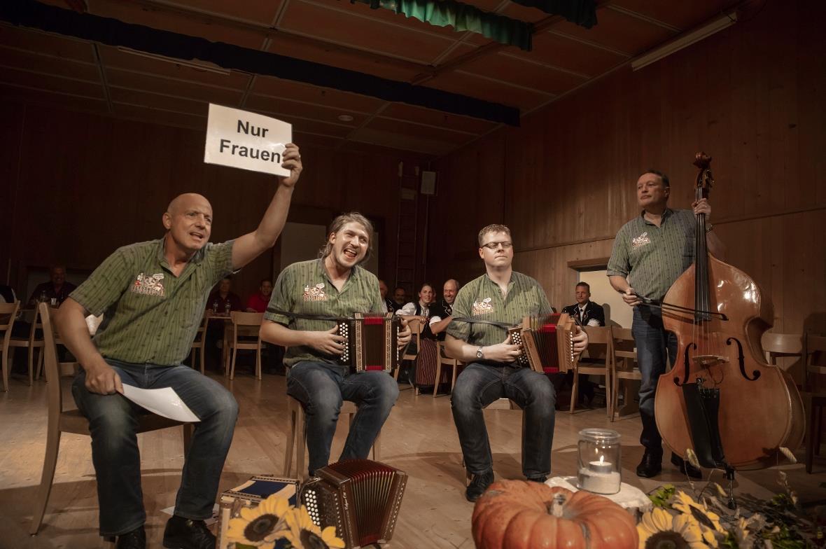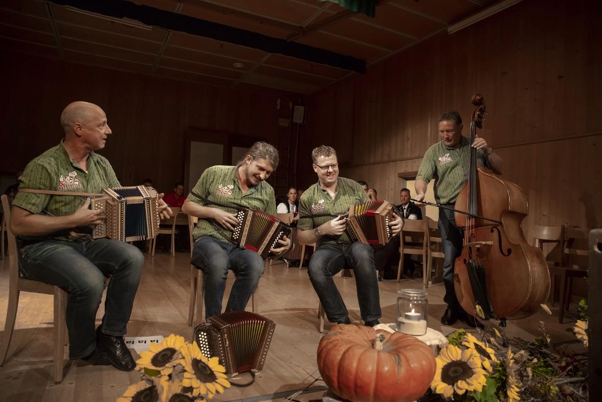 Kürbisse, die auf Holzstümpfen lagen, Kerzen, die langsam herabbrannten, Blätter, die scheinbar wahllos am Bühnenrand lagen und dazwischen Äpfel. Dahinter sassen Marina Beer, Corinne Knutti, Anita Kappeler, alle Schwyzerörgeli, und am Bass Christian Fuchser. Fetzig eröffneten die vier Musiker, besser bekannt als Örgelifründe Aegelsee, den Samstagabend. Der Applaus danach war überwältigend. Mit einem breiten Lächeln und erleichtert äusserte sich Beer: «Hätten wir gewusst, was für ein tolles Publikum ihr seid, hätten wir nicht so nervös sein müssen.» Dann blickte sie auf die Dekoration: «Ein tolles Bühnenbild, man kommt sich vor, als würde man im Wald spazieren gehen.» Es wurde kein Spaziergang, dafür eine musikalische Reise, die das Publikum vom Hocker reissen sollte. Die Vier haben das Örgelispielen nicht erfunden, nur was die Vier daraus machen, ist schon sensationell. Als sie zum Beispiel «früsch, fröhlich, fätzig», ein Potpourri von «What ever you want», «Achy Breaky Heart» und «Her mit meine’ Hennen» zum Besten gaben, gab es kein Halten mehr im Publikum und 600 Hände klatschten Beifall. Mit den Gastformationen bewiesen die Örgelifründe ein glückliches Händchen.