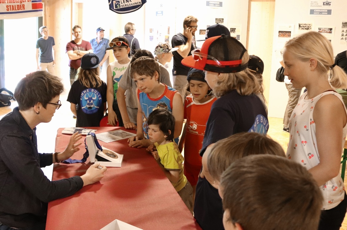Der einzige Ehrengast am Wochenende war das Aushängeschild des Vereins: Angela Frautschi. Am Nachwuchstag am Samstag durften die Kinder ihrem Vorbild bei der Autogrammstunde näher kommen und Fragen stellen. Angela beantwortete diese ausführlich und freute sich über das Interesse. Sie selbst begann ihre Karriere auch als Bambini beim EHC Lenk-Zweisimmen und spielte bis zum Ende der Schulzeit bei den Lenker Nachwuchsmannschaften mit, oftmals als einziges Mädchen. Während ihres Au-pair-Aufenthaltes entdeckte sie in Freiburg, dass es auch reine Frauenteams gibt und spielte dort zwei Jahre aktiv mit. Seitdem ging ihre Karriere steil bergauf und sie gewann sowohl bei den Weltmeisterschaften 2012, als auch bei den Olympischen Winterspielen in Sotschi 2014 mit der Frauen-Nationalmannschaft die Bronzemedaille.