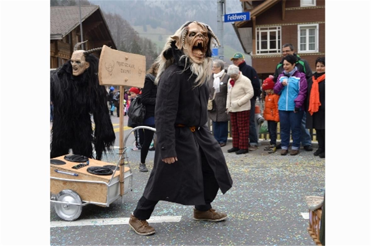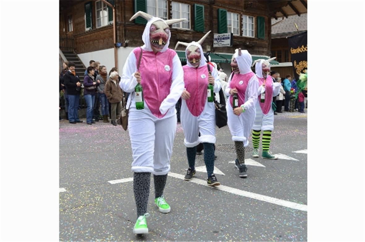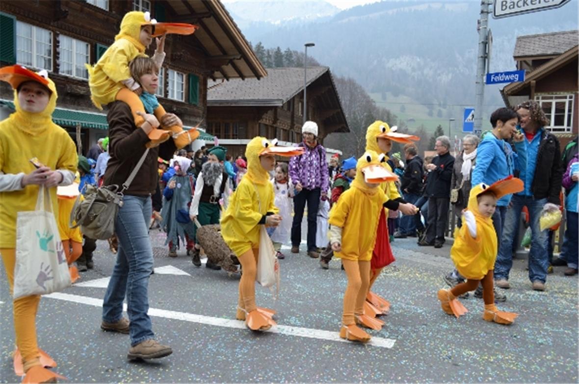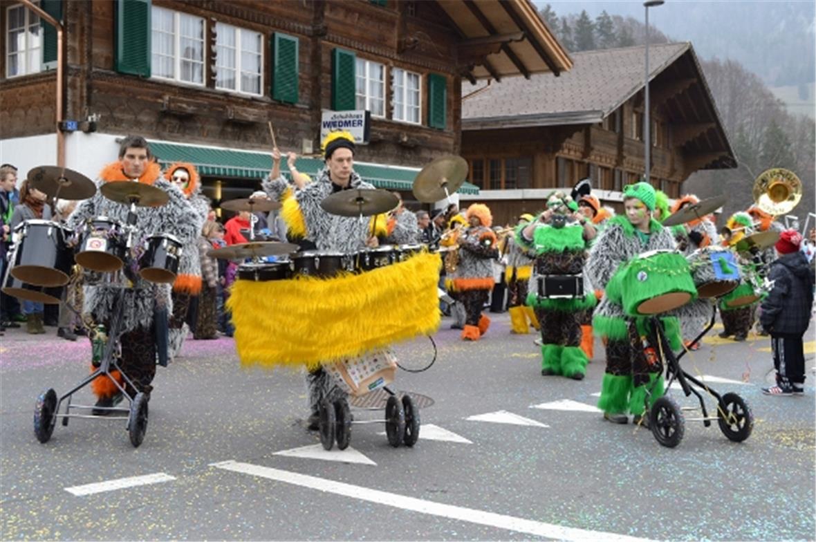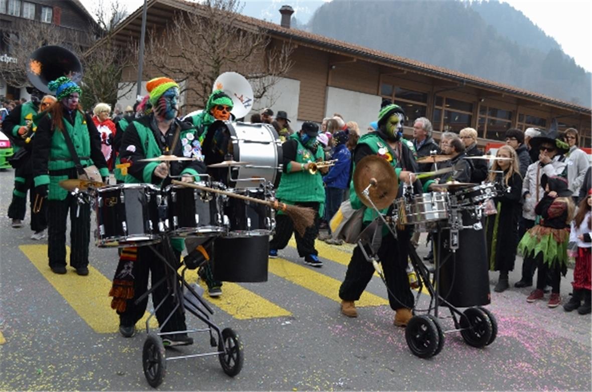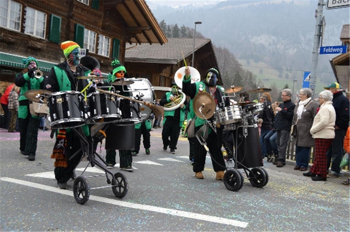 Mit dem lauten knallen der drei Raketen begann der Start zum umfangreichen fröhlichen Umzug durch das Dorf Oey. Angeführt durch die «Trychler Fründe Wimmis» kam das ganze in Bewegung. Bunt gemischt zog der Umzug an den vielen Zuschauer vorbei. Den Schluss machten auch in diesem Jahr die Gugge Bau Band aus Giarnico, mit ihren Schildkröten ähnlichen Gewändern sorgten die für viel Applaus.