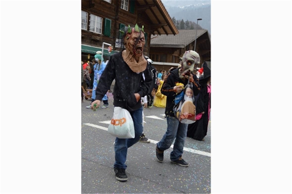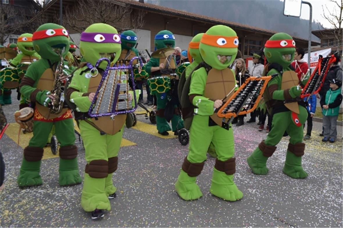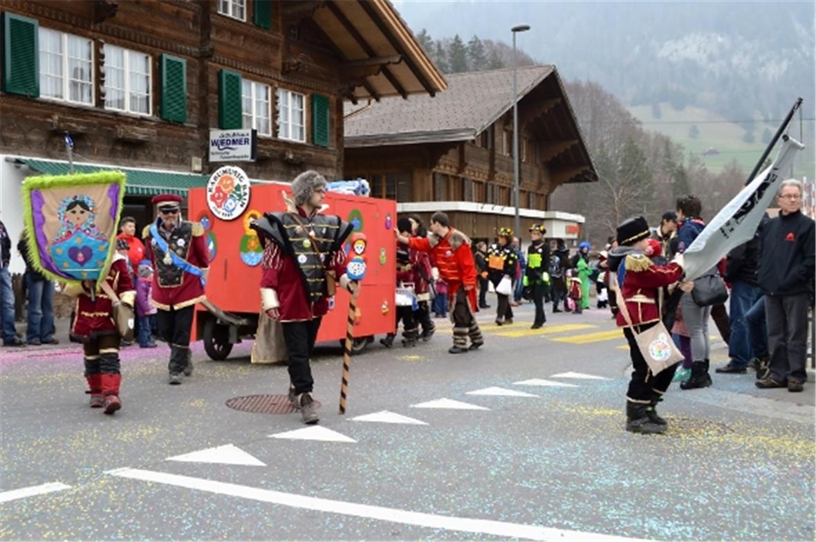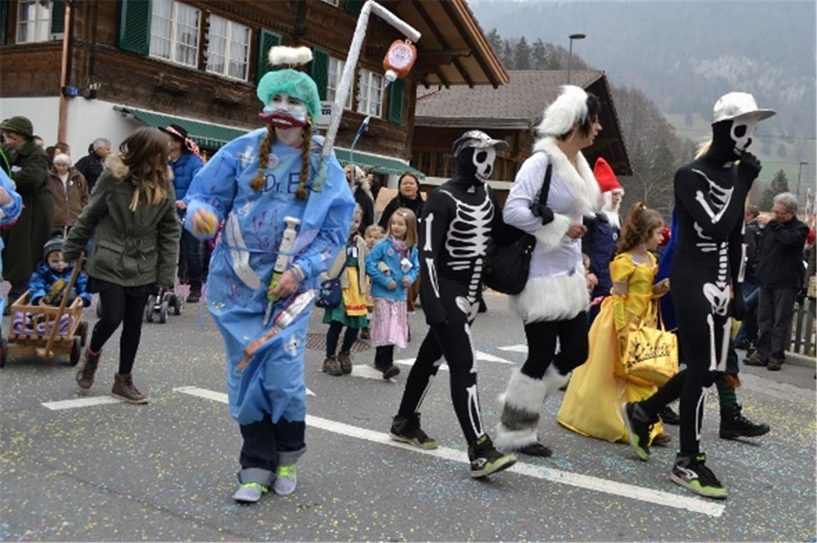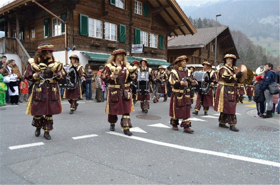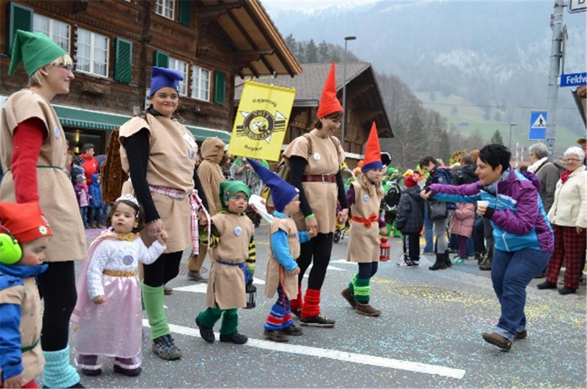 Mit dem lauten knallen der drei Raketen begann der Start zum umfangreichen fröhlichen Umzug durch das Dorf Oey. Angeführt durch die «Trychler Fründe Wimmis» kam das ganze in Bewegung. Bunt gemischt zog der Umzug an den vielen Zuschauer vorbei. Den Schluss machten auch in diesem Jahr die Gugge Bau Band aus Giarnico, mit ihren Schildkröten ähnlichen Gewändern sorgten die für viel Applaus.