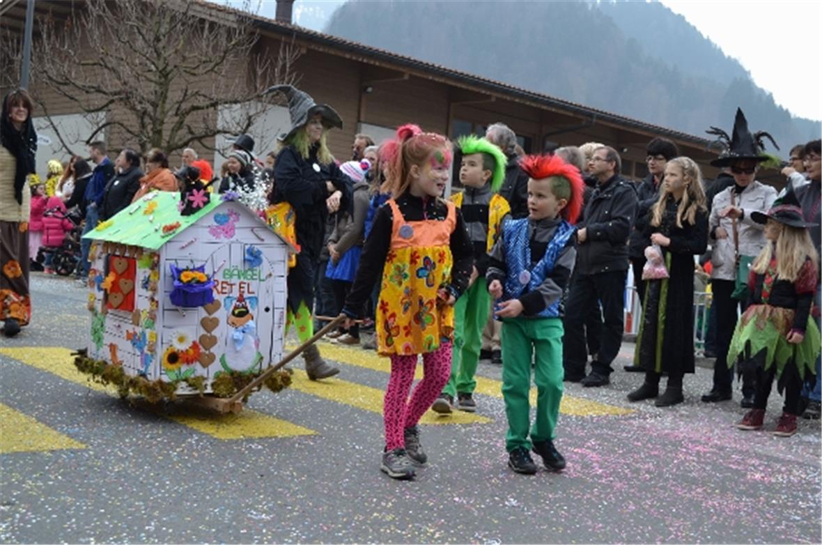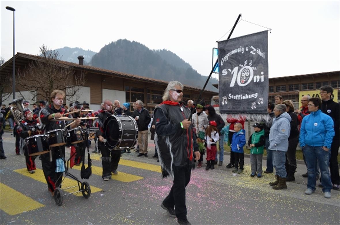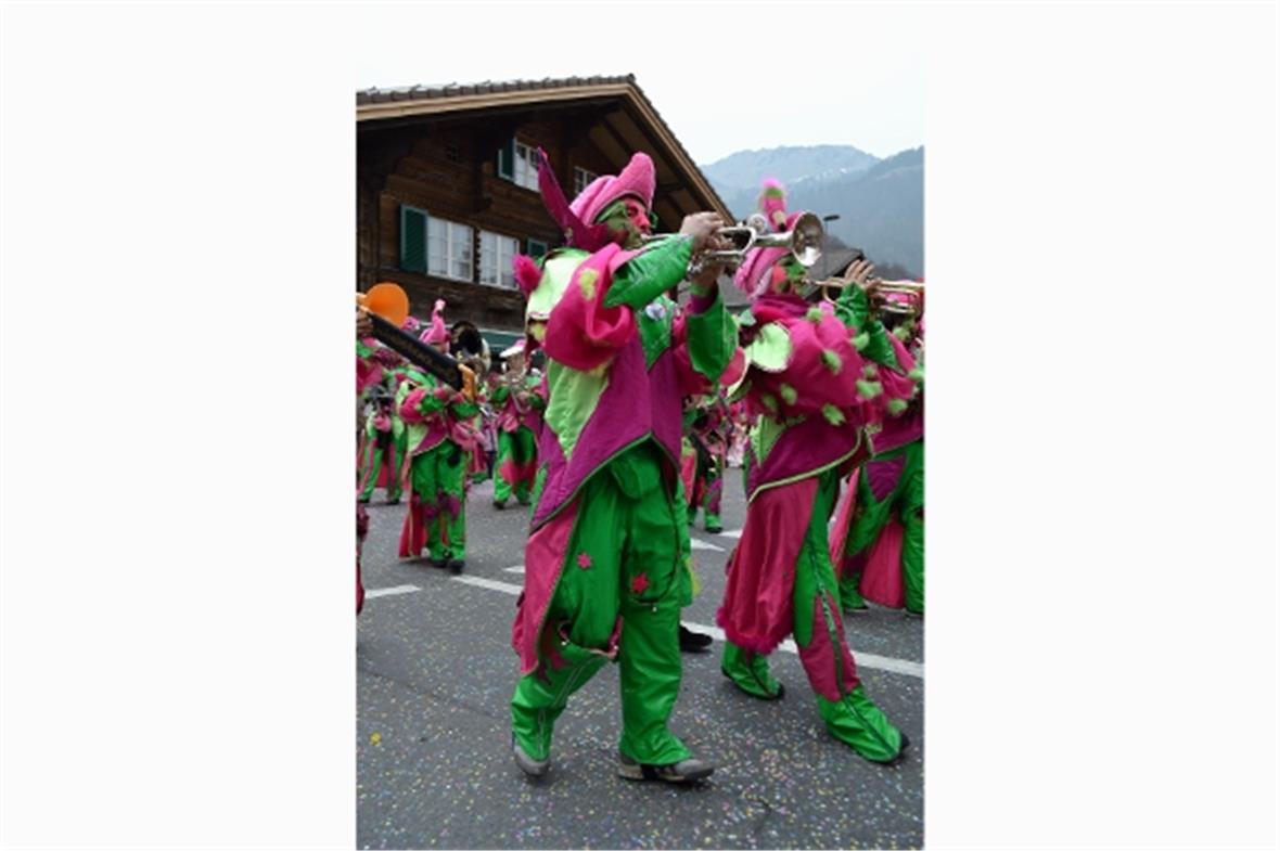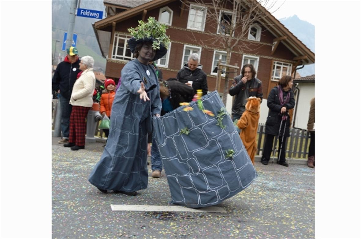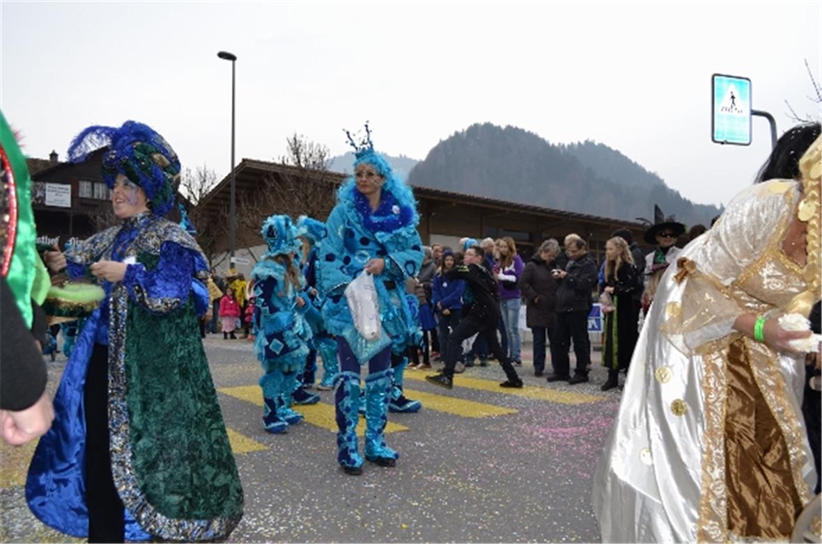 Mit dem lauten knallen der drei Raketen begann der Start zum umfangreichen fröhlichen Umzug durch das Dorf Oey. Angeführt durch die «Trychler Fründe Wimmis» kam das ganze in Bewegung. Bunt gemischt zog der Umzug an den vielen Zuschauer vorbei. Den Schluss machten auch in diesem Jahr die Gugge Bau Band aus Giarnico, mit ihren Schildkröten ähnlichen Gewändern sorgten die für viel Applaus.