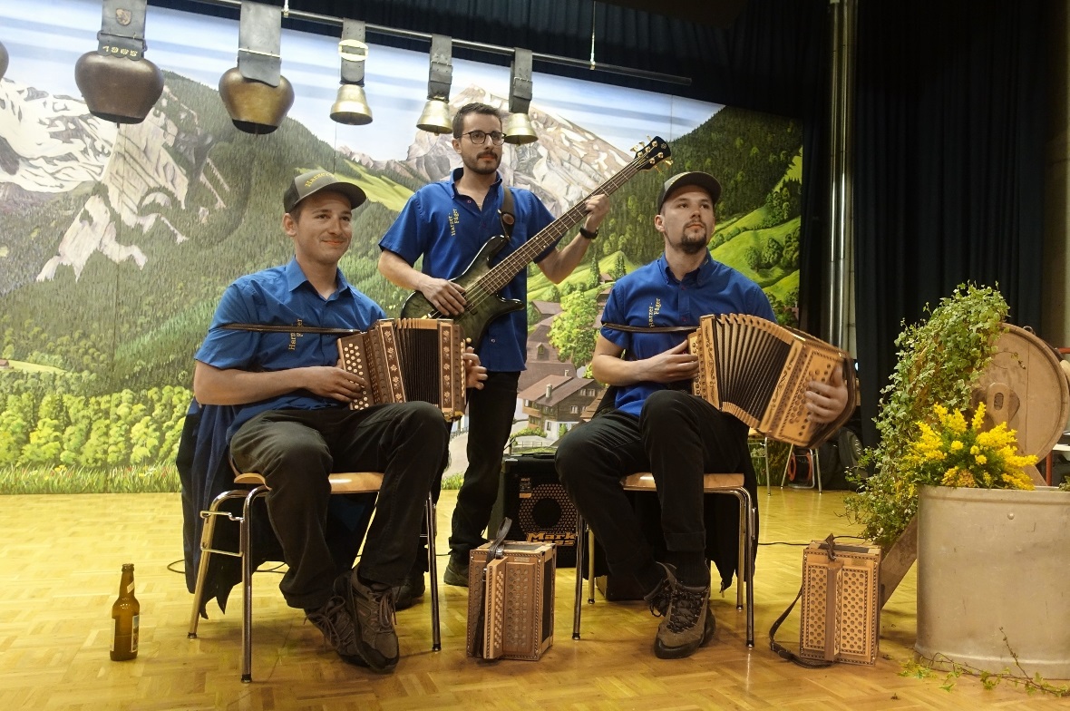Nach dem reichhaltigen Programm hat die junge Formation Harzer-Fäger mit rassiger Musik zum Tanz und zur Unterhaltung gespielt. Fabio Abegglen und die Brüder Fabian und Manuel Beugger sind alle drei in Iseltwald am Brienzersee aufgewachsen. Es ist fast unwahrscheinlich, dass die wegen der Zeitumstellung um eine Stunde kürzere Nacht nicht etwas länger dauerte und die Uhren vieler erst im Verlauf des Sonntags vorgestellt wurden, war doch die eigene Festwirtschaft, unterstützt von zahlreichen Helfenden, für Speis und Trank bestens besorgt. Aber auch die Bar im geheizten Zelt bei einem entsprechenden Drink war einen Besuch wert.