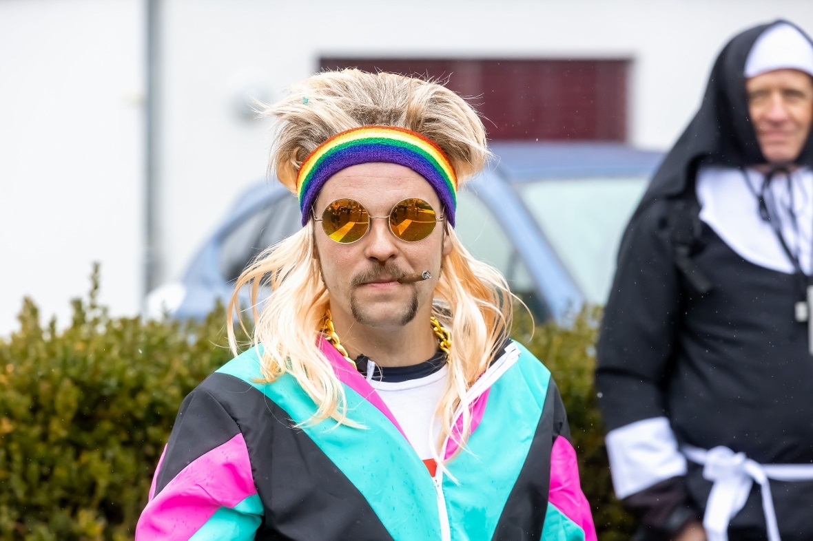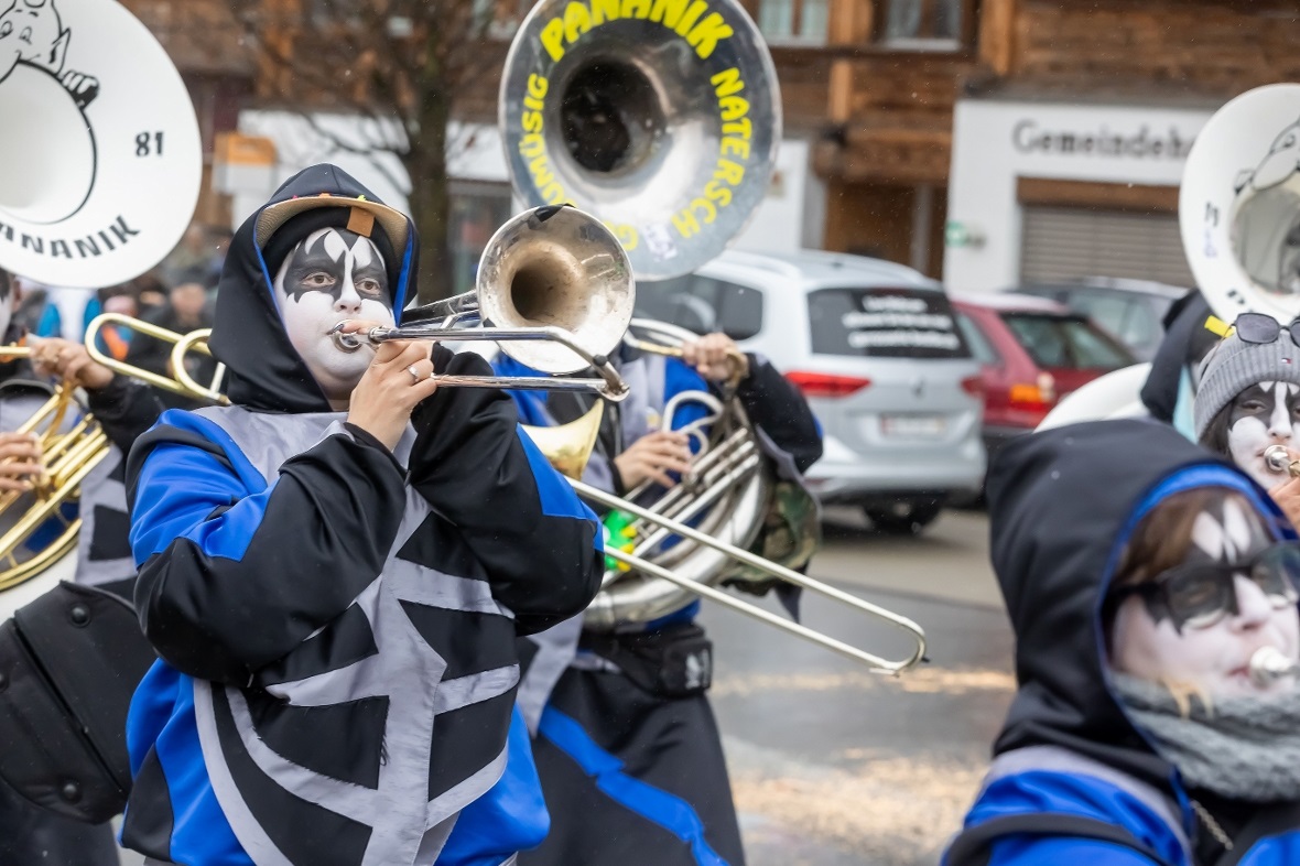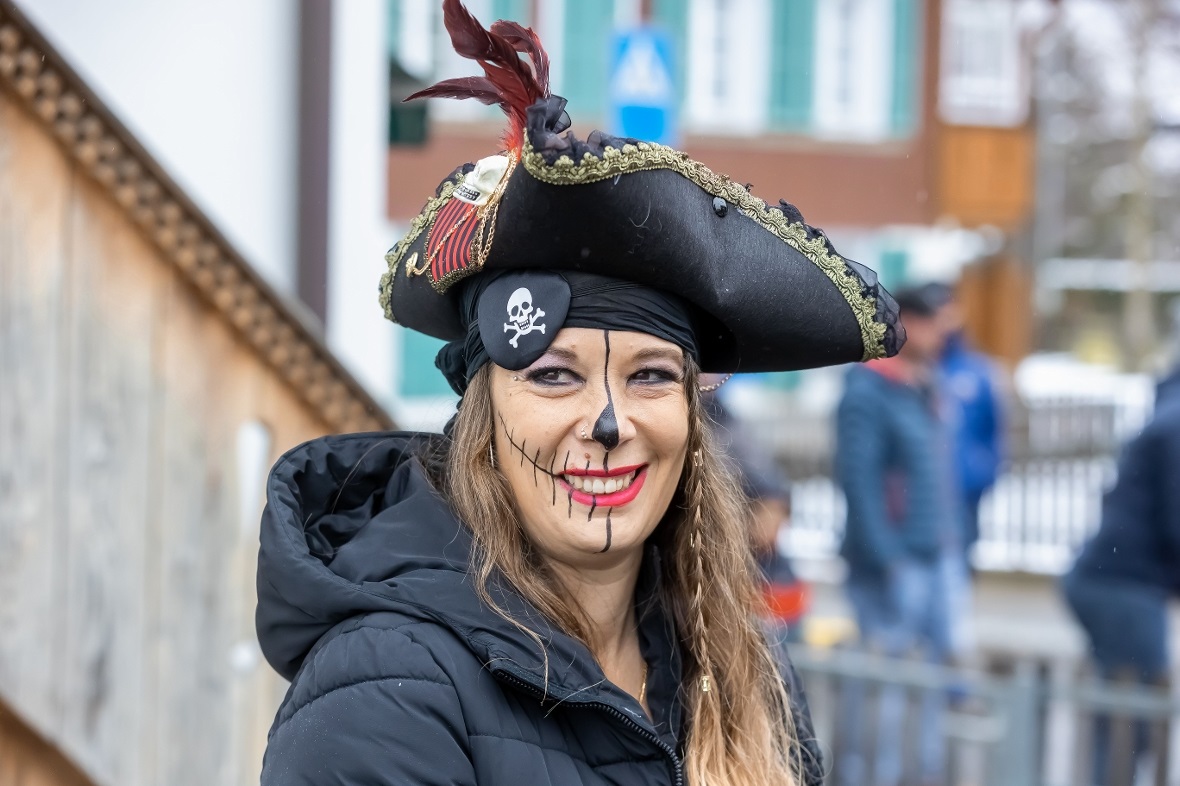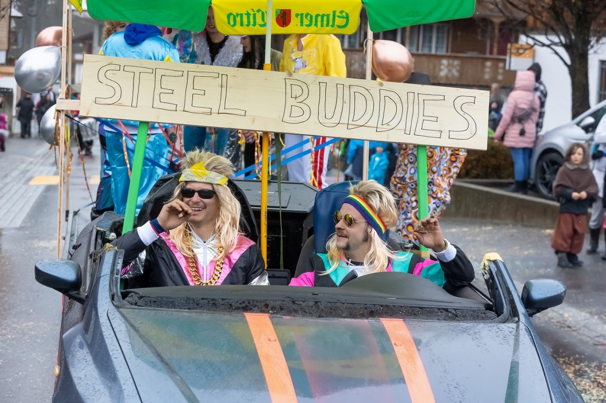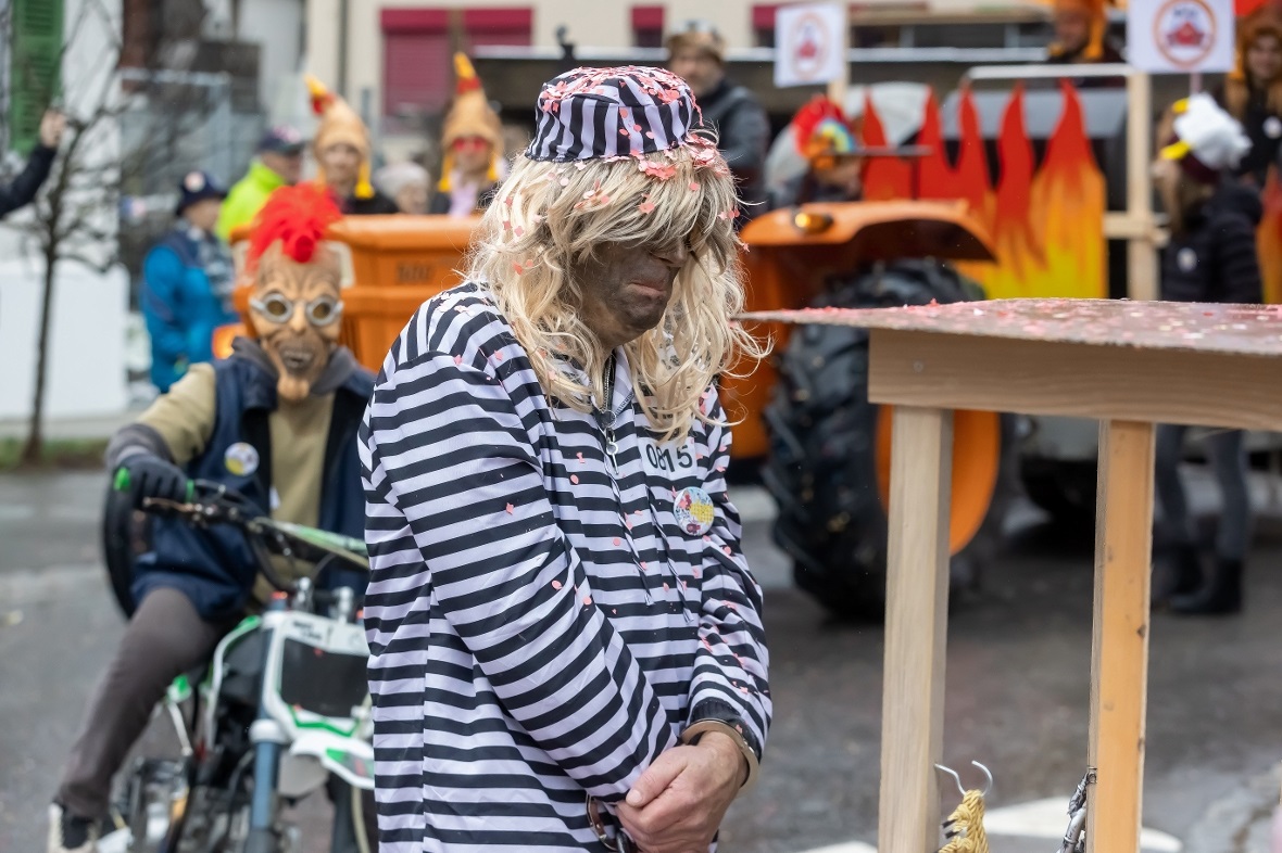 Vorweg beim Umzug fuhr das OK der Fasnacht. Bunt geschmückt mit goldenen und schwarzen Luftballons und gross angeschrieben mit dem Motto «The Show must go on.» Mit im Umzug waren Teilnehmer in bunten, einfallsreichen und sehr kreativen Kostümen. Von Indianern, Cowboys, Moulin Rouge-Tänzerinnen, Jägern, Polizisten, Sträflingen bis zu den Panzerknackern war alles mit dabei.