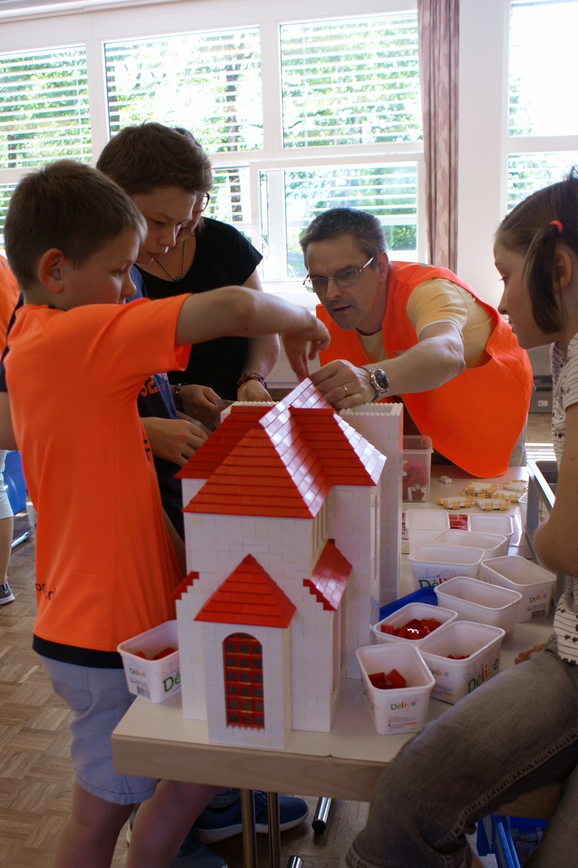 In den Baupausen wurden die Kinder mit feinen Sachen verpflegt, hörten Geschichten aus der Bibel und sangen zusammen. Marc Lendenmann vom Bibellesebund stellte mit Hilfe der Handpuppe Gino die Frage, auf welchem Fundament wir unser Leben aufbauen.