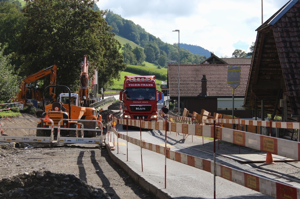 Um den Verkehrsfluss auch des Schwerlastverkehrs aus dem Talgrund zu gewährleisten, hat man eine provisorische Bahnhofzufahrt über (noch) privatem Baugrund hergestellt. Man sei aber bestrebt, so Christian Schöni, kantonaler Oberingenieur, aus dem Provisorium ein «Definitivum», also eine Dauerlösung zu machen.