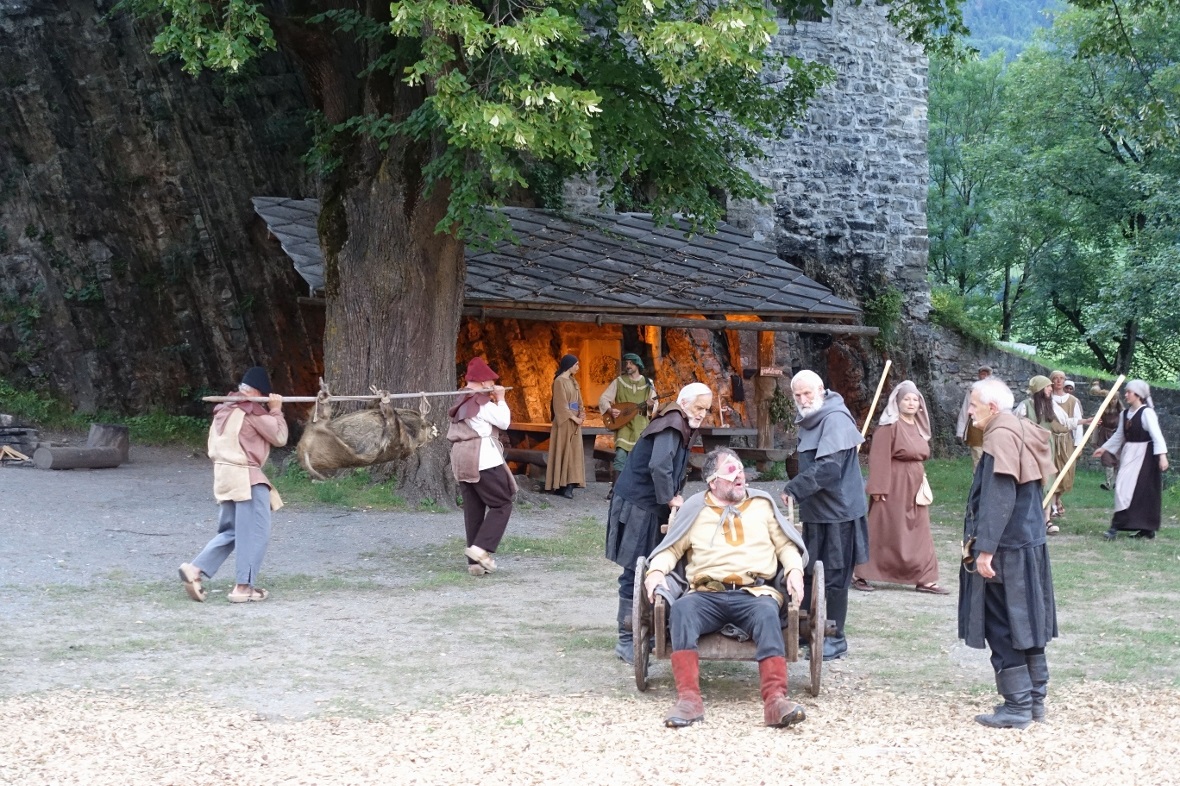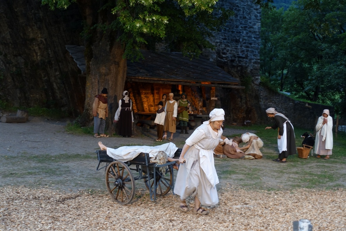 Aber zurück zur Premiere: Vor dem aufmerksamen Publikum spielte das 36-köpfige Ensemble erstaunlich erfrischend auf, obwohl es teilweise schwere Kost zu bewältigen hatte. So nistete sich der schwarze Tod auf dem Burghügel ein, und auch die übergehende Kander brachte Tod und Verwüstung über die von Ritter Eberhart von Tellenburg sonst schon arg gebeutelte Bevölkerung. Zwischendurch blitzte jedoch immer wieder Humor auf und das Publikum konnte sich auch an den frisch aufspielenden Kindern sowie verschiedenen Tieren – vom erlegten Wildschwein bis hin zum stolzen Pferd und verspielten Hund – erfreuen.