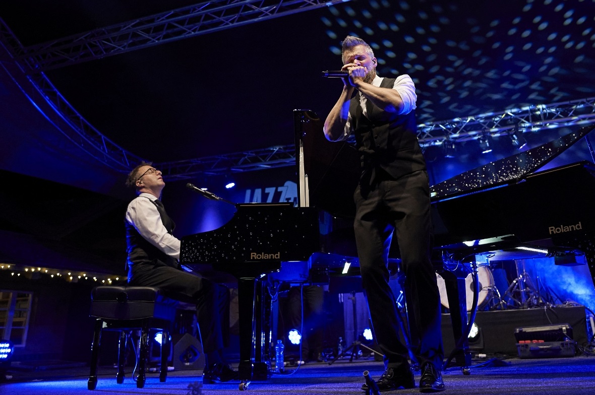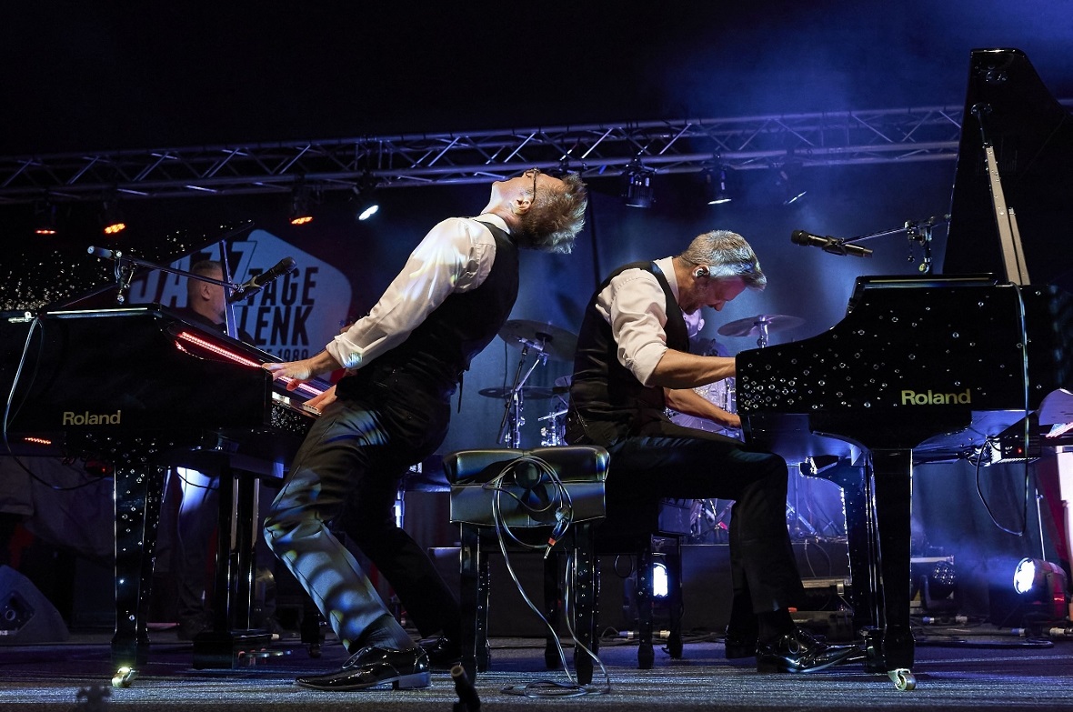 Ein Hauch von Vegas wehte am Freitag, 15. Juli durch das Konzertzelt: Glitzer-Dekor auf den Flügeln, LED-Effekte über der Tastatur. Etwas Licht-Show und ein extrovertiert durch das Programm führender Chris, kongenial unterstützt von seinem Bruder Mike – mal im wechselseitigen Solo, mal vierhändig, immer abwechslungsreich und überwiegend mit viel Tempo. Das Publikum wusste es zu schätzen und so kam im fast voll besetzten Zelt auch von Beginn an Stimmung auf.