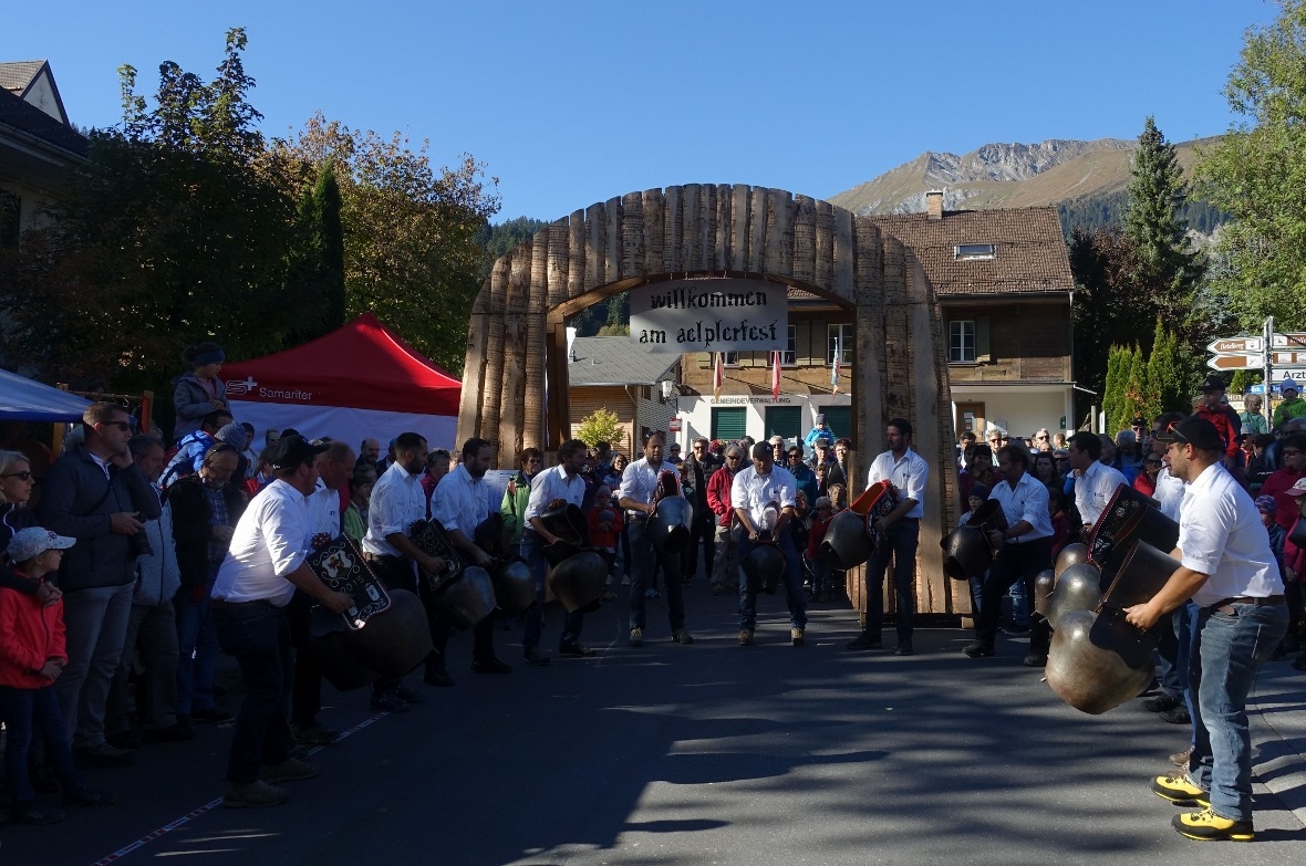 Pünktlich um elf Uhr ertönten auf der Rawilstrasse zwischen den beiden Torbogen des Älplerfestes mit gewaltiger Resonanz die Treicheln der beiden Treichlerclubs Seeland und des einheimischen Treichlerklubs Strubelgruess.