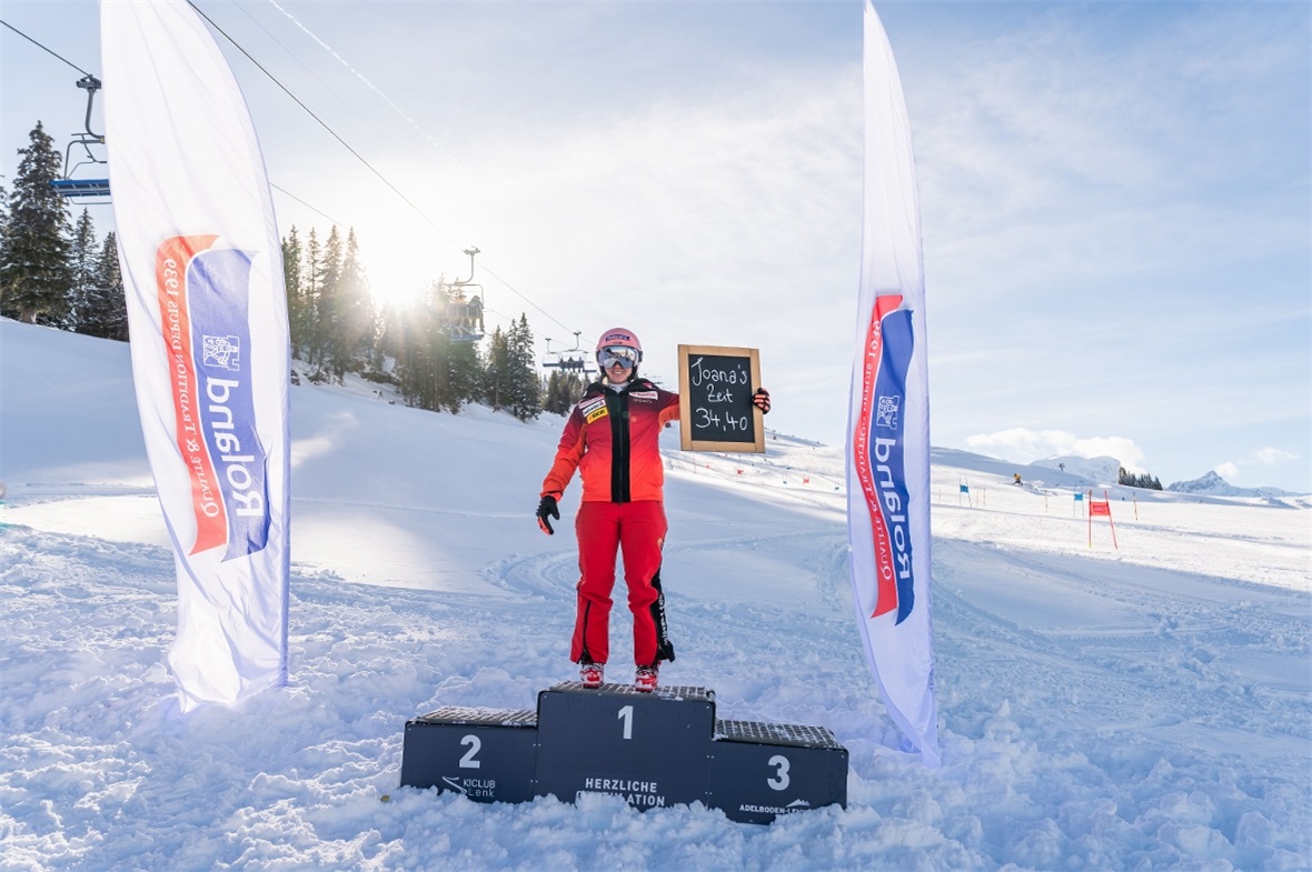 Pünktlich um 10.45 Uhr fuhr Joana den flüssig gesteckten Riesenslalom hinunter – und sämtliche JO-Kids fuhren in einem langen Tatzelwurm hinterher. Nach 34,4 Sekunden stoppte die Zeit für Joana Hählen im Ziel und kaum hatte sie die Skier von den Füssen, wurde sie bereits von den Kids in Anspruch genommen. Unzählige Autogrammwünsche wurden geduldig erfüllt, während die Kinder an Knäckebrot und Salzstengeli von Joanas Kopfsponsor Roland herumknabberten und dazu warmen Punsch tranken.