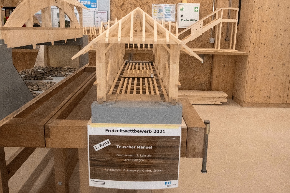 Manuel Teuscher aus Boltigen, der Zimmermann im 3. Lehrjahr, holte sich am Samstag. 1. Mai den Sieg beim Freizeitberufswettbewerb. Am Anlass für angehende Zimmermänner und Zimmerinnen EFZ im dritten und vierten Lehrjahr vom Bildungszentrum Interlaken, Standort Frutigen nahmen 89 Lernende teil. Eingereicht wurden 46 Modelle vom 3. Lehrjahr und 43 vom 4. Lehrjahr.