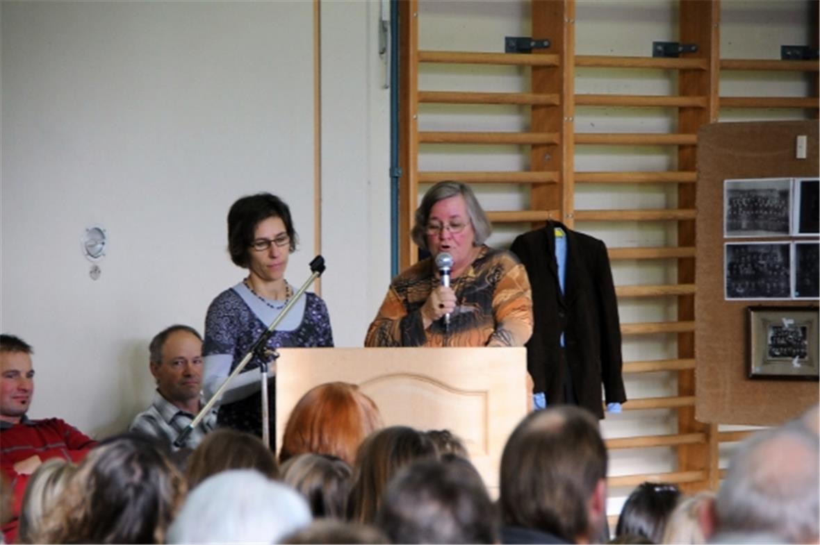 Maja Lörtscher erzählte mit Nicole Ast aus dem Leben des Schulhauses. Von den Bewohnern der beiden Wohnungen, welche später zu Werkraum und Kindergarten umgebaut wurden oder den verschiedenen Schulhausabwarten.
