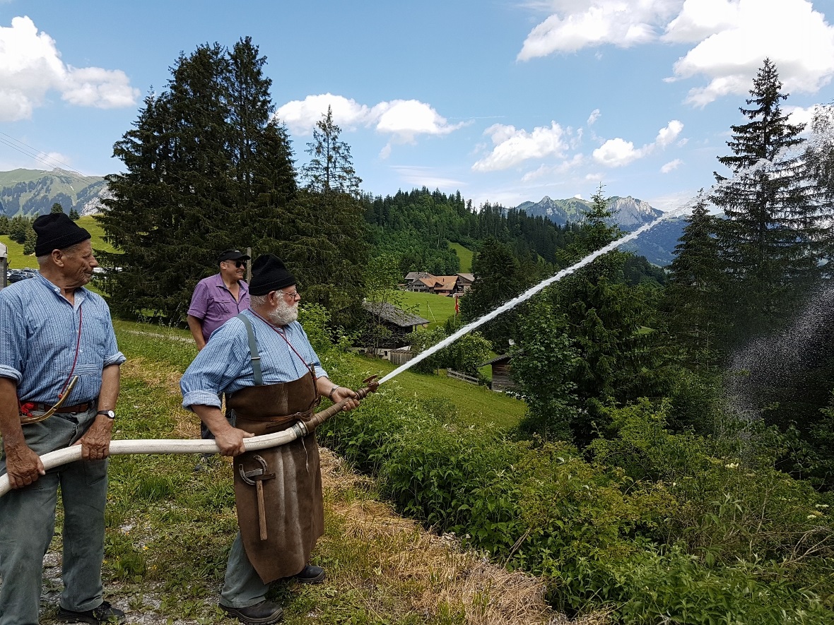 Der Sonntagmorgen startete traditionellerweise mit dem Frühstücksbuffet. Das Konzert der Blaskapelle Venovana über die Mittagszeit gehört zur Tradition und fand mit dem abwechslungsreichen Programm bei den Zuhörern grossen Anklang. Als Highlight am Sonntag reisten ein Dutzend Männer und zwei Frauen der «Füürfäger LaGo» (Landiswil-Goldbach) aus dem Emmental an und zeigten in einer Show, wie mit einer Handruckspritze vor über hundert Jahren ein Feuer gelöscht wurde. Die Spritze leistet zehn bar und die Wurfweite ist bei 31 bis 32 Meter, sofern genüg Leute anpacken und pumpen. Erbaut wurde die Spritze im Jahr 1880 von den Gebrüdern Aebi, zwei Jahre vor der Gründung ihrer wohlbekannten Firma.