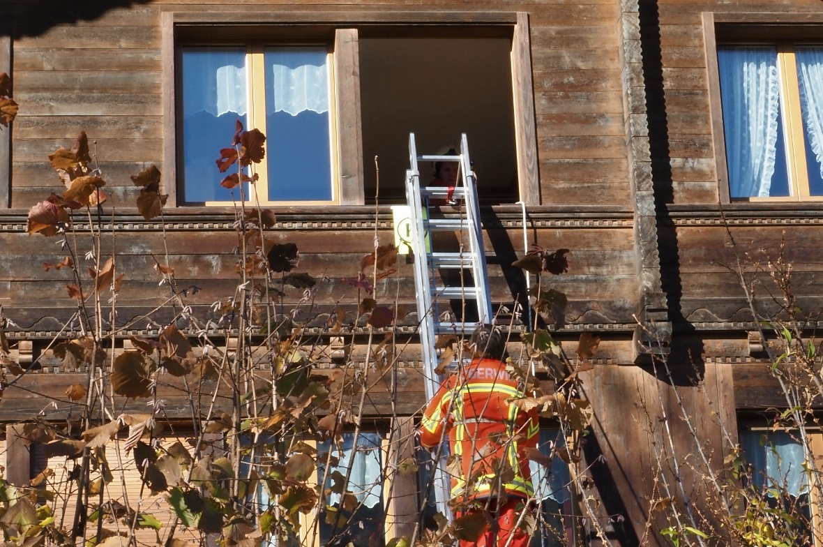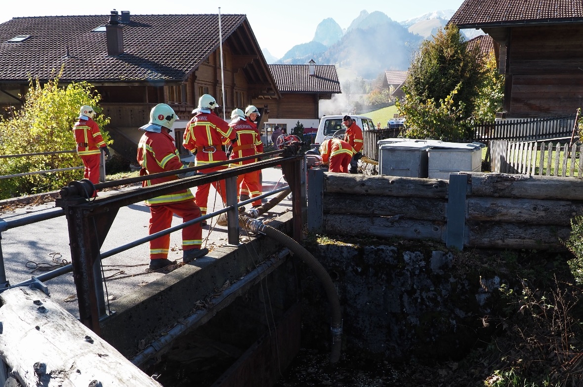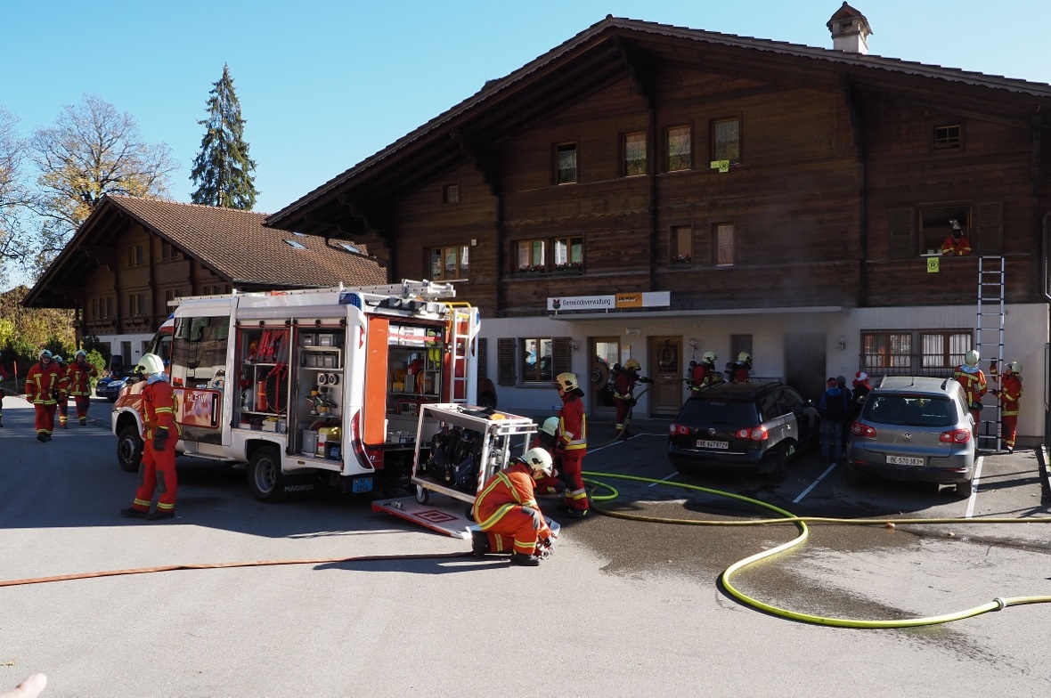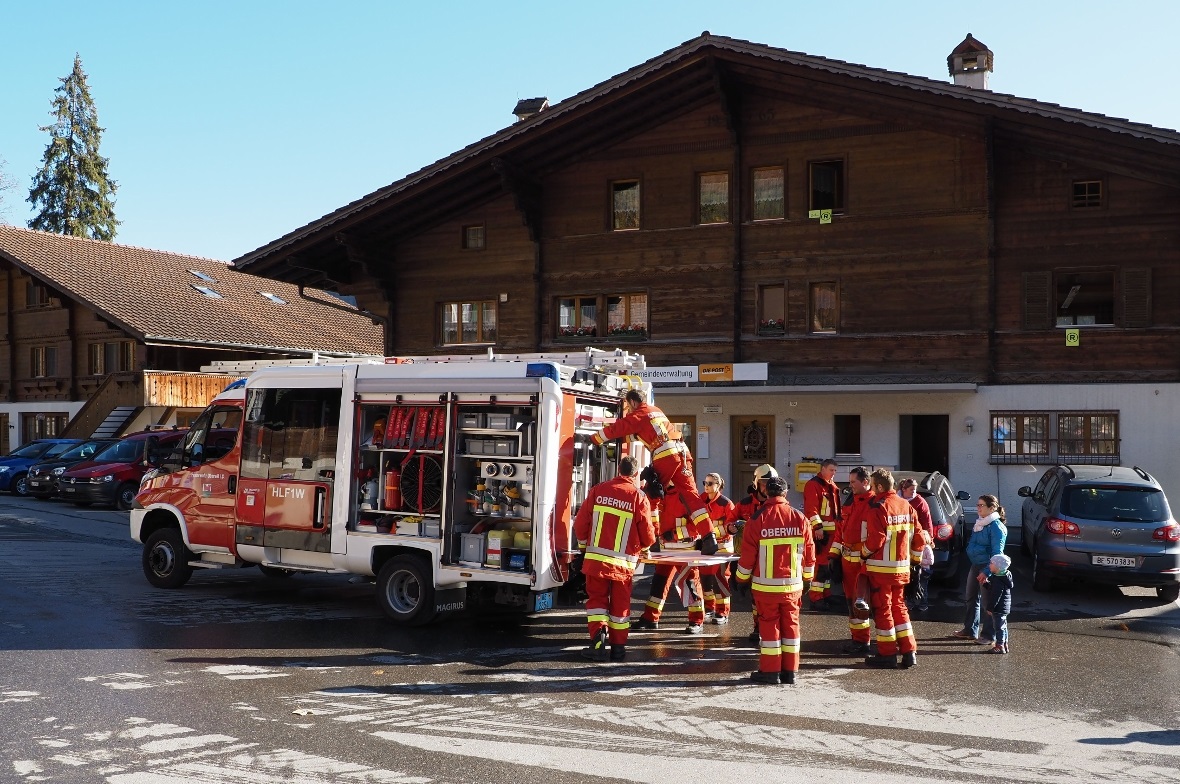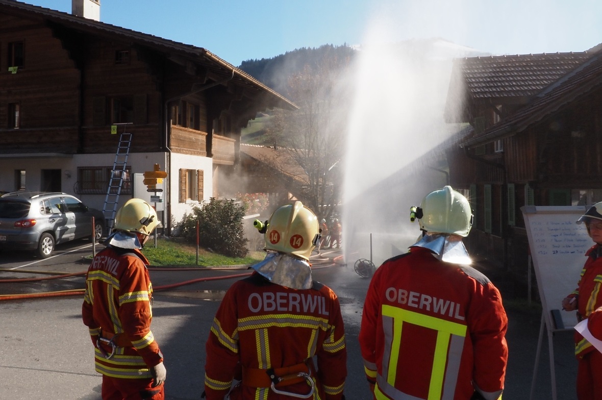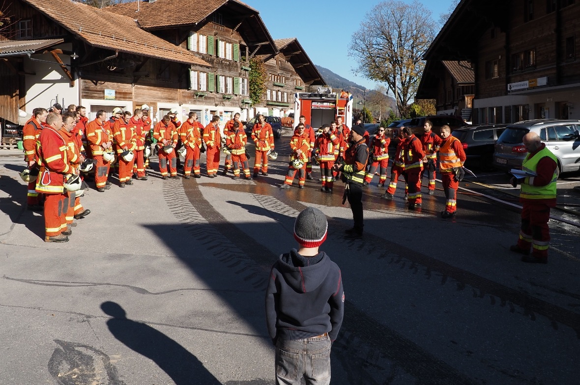 Nach einer kurzen Stärkung folgte der zweite Teil des Tages, die Hauptübung mit dem neuen Fahrzeug. Feuerwehrkommandant Reto Maurer erklärte das von Übungsleiter Sandro Mann entworfene Szenario: Zuunterst im Gemeindehaus gibt es einen Brand in der Heizung. Dies führt dazu, dass das gesamte Treppenhaus voll giftiger Rauch ist und die im Gebäude eingeschlossenen Personen das Haus nicht mehr über den normalen Weg verlassen können – wegen einer Sitzung sind es viele, die gerettet werden müssen. Als Wasserbezugsorte gibt es neben den Hydranten auch den Hüpbach, wo Wasser mittels einer Motorspritze angesaugt werden kann. Ein weiterer Punkt ist die zentrale Lage mit viel Verkehr, der entsprechend geführt werden muss. Wegen dem Bahnersatzbus soll die Strasse nicht komplett gesperrt werden.