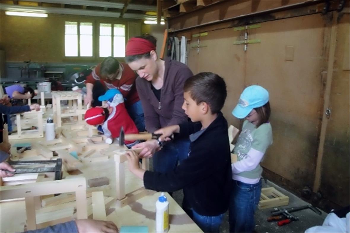Etwas ganz Spezielles erlebten die Kinder beim Besuch von Holzbau Blatti AG. Innert kurzer Zeit entstand unter der Anleitung eines Vaters ein schmuckes Taburettli. Mit grossem Eifer dübelten, schraubten und leimten die Kinder die vorbereiteten Teile zusammen. Am Mittag durfte jedes sein eigenes Stühli mit nach Hause nehmen. Holzbau Blatti spendete grosszügig alles Material und der Vater investierte seine Zeit.