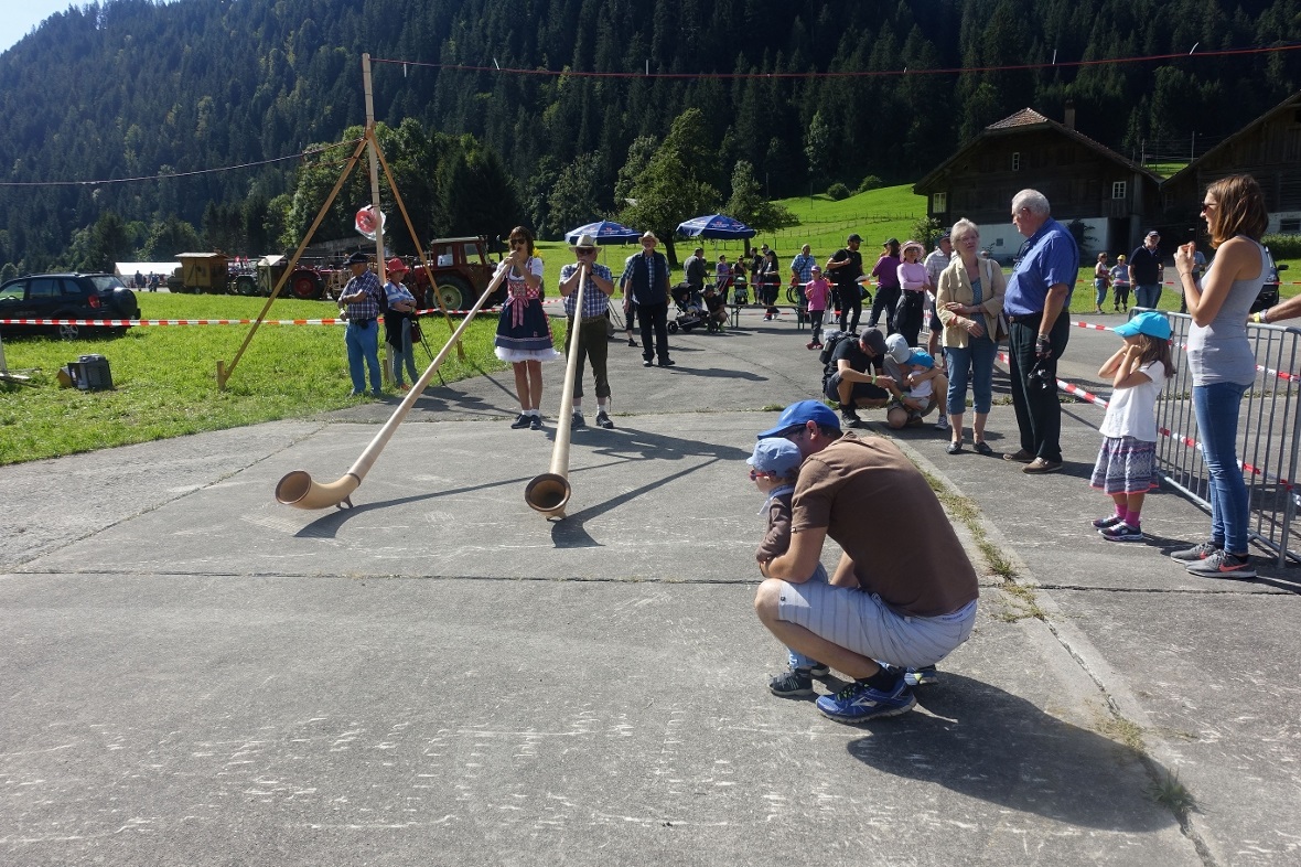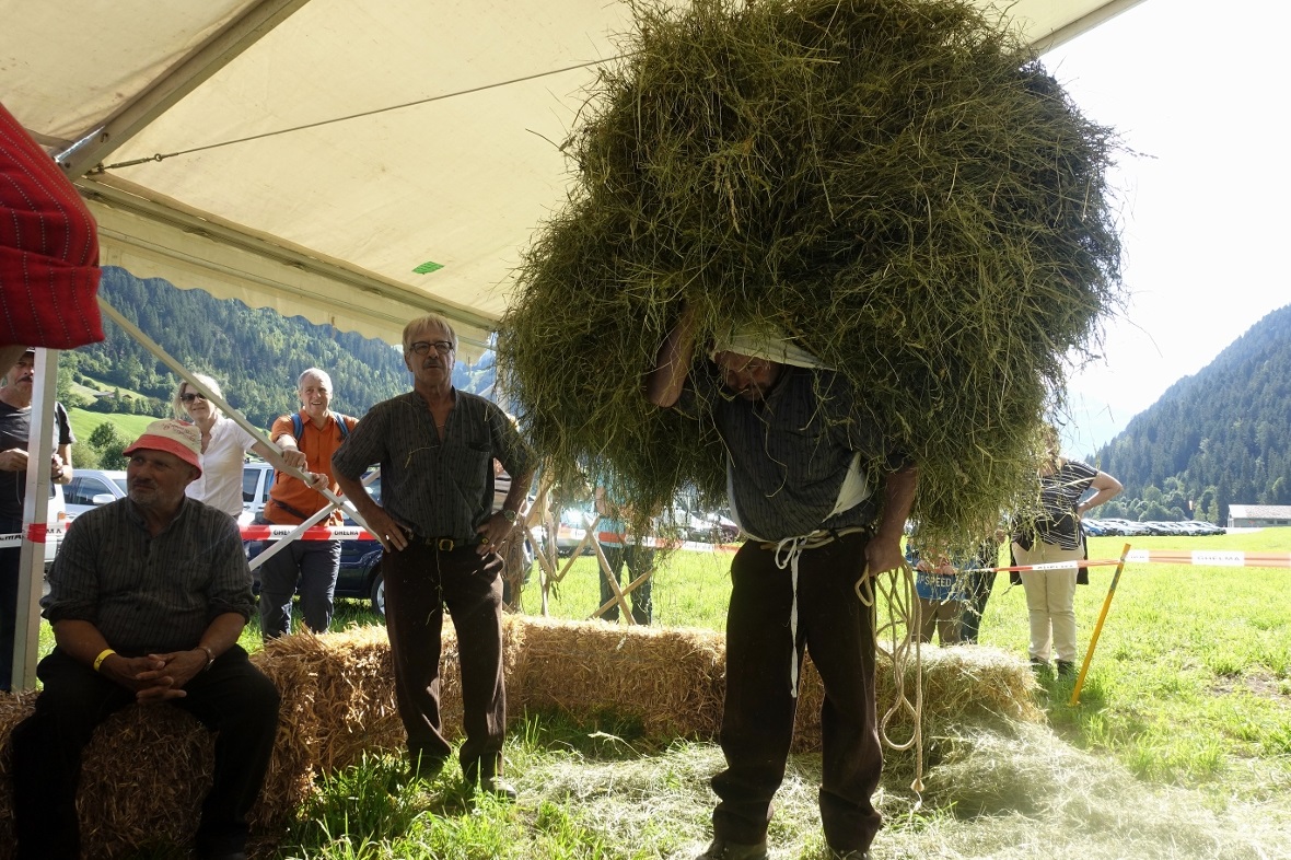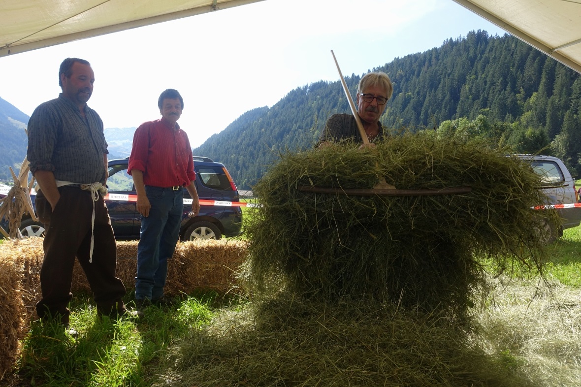 Erstmals wurde heuer auch traditionelles Bergbauern-Handwerk präsentiert: Am Stand der SVP St. Stephan wurden durch urchige Kenner ihres Handwerkes Sensen gedengelt. Einige Zuschauer hatten sogar ihre eigene Sense zum Dengeln mitgebracht. Daneben wurden «Fertleni» gemacht und getragen. Dazu gesellten sich die Oberländer Nationalratskandidaten Erich von Siebenthal, Thomas Knutti und Andreas Michel. Gemeinsam wurde gefachsimpelt, etwas politisiert, viel gelacht und bestimmt auch ein bisschen plagiert. So liess es sich Knutti etwa nicht nehmen, die weisse Traghube anzuziehen und selber ein braves Fertli herumzutragen. Wobei er unter grossem Applaus gehörig ins Schwitzen kam…