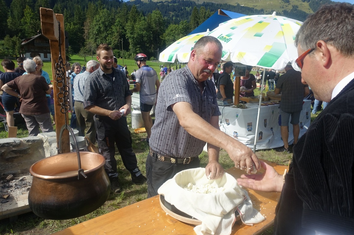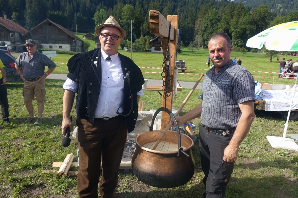 Die Marktstände präsentierten in liebevoller Auslage einheimische Produkte handwerklicher und kulinarischer Art und da durfte selbstverständlich auch das Degustieren des feinen Alpkäses vom Dürrenwald nicht fehlen. Das Käsen wurde auch heuer durch den Bergvogt Chrigel Moor, zusammen mit Sohn Moritz, präsentiert. Auf der mobilen Feuerstelle brachten sie den zahlreichen Interessierten das Käsen näher und Chrigel hatte die «Britsche» im Nu an die vielen Interessierten verteilt.