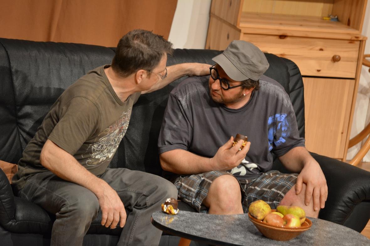 Im Anschluss an die amüsante Komödie machte sich das Duo «Bärnbeat» auf der Theaterbühne bereit und sorgte mit Coverliedern in Mundart und in Englisch für beste Unterhaltung. Joel Poschung an der Gitarre und Housi Wenger auf der Cajonbox holten das Publikum ab und es wurde gemeinsam gesungen, was die Stimmbänder hergaben. Mit «Country Roads» starteten sie den Abend und beendeten ihn zu später Stunde auch wieder, was die verbliebenen Festbesucher nicht daran hinderte, das MC-Fest an der Racingbar noch weiter gemütlich ausklingen zu lassen. Ein rundum gelungener Theaterabend – «Bisch sicher?» – aber gewiss doch!