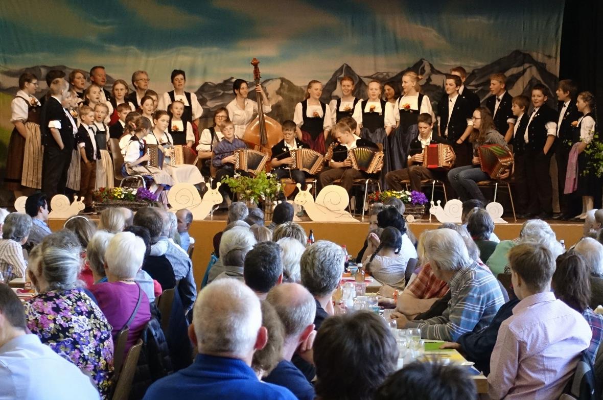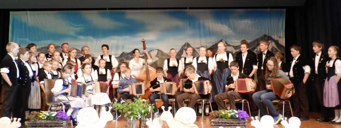 Die jungen Schwyzerörgeler der Musikschule Saanenland-Obersimmental eröffneten den ersten Konzertteil auf der mit hölzernen Schnecken fröhlich dekorierten Bühne.