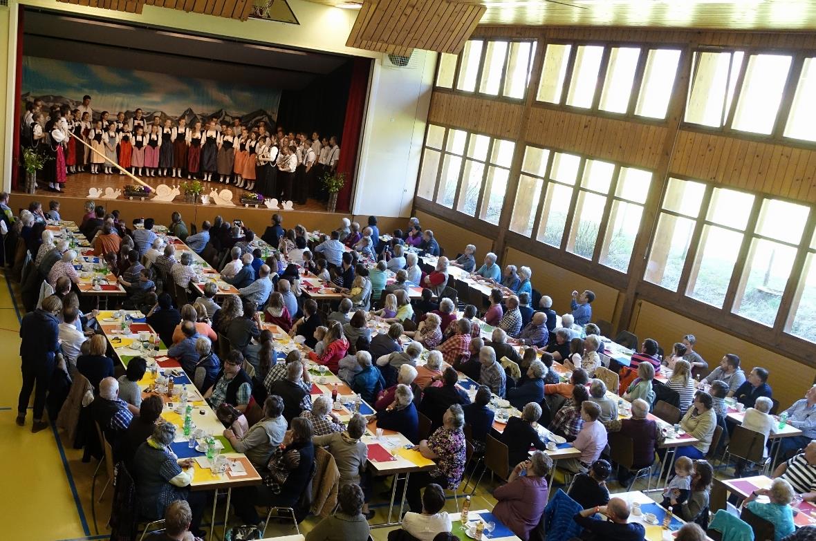 Zur Überraschung des frühstückenden Publikums trat das anwesende 38-köpfige Jugendjodelprojekt Unspunnen ohne Ansage kurz nach neun Uhr auf dem Balkon auf und trug eindrücklich das Lied «Üse Vater» von Peter Roth vor. Anschliessend begrüsste Präsidentin Yvonne Krähenbühl das Publikum herzlich und übergab an die einheimischen Geschwister Anja und Manuel Rösti, welche wie alte Routiniers souverän durch das Programm der beiden Konzertteile führten und zwischendurch zur Freude des Publikums gar noch den einen oder anderen Witz zum Besten gaben.