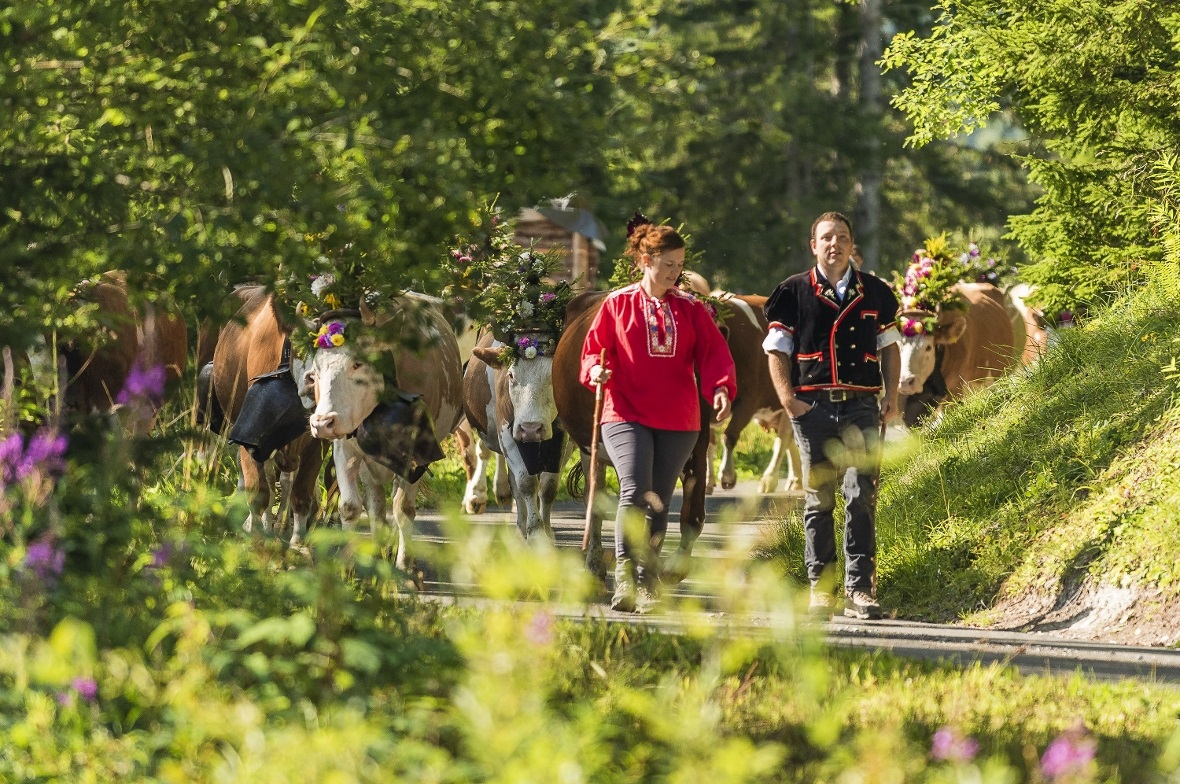 «Heute sind die Kühe die ‹Hauptpersonen›», sagte Veronika Zumbrunnen entschieden. «Ich glaube, dass die Alpkühe, die jedes Jahr zügeln, merken, dass heute ein besonderer Tag ist. Es liegt eine gewisse Nervosität und Spannung in der Luft, es ist nicht nur für die Menschen, sondern auch für die Tiere ein grosser Anlass. Die Tiere gehen gerne auf den Berg, aber auch gerne wieder ins Tal. Sie tragen den Kopfschmuck und die grossen Treicheln mit Stolz. Den Blumenstrauss an meiner Tracht habe ich gestern extra auf dem Flöschhorn geholt, sodass auch wir an der Tracht einen Strauss vom Dürrenwald haben.»