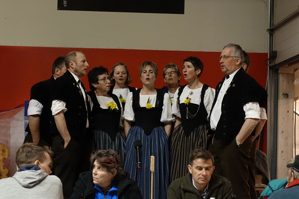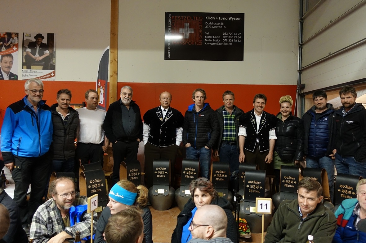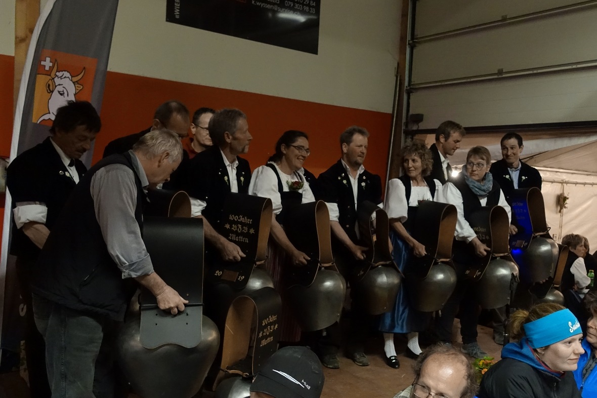 Anlässlich des gut besuchten Züchterabends spielte das Schwyzerörgeliquartett Stockhornblick flott auf, während die Jodlergruppe Simmenfall Lenk mit ihrem feinen Jodelgesang die Zuhörenden erfreute. Allen VZV-Mitgliedern wurde eine wunderschöne Treichel als Ehrenpreis durch die Spender übergeben. Auch die zwölf Jungzüchter erhielten eine Glocke überreicht, bevor sie den Betrieb in der vorübergehend zu einer Bar umgewandelten AFA-Halle aufnahmen. Mit guten Drinks und der stimmigen Musik von DJ Hene ging die Party bis in den frühen Sonntagmorgen und schloss die Jubiläumsschau des Viehzuchtvereins Matten gemütlich ab.