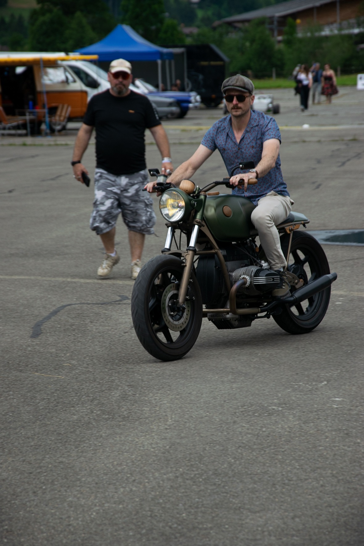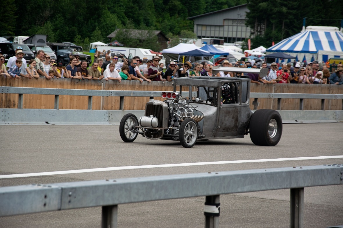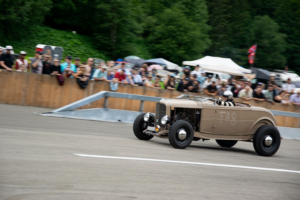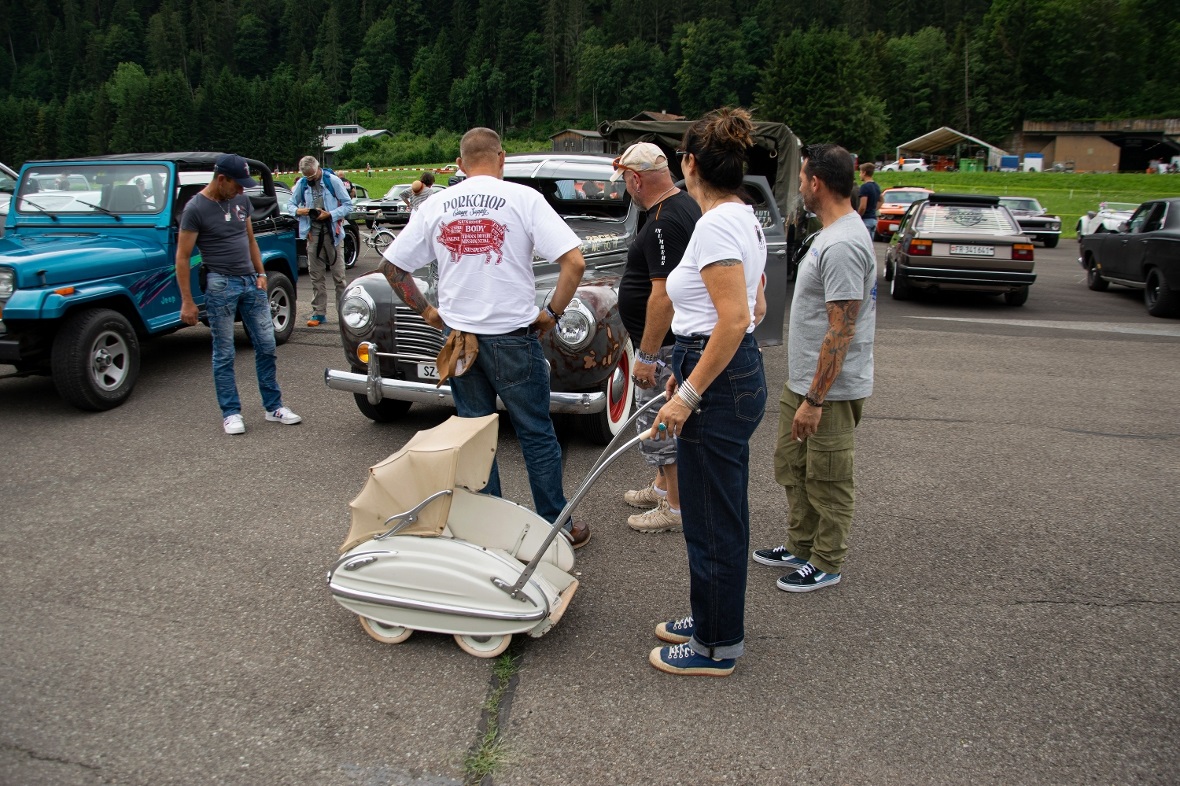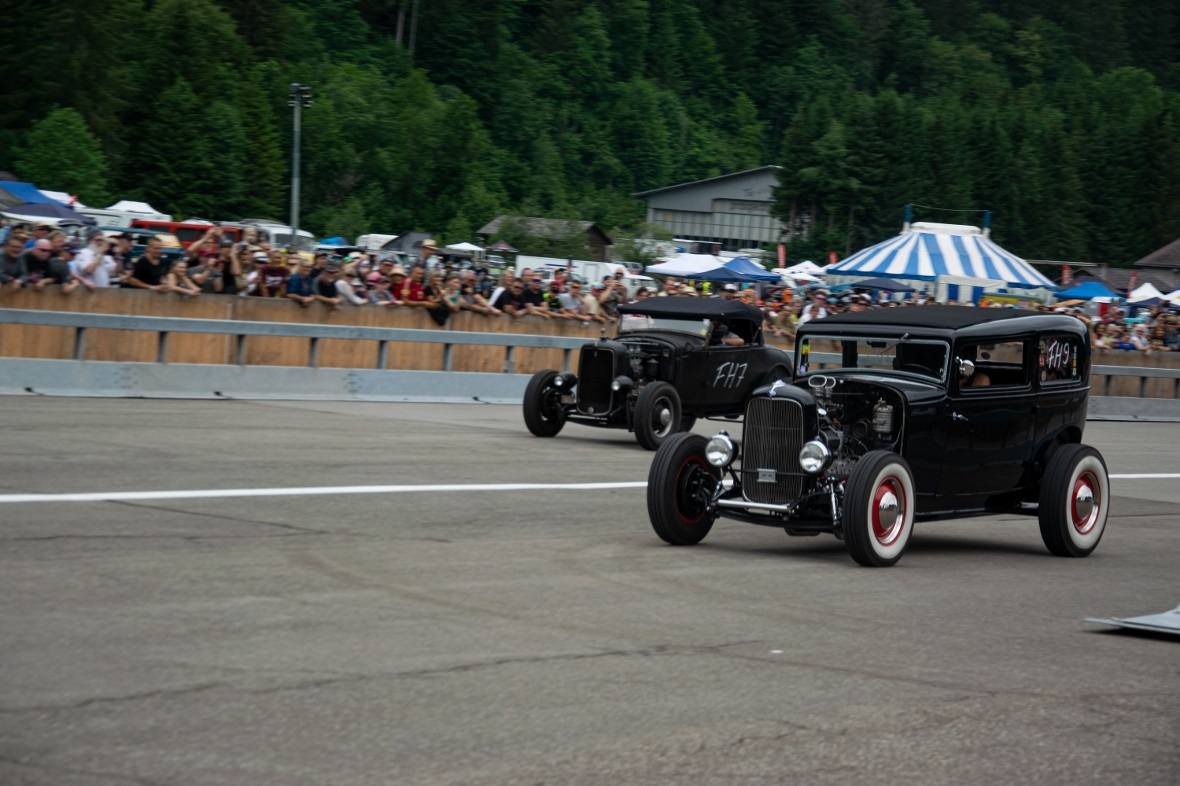 «Ich war letztes Jahr schon da, jetzt habe ich die Jungs mitgenommen», sagte Tom vom Club Silberfischla aus Pforzheim (DE). «Sechs Männer und sechs Autos, darunter ein Ford 1936, ein Pick-up, ein Chevrolet und ein Nash Ambassador. Die Location ist schön, die Leute sind mega nett und cool!» Zwei Frauen mit aufgesetzten Haaren und in geblümten Röcken sassen auf Campingstühlen in der Hotrod- und Customzone. «Wir sind nur als Dekoration da!», schmunzelten die beiden. Sie waren in einem seltenen Coupé mit Baujahr 1930 angerollt, der Hotrod gehörte Michi aus Menziken (AG): «Es ist das erste Fordmodell mit einem V8-Motor, im Sommer wird es innen unglaublich heiss. Ich bin zum ersten Mal da, es ist super, gute Autos, gute Musik, guter Rennbetrieb!»
