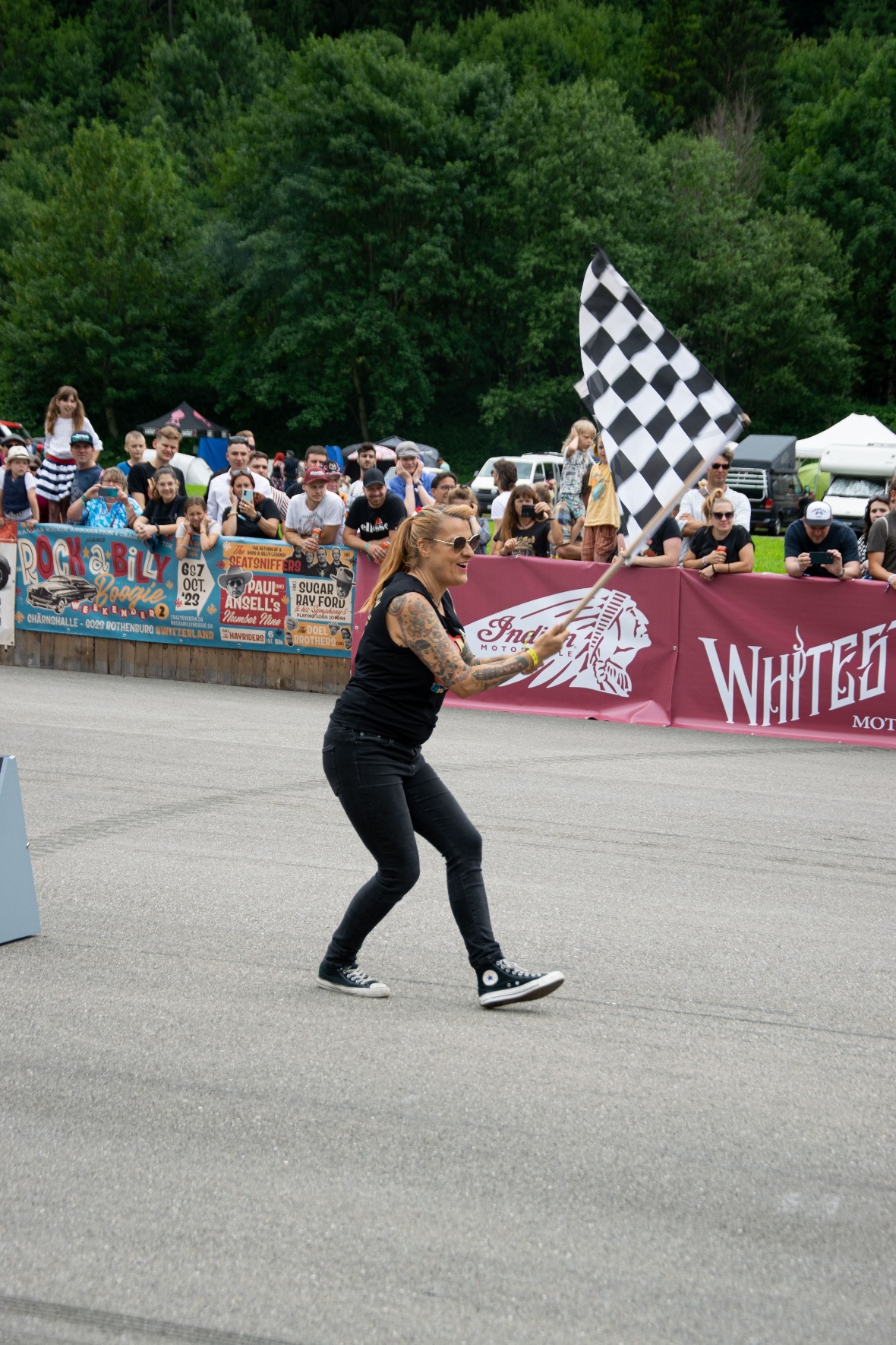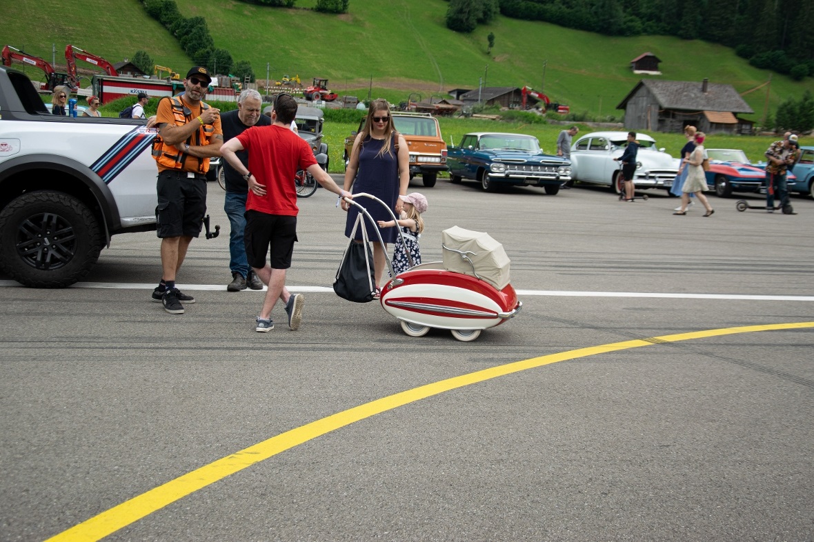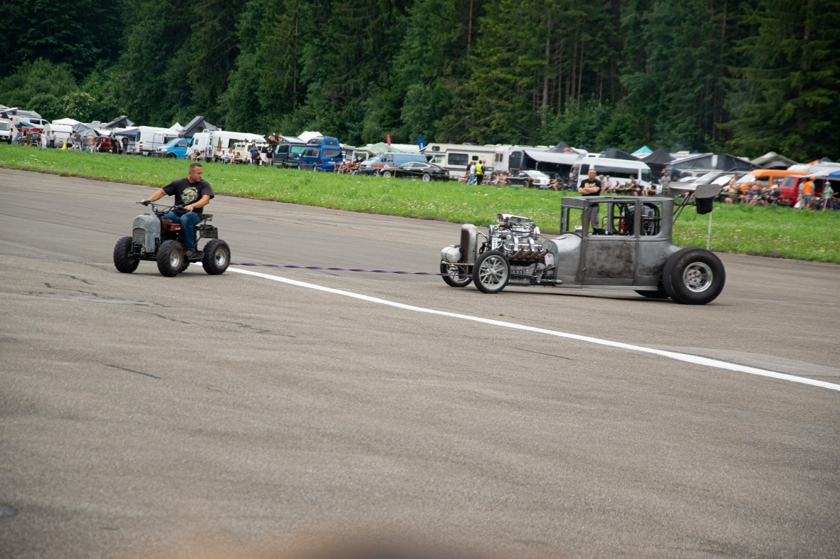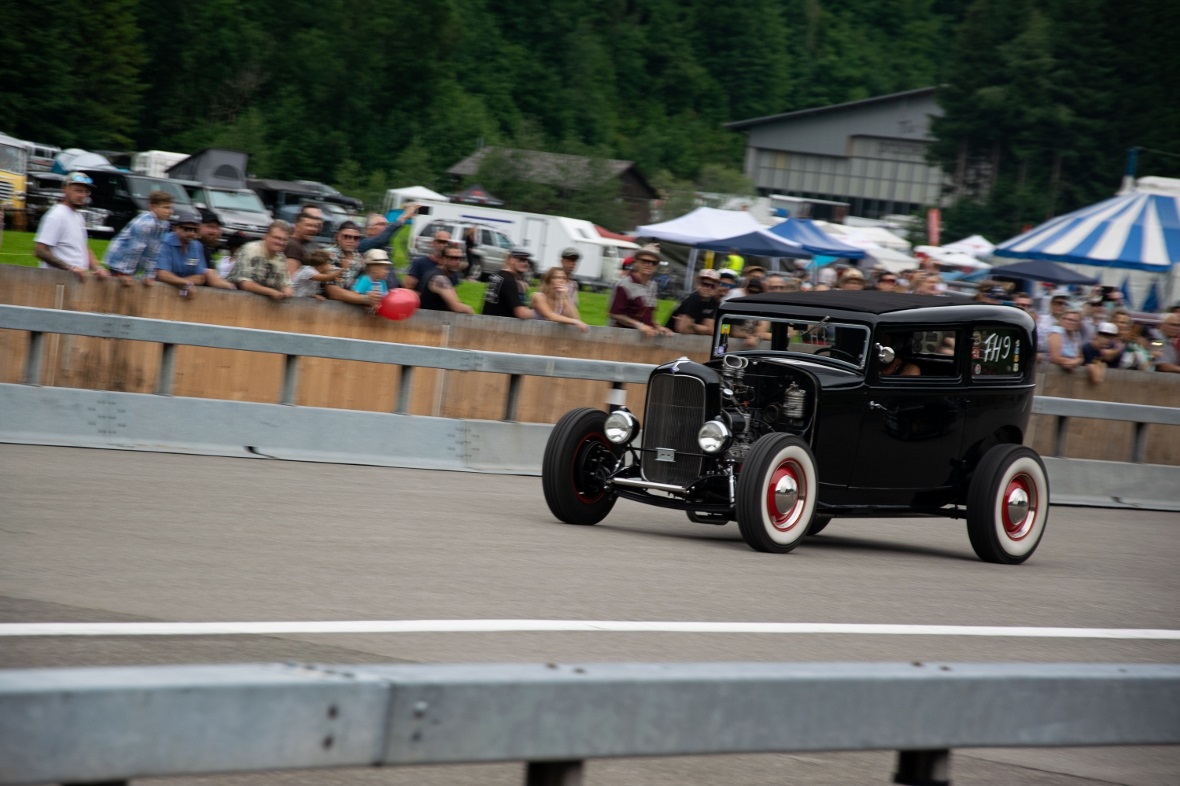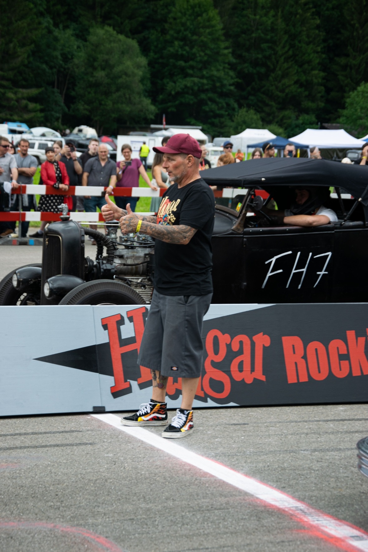 «Ich war letztes Jahr schon da, jetzt habe ich die Jungs mitgenommen», sagte Tom vom Club Silberfischla aus Pforzheim (DE). «Sechs Männer und sechs Autos, darunter ein Ford 1936, ein Pick-up, ein Chevrolet und ein Nash Ambassador. Die Location ist schön, die Leute sind mega nett und cool!» Zwei Frauen mit aufgesetzten Haaren und in geblümten Röcken sassen auf Campingstühlen in der Hotrod- und Customzone. «Wir sind nur als Dekoration da!», schmunzelten die beiden. Sie waren in einem seltenen Coupé mit Baujahr 1930 angerollt, der Hotrod gehörte Michi aus Menziken (AG): «Es ist das erste Fordmodell mit einem V8-Motor, im Sommer wird es innen unglaublich heiss. Ich bin zum ersten Mal da, es ist super, gute Autos, gute Musik, guter Rennbetrieb!»