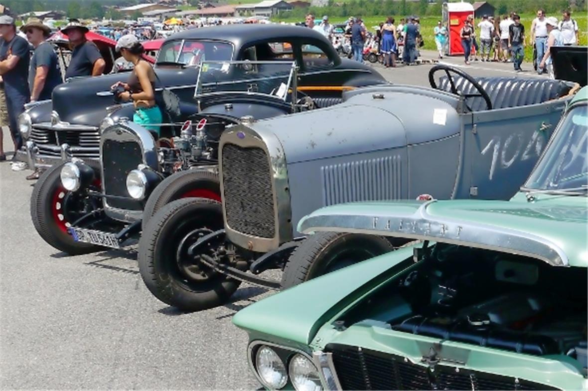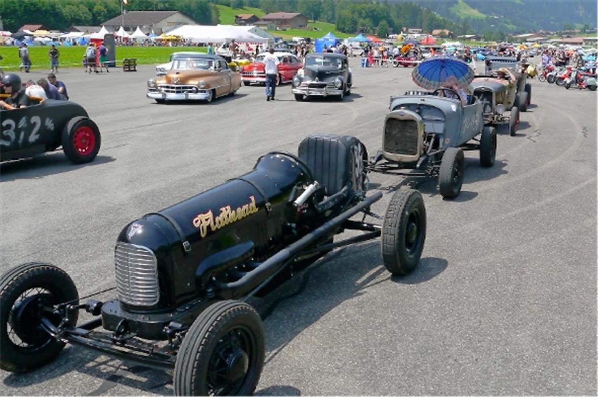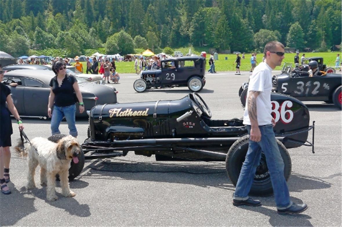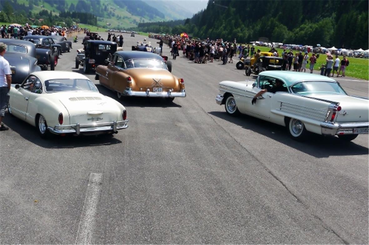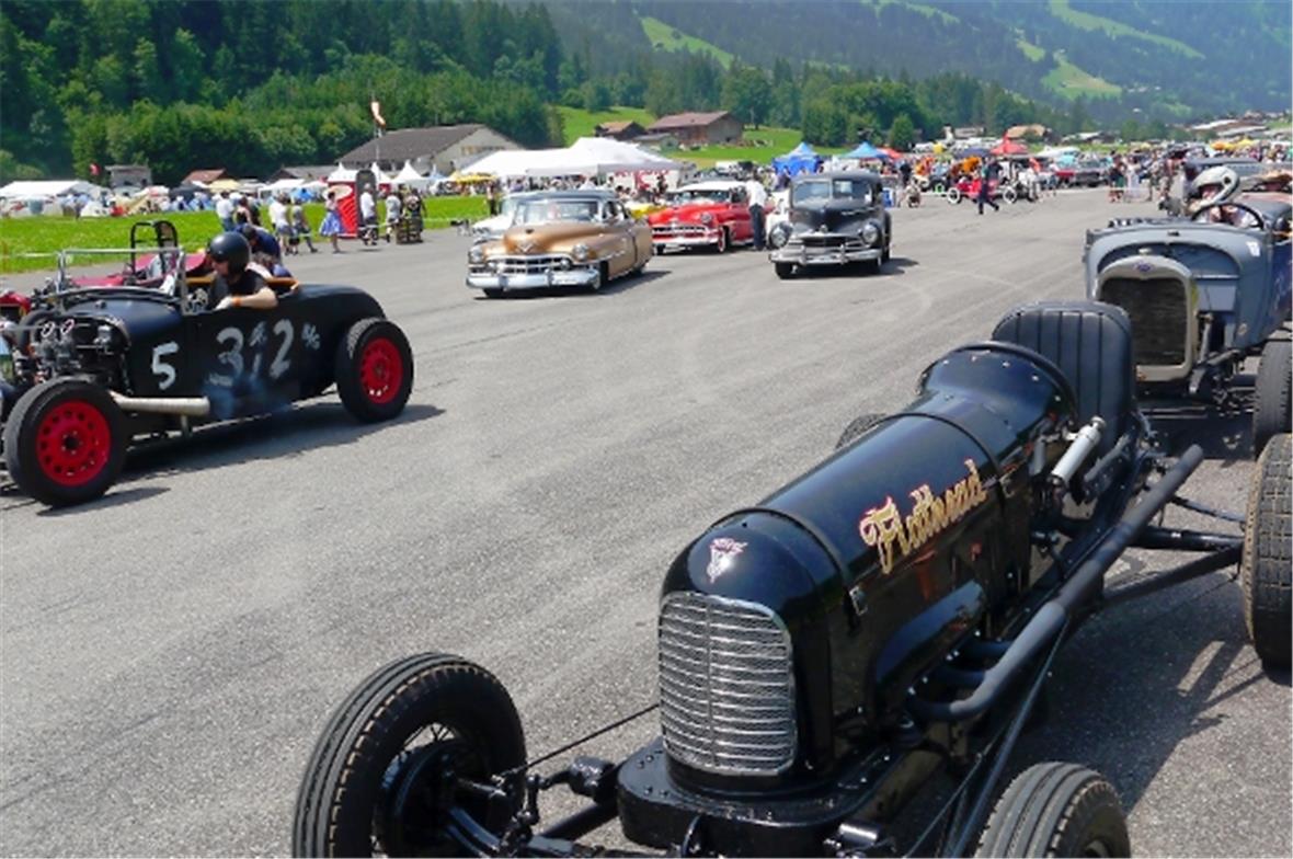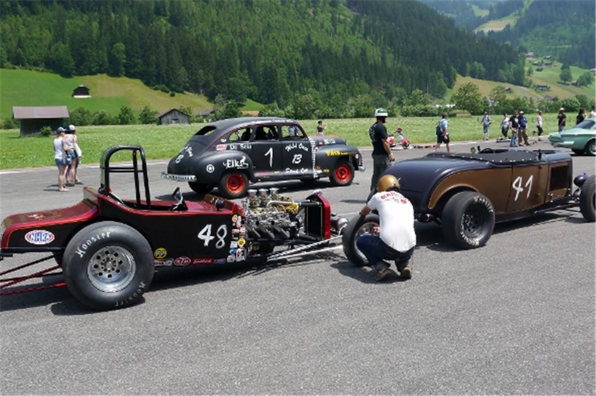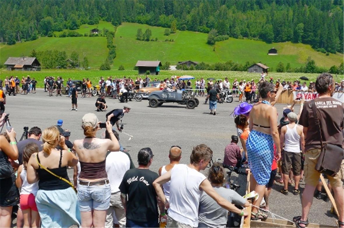 Am Samstag schon in der Morgenfrühe entstand der Jahrmarkt rund um das Oldtimer Rennen und die ersten Oldtimer versuchten auf der offenen Piste die Achtelmeile zu schaffen. Hier liess mal eine Bezinpumpe, dort gab ein Fallstromvergaser den Geist auf und gäbe es nicht eine ganze Menge hilfsbereiter Oldtimer Spezialisten unter den Besitzern, würde ein solches Treffen zum Chaos. Der Zusammenhalt unter den Leuten prägte das Fest. Man diskutierte, beriet sich und half Schäden zu bereinigen, schlenderte über den Markt und hörte sich die Rocker im Hangar an. Ein friedliches Fest, ein Treffen von Leuten aus aller Welt und das vor unserer wunderbaren Bergkulisse.