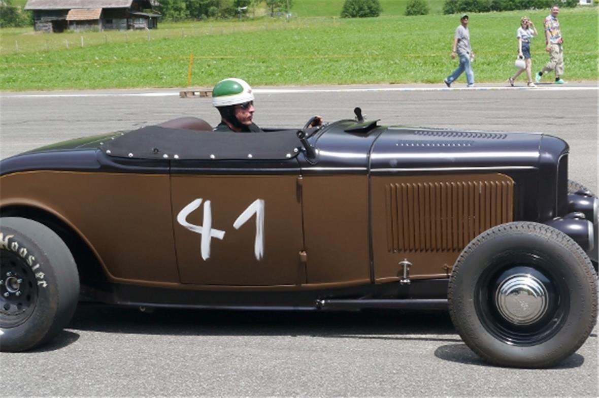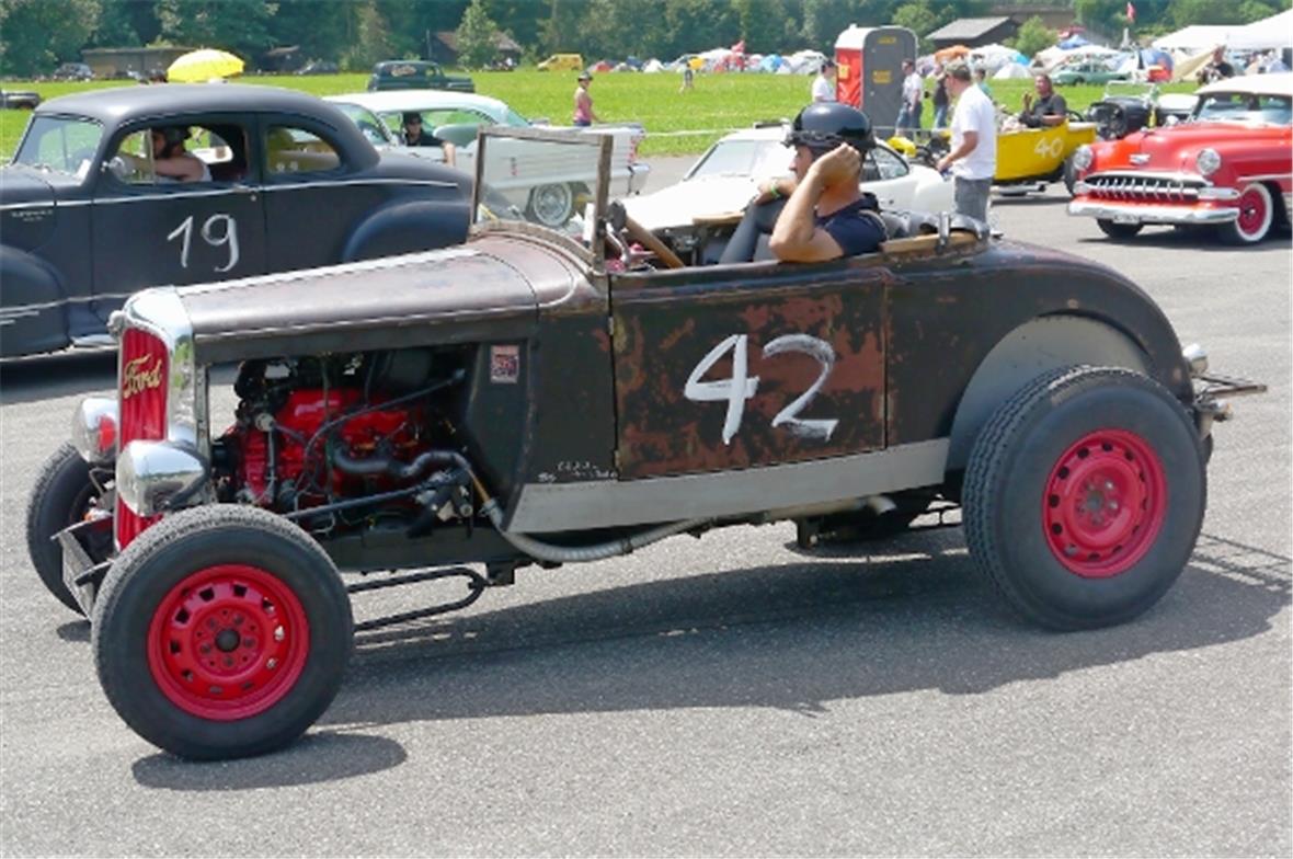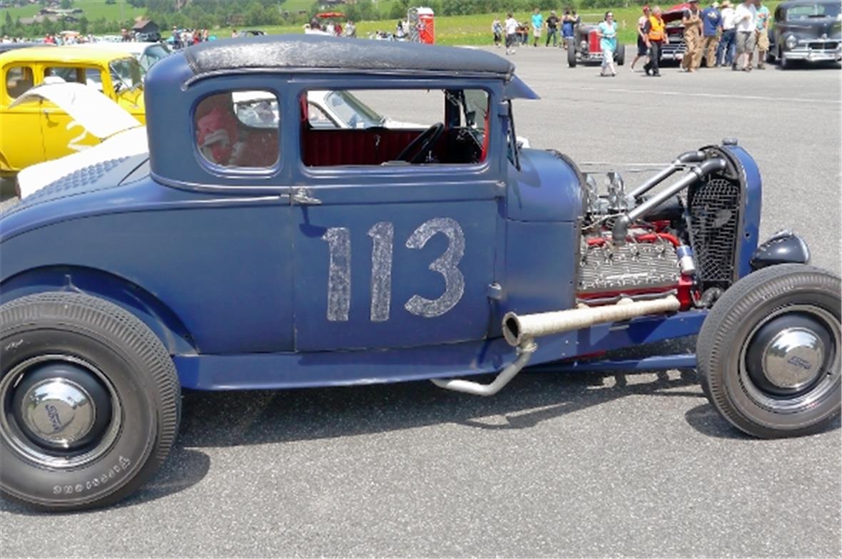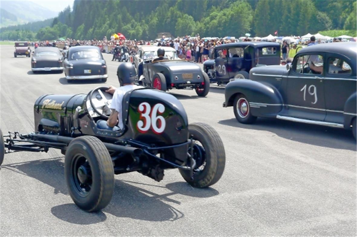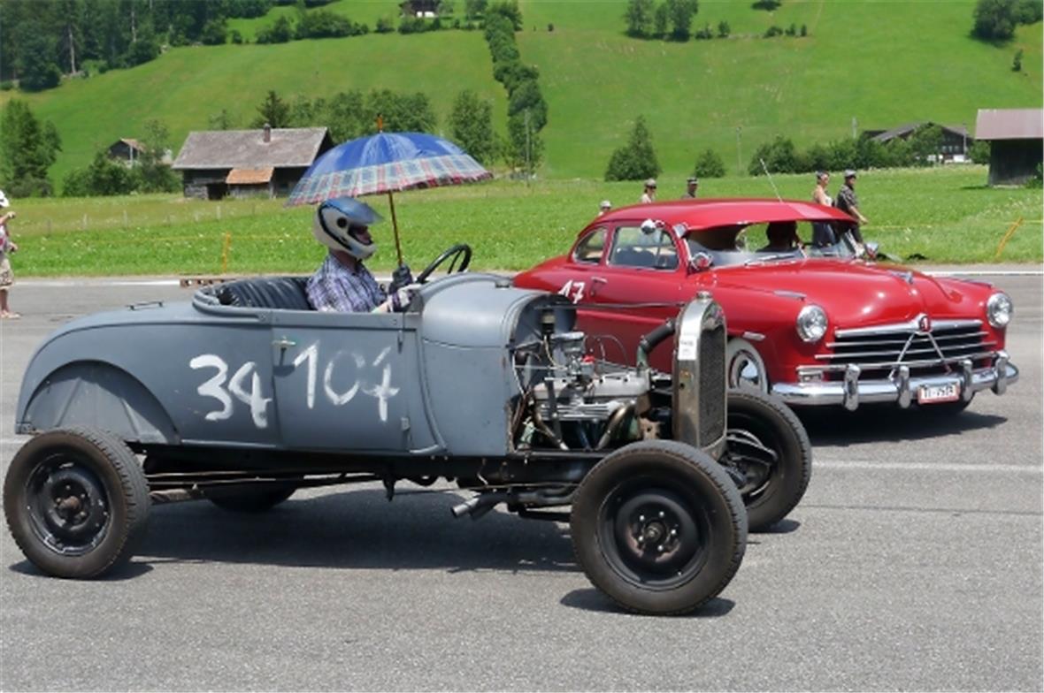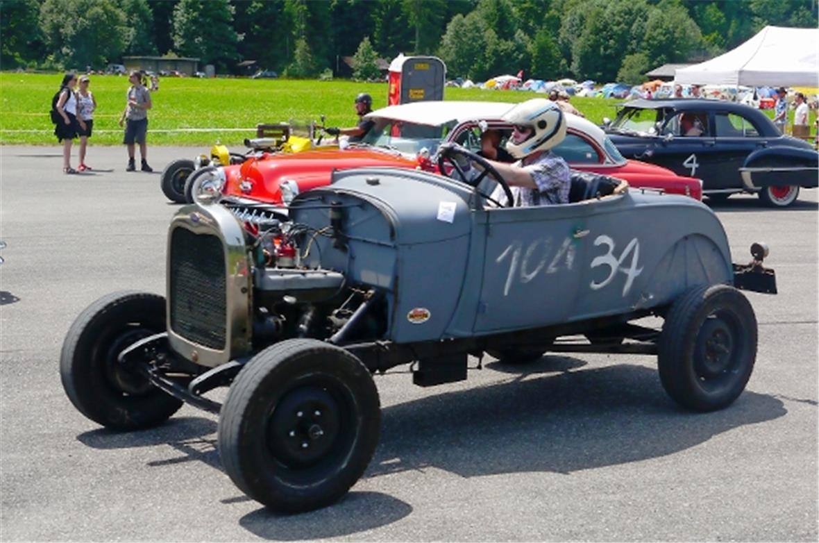 Am Samstag schon in der Morgenfrühe entstand der Jahrmarkt rund um das Oldtimer Rennen und die ersten Oldtimer versuchten auf der offenen Piste die Achtelmeile zu schaffen. Hier liess mal eine Bezinpumpe, dort gab ein Fallstromvergaser den Geist auf und gäbe es nicht eine ganze Menge hilfsbereiter Oldtimer Spezialisten unter den Besitzern, würde ein solches Treffen zum Chaos. Der Zusammenhalt unter den Leuten prägte das Fest. Man diskutierte, beriet sich und half Schäden zu bereinigen, schlenderte über den Markt und hörte sich die Rocker im Hangar an. Ein friedliches Fest, ein Treffen von Leuten aus aller Welt und das vor unserer wunderbaren Bergkulisse.