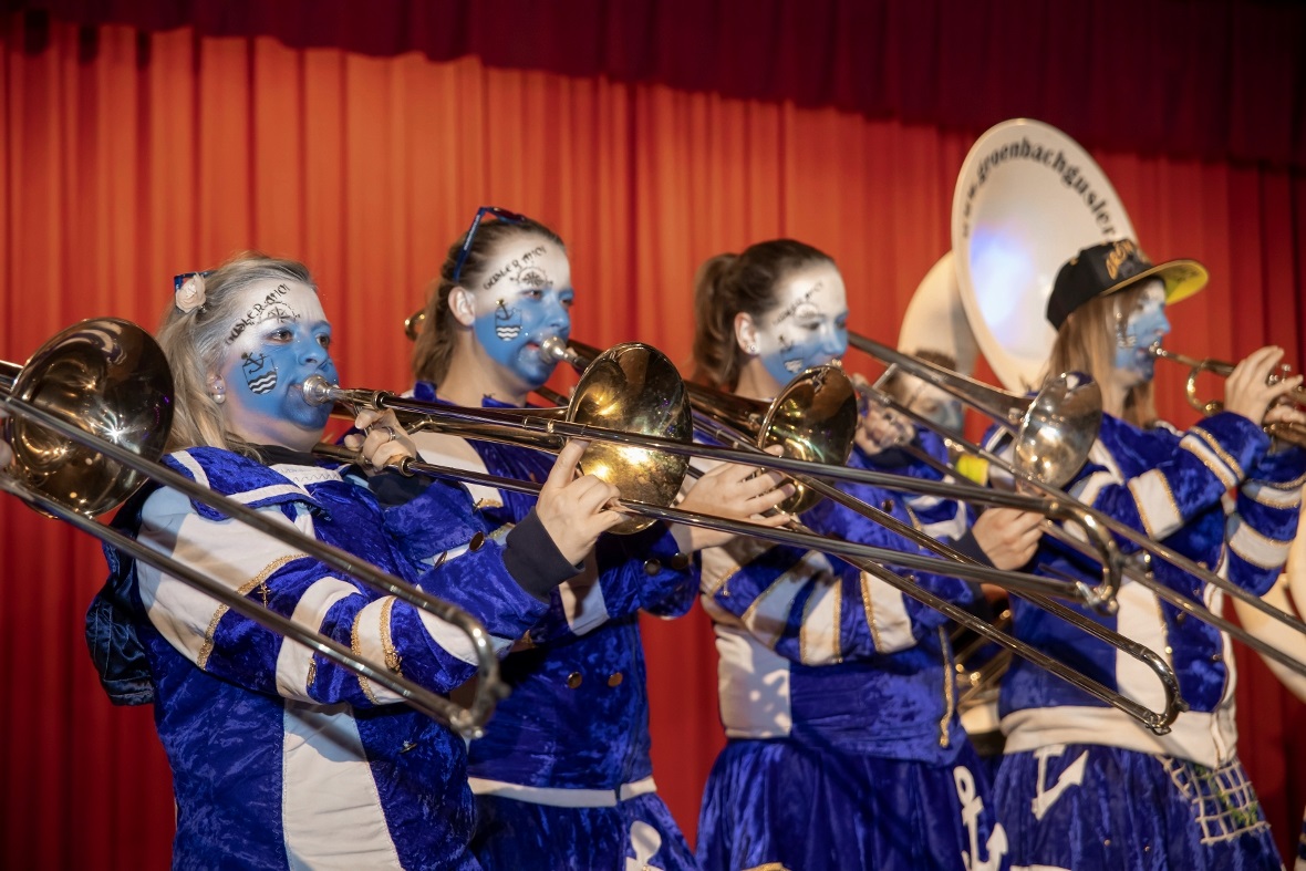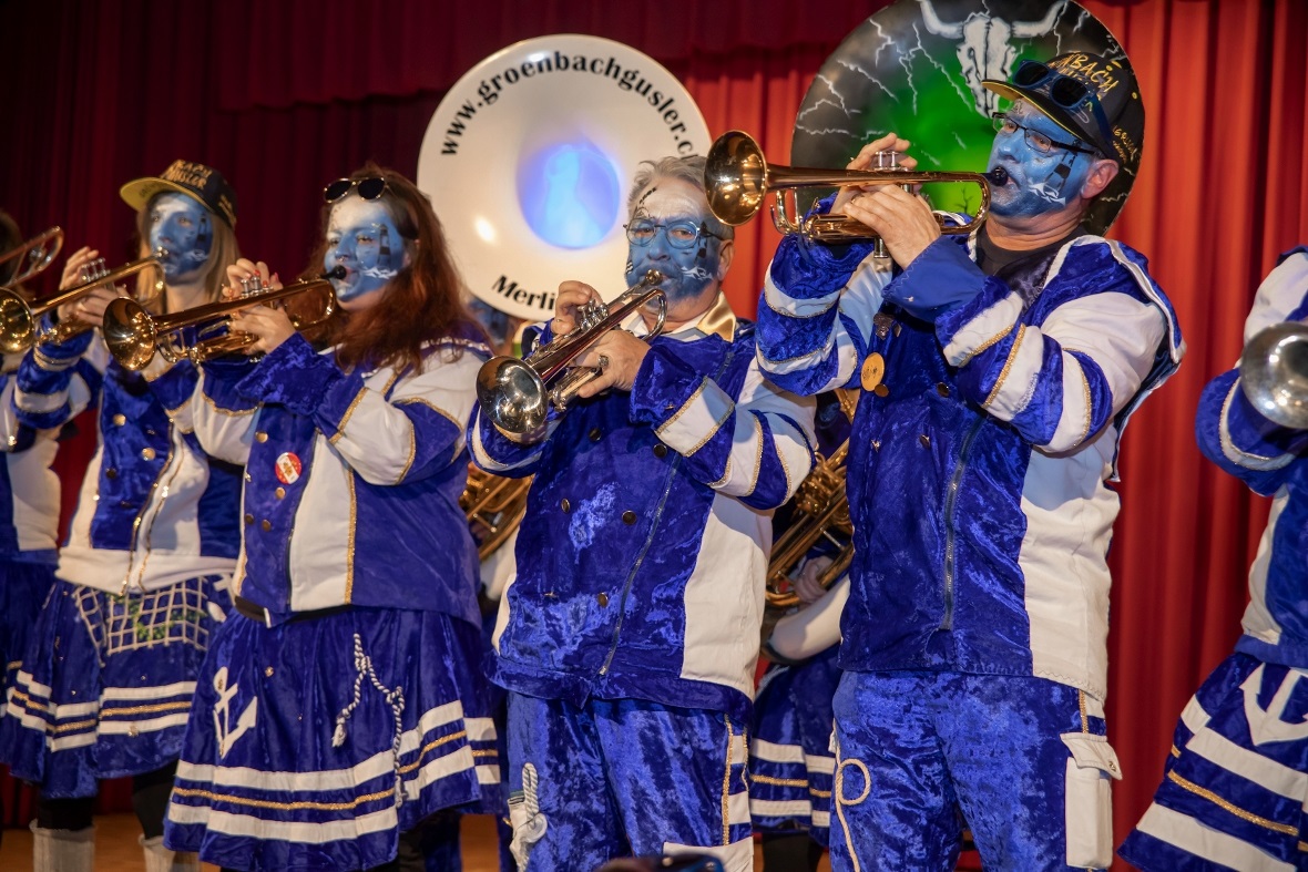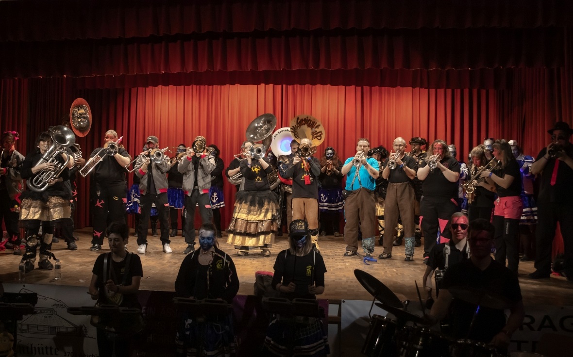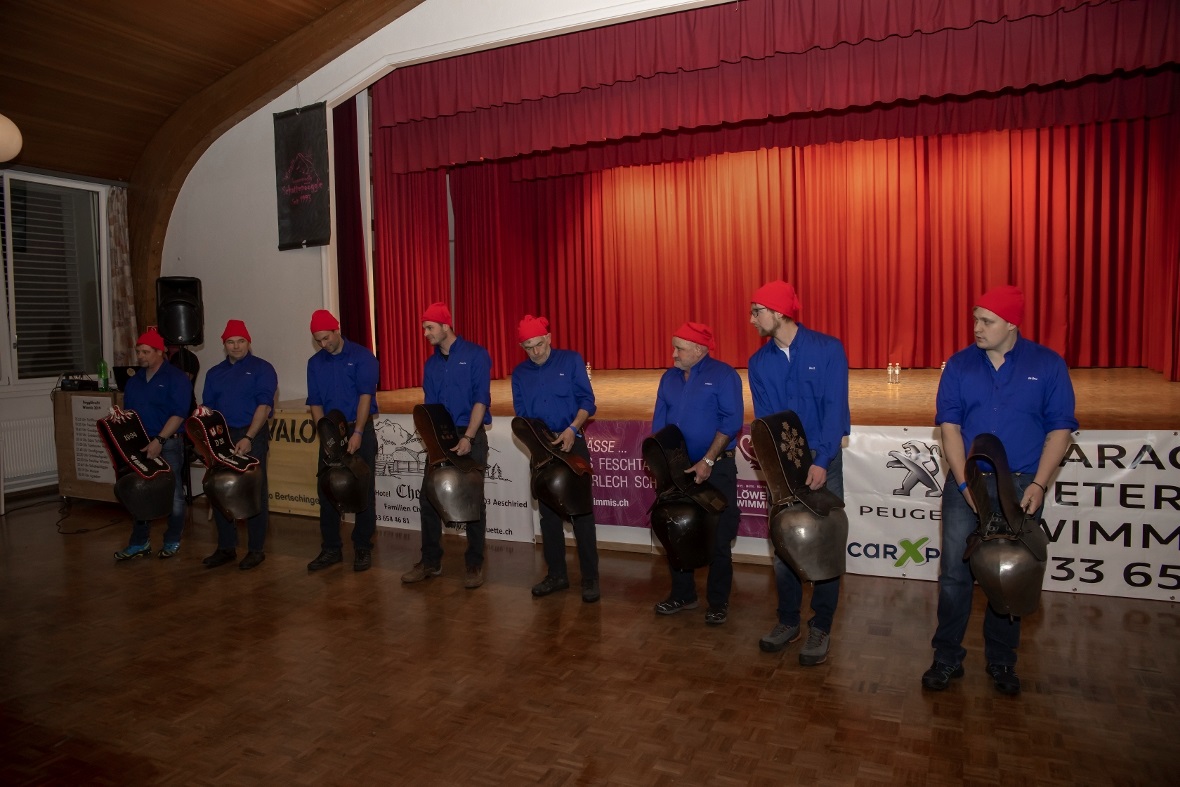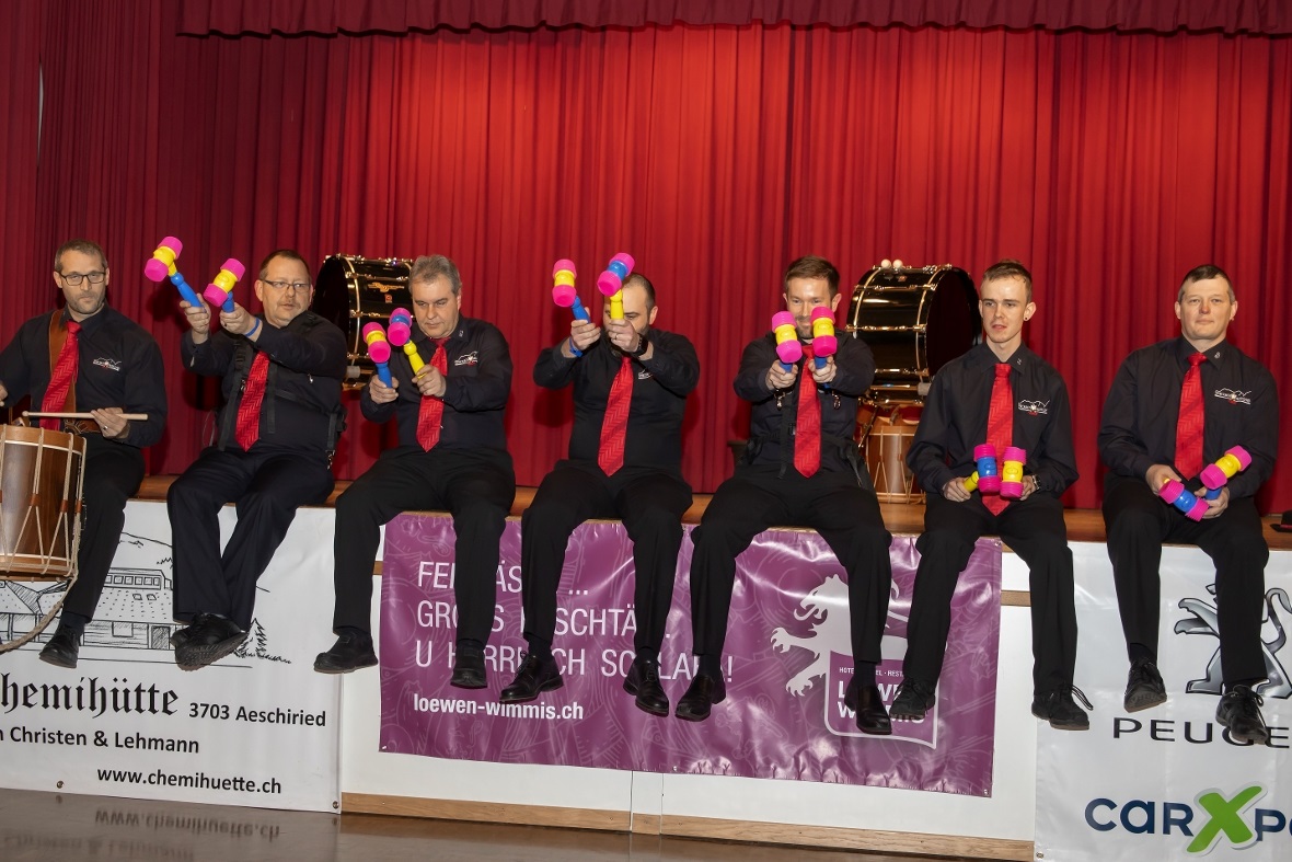 Mit lauten allerdings angenehmen «Lärm» in Form von grossen Treicheln eröffneten die Treichlerfründe Wimmis den Abend. Mit den Treicheln werden ja symbolisch die bösen Geister in der dunklen Jahreszeit vertrieben. Am Samstagabend gab es allerdings nur gute Geister in der Aula Chrümig in Wimmis. Danach ging es wortwörtlich mit Pauken und Trompeten Schlag auf Schlag. «Wir spielen von A-Z jede Musikrichtung. Wir sind eine sehr aufgestellte Gruppe und mit uns kann man Spass haben. Wir freuen geniessen jetzt einfach noch jeden Auftritt in dieser Saison» so die Goldiguuger Goldiwil kurz vor ihrem Auftritt. Und schon ging es quer durchs Publikum zur Bühne. Stücke wie «Good by my love, good by» oder «Achy Breaky Heart» wurden vorgetragen. Es folgten die Grönbachgusler Merligen die mit «Swiss Lady» oder «Stets im Truure« zum Besten gaben. Die Uetendorfer Säins Tschikken brachten Stücke wie «Up in the Sky» oder «Last Night on Earth» zu Gehör. Die eigene spezielle Art falsch bzw. recht schräg zu spielen, macht genau den Reiz für die Zuhörer aus. Keine Blasmusik, dafür genauso schräg kamen die Tambouren vom Frutigland daher.