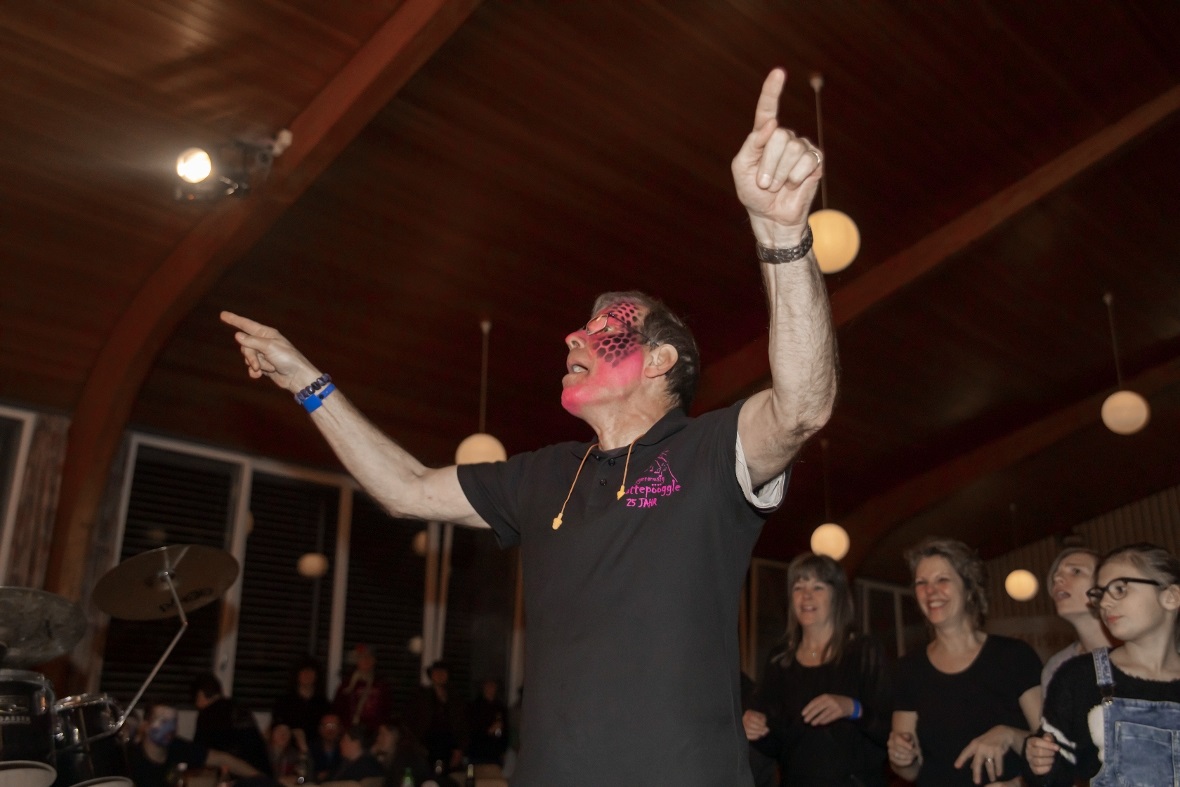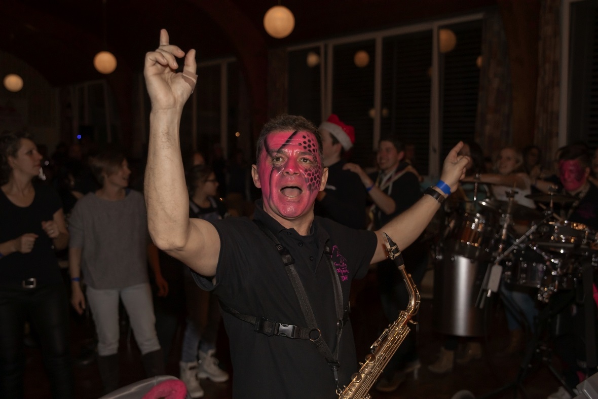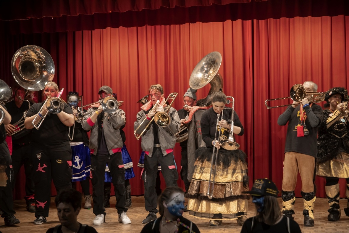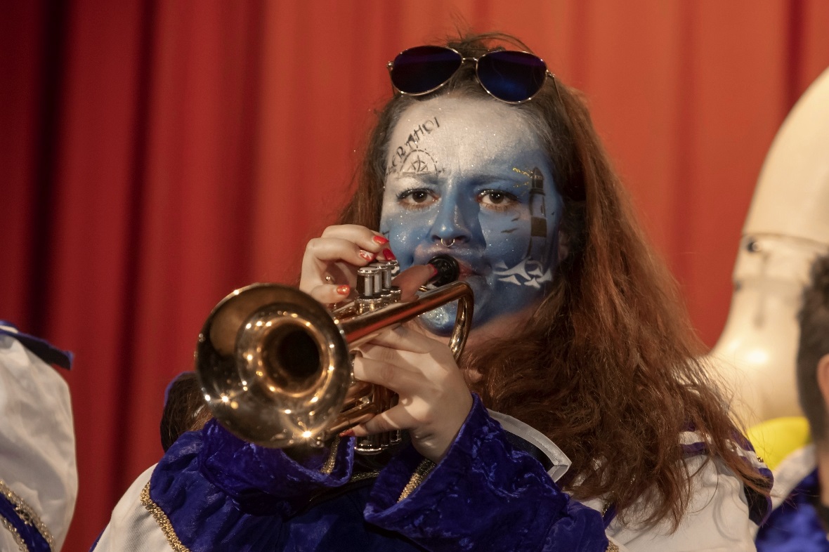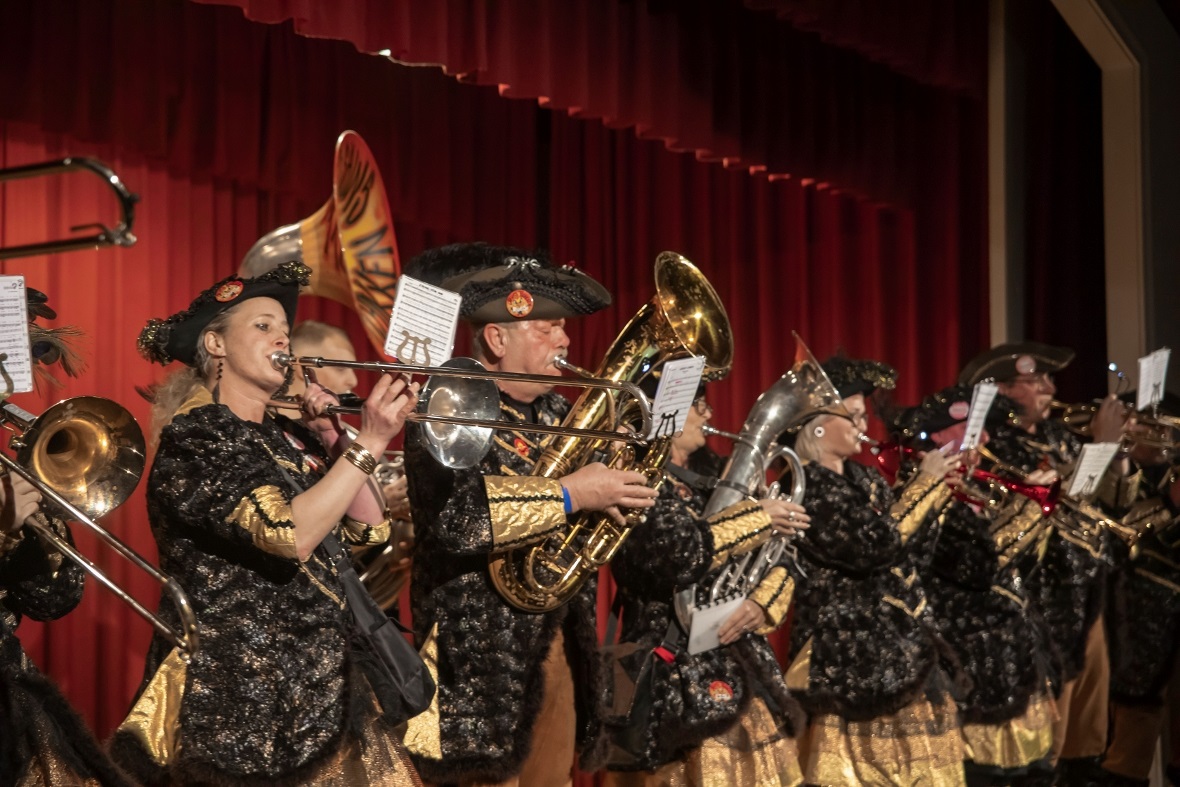 Mit lauten allerdings angenehmen «Lärm» in Form von grossen Treicheln eröffneten die Treichlerfründe Wimmis den Abend. Mit den Treicheln werden ja symbolisch die bösen Geister in der dunklen Jahreszeit vertrieben. Am Samstagabend gab es allerdings nur gute Geister in der Aula Chrümig in Wimmis. Danach ging es wortwörtlich mit Pauken und Trompeten Schlag auf Schlag. «Wir spielen von A-Z jede Musikrichtung. Wir sind eine sehr aufgestellte Gruppe und mit uns kann man Spass haben. Wir freuen geniessen jetzt einfach noch jeden Auftritt in dieser Saison» so die Goldiguuger Goldiwil kurz vor ihrem Auftritt. Und schon ging es quer durchs Publikum zur Bühne. Stücke wie «Good by my love, good by» oder «Achy Breaky Heart» wurden vorgetragen. Es folgten die Grönbachgusler Merligen die mit «Swiss Lady» oder «Stets im Truure« zum Besten gaben. Die Uetendorfer Säins Tschikken brachten Stücke wie «Up in the Sky» oder «Last Night on Earth» zu Gehör. Die eigene spezielle Art falsch bzw. recht schräg zu spielen, macht genau den Reiz für die Zuhörer aus. Keine Blasmusik, dafür genauso schräg kamen die Tambouren vom Frutigland daher.