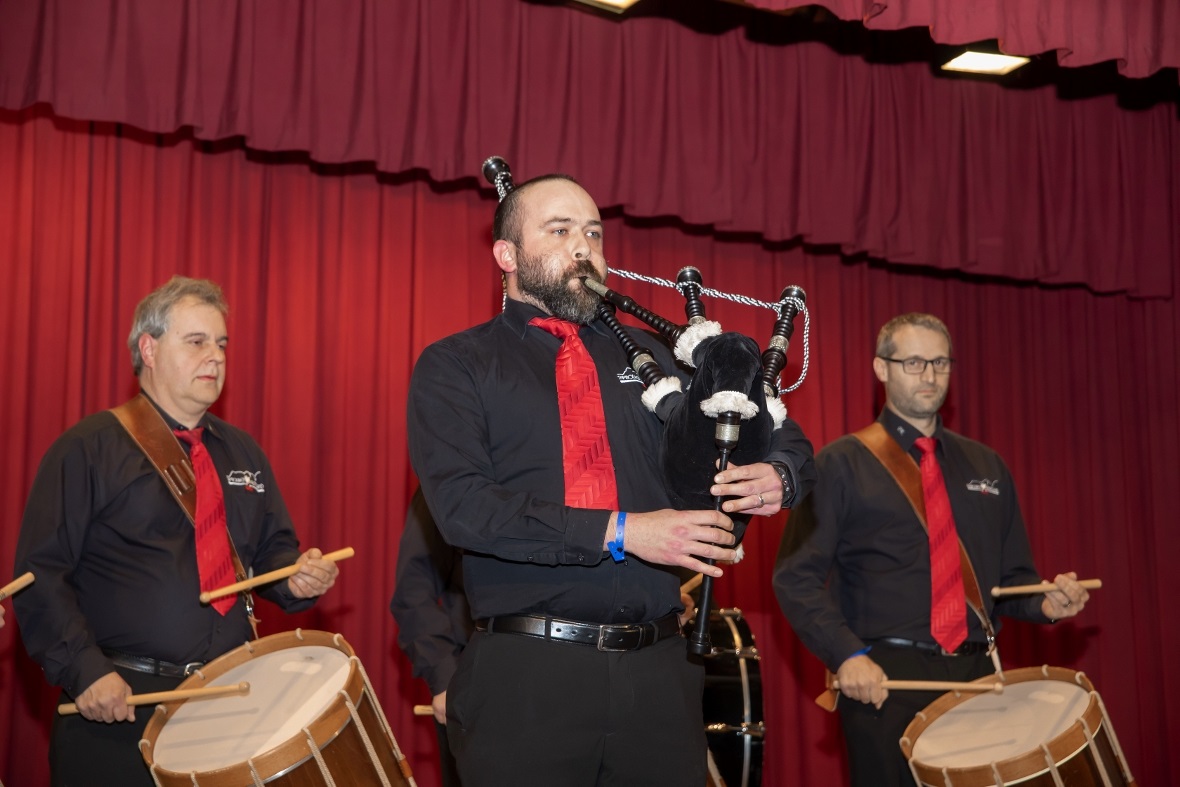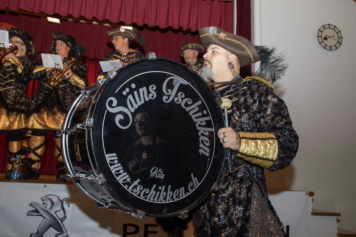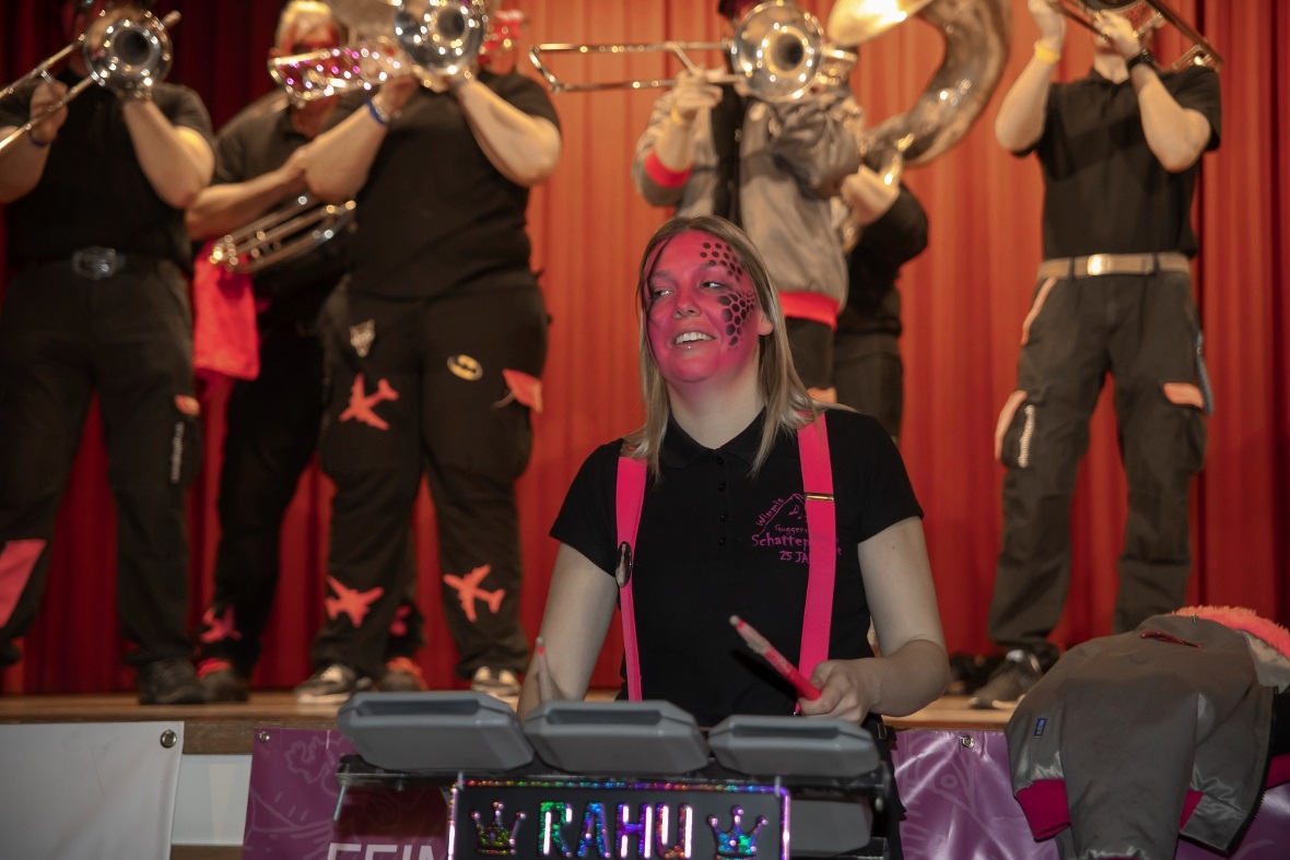 Die Tambouren standen im schräg sein, den Guggenmusikern in nichts nach. Ganz normal liessen die Tambouren es angehen. Um dann mit einem Dudelsack aufzutrumpfen. Mit «Scottland the Grace» und «a 100 Pipers» brachten die Tambouren den Saal zum Kochen. Stücke wie «Lets go Drumms« oder «Dont fall of Paris» kamen perfekt an. Als sich dann alle auf den Bühnenrand setzten um dann beidhändig mit Hämmerlis zum Takt von einer Trommel Töne zu erzeugen, waren die Besucher völlig aus dem Häuschen. Wie im richtigen Leben kommt das Beste immer «fast» zum Schluss. Die Guggenmusik Schattepööggle machten die Halle zu einem Tollhaus.