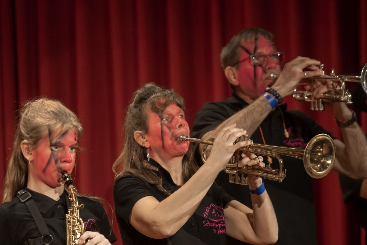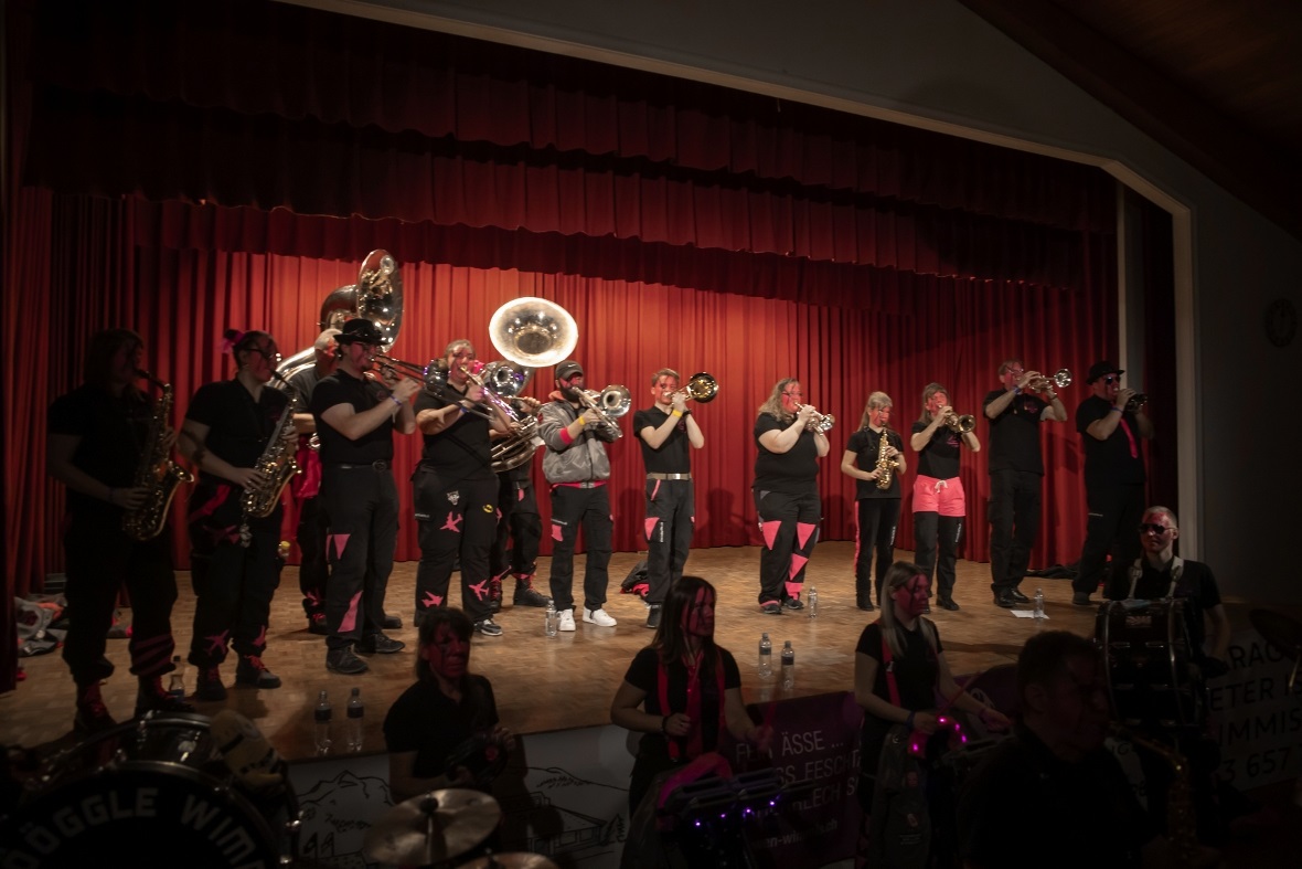 Bis 23:45 Uhr mussten sich die Besucher gedulden, ehe die einheimischen ihren Auftritt absolvierten. Und der hatte es in sich. Man musste zwei Mal hinschauen als die Guggenmusik Schattepööggle loslegten mit «Yesterday Man« oder dem «Jail House Rock». Alle Besucher standen Hautnah vor den Musikern, sangen, tanzten und klatschten mit. Man hatte das Gefühl hier werden Megastars gefeiert. Nicht zu Unrecht nach dem was noch kommen sollte. Drei neue Stücke «Castle of Glass», «Uf de Alpe obe» und «Rock mi» wurden noch vorgestellt. Die Dirigenten Heiner Graber und Andreas Rubin gaben alles um das Publikum und die Musiker zu Höchstleistungen anzutreiben. Es war unglaublich was da noch für ein Power bei den Besuchern steckte. Beim Anblick der tanzenden Leute freute sich die Präsidentin Rahel Schmid und musste immer wieder Lächeln. Als Abschlussbouquet kamen alle Formationen auf und vor die Bühne zusammen um noch einmal mit Vollgas das Guggenmusik Konzert ausklingen zu lassen. Danach hiess es ab in die Aprèsbar um abzufeiern.
