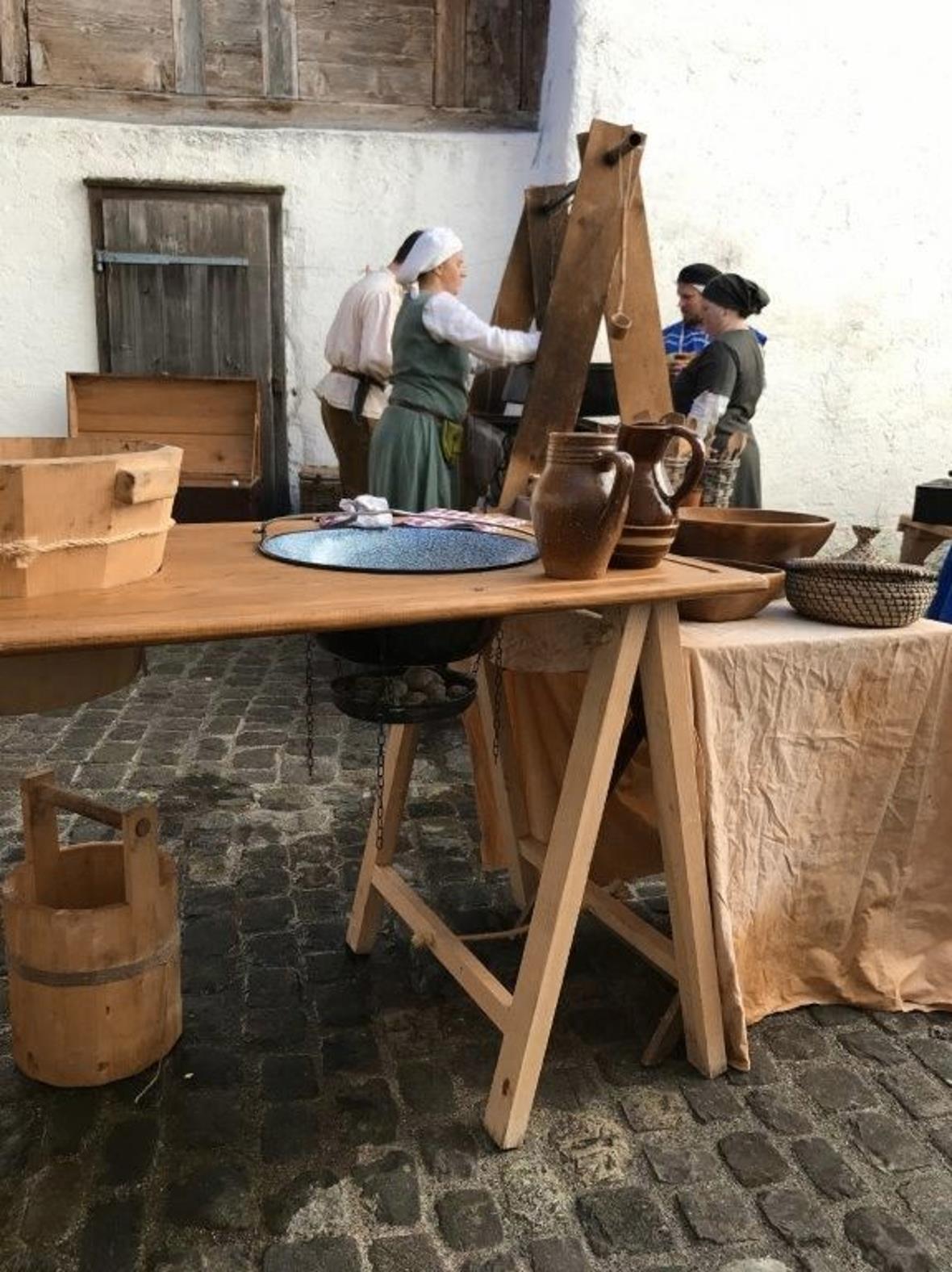 Spielerisch erfuhren die Besucher, viele Eltern mit ihren wissbegierigen Kindern, auch viel über das Mittelalter. Ziemlich oben im Schloss war eine offene Küche aufgebaut. Zwiebeln, Pilze, Lauch, Rüben und diverse Hülsenfrüchte wurden zu einem nahrhaften Muus gekocht. Es gab sogar eine Spüle zu sehen, die über stets warmes Wasser verfügen konnte, weil unter dem grossen emaillierten Becken eine zweite Ablage mit einem Gefäss war, gefüllt mit glühenden Kohlen. Dieses spendete die nötige Hitze. Das zeigt, dass die Leute damals schon sehr erfinderisch waren.