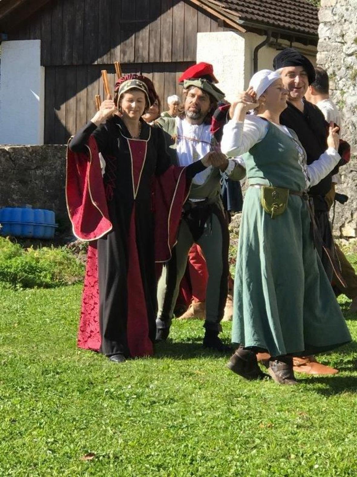 Unten im Hof wurden mittelalterliche Tänze vorgeführt. Natürlich alle Teilnehmer in entsprechend schönen Kleidern und passender Musik. Dazu mischte sich ein Bettler auch aus dieser Zeit unter die Leute. Seine Sprüche wurden stets lachend zur Kenntnis genommen.